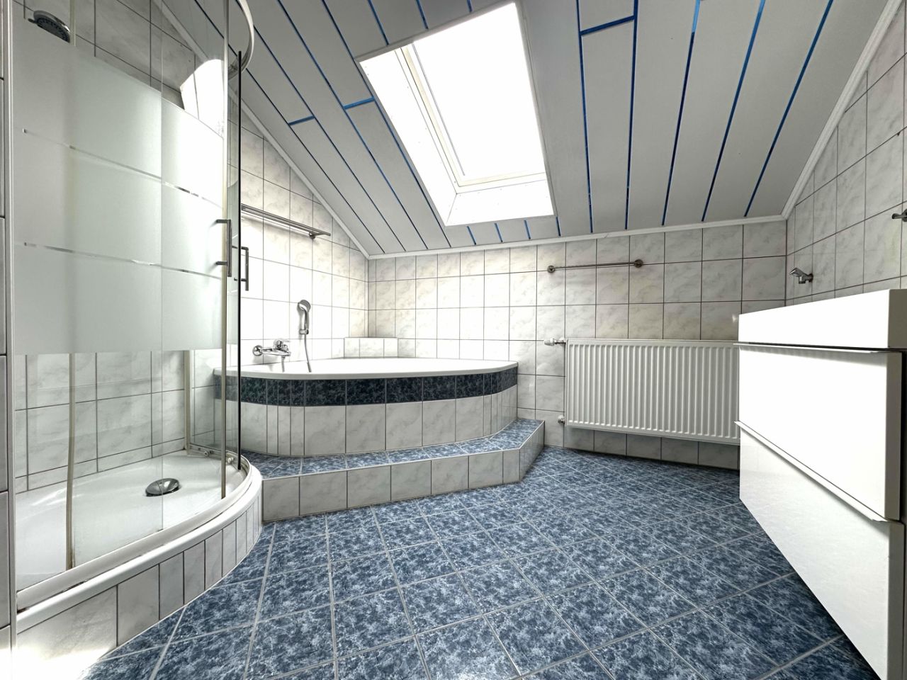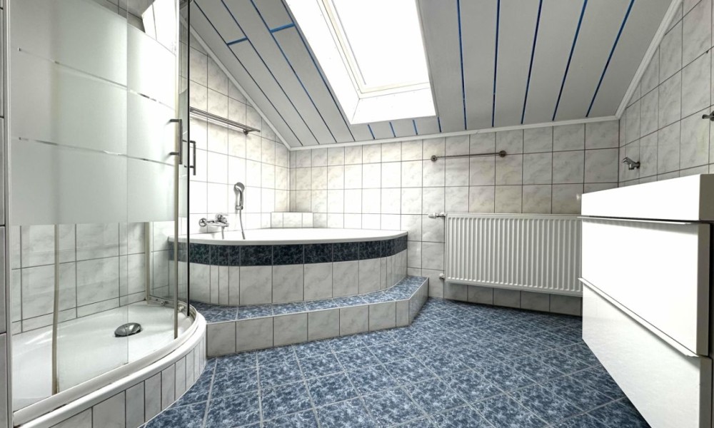 With a generous living space of 223 m² in total, the house offers a wide range of possible uses. The first floor has approx. 105 m² of living space, while the upper floor offers additional space with approx. 118 m² and a large balcony.
