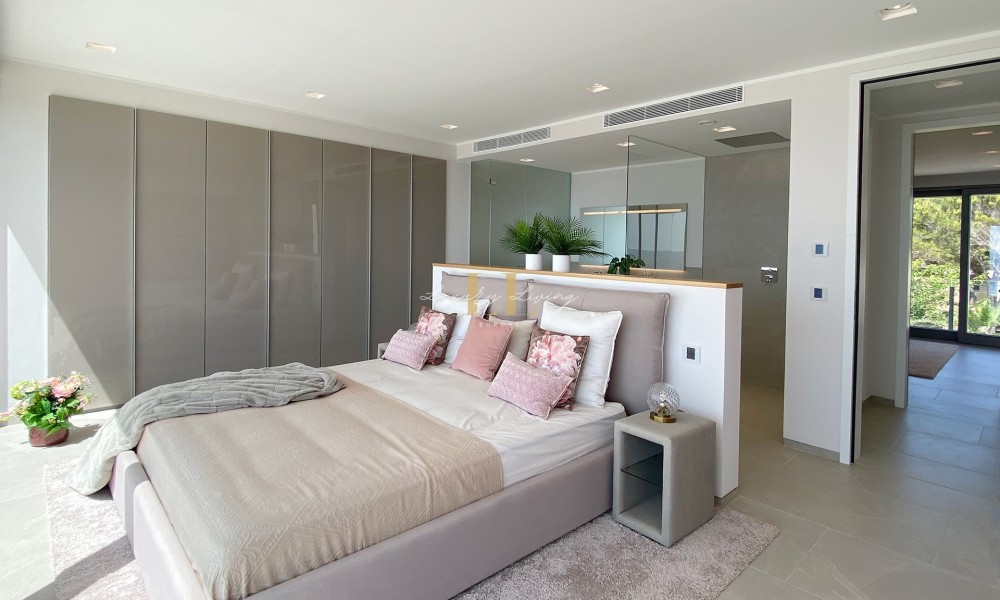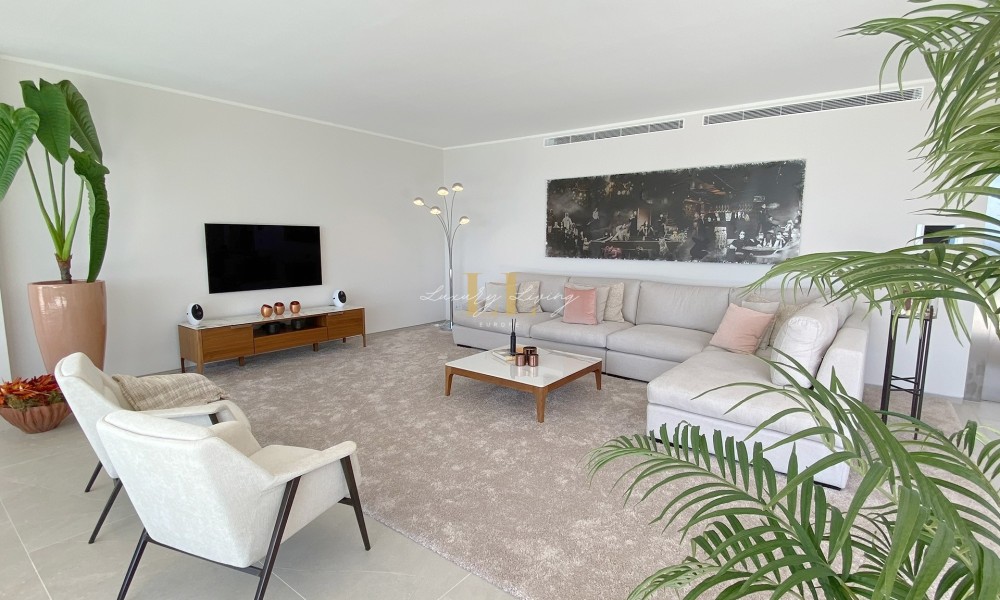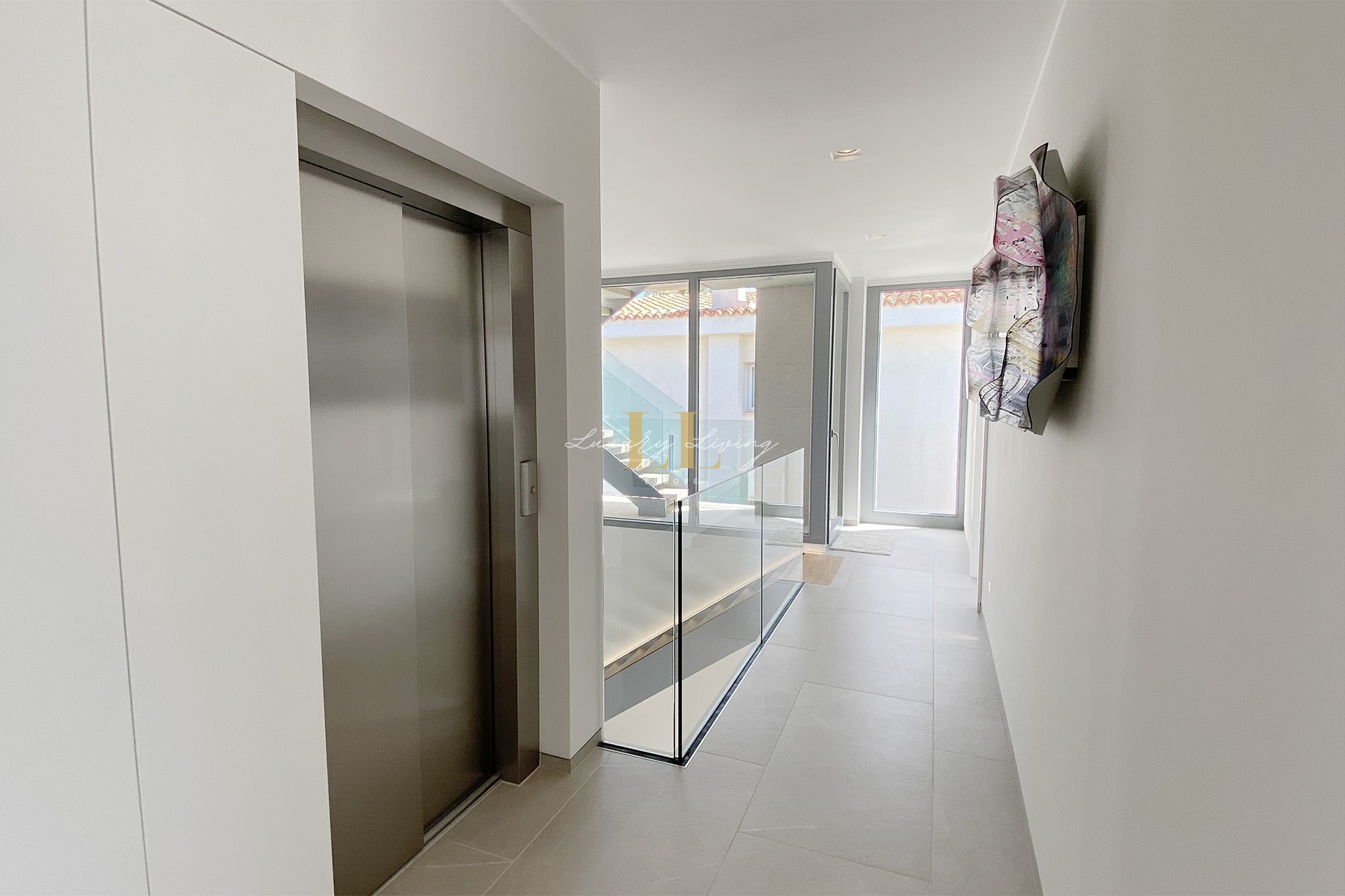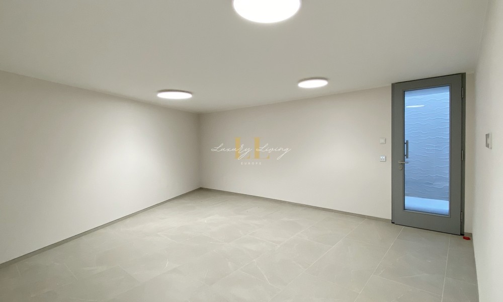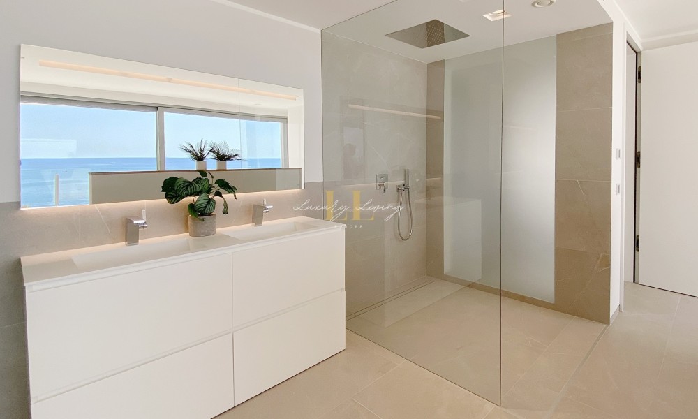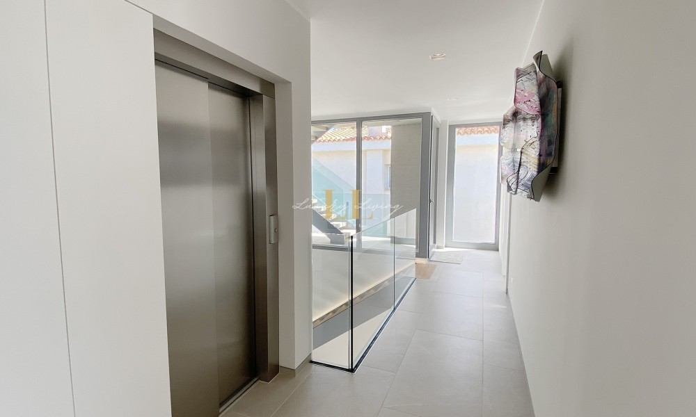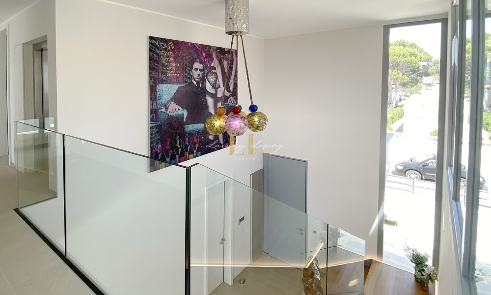 The architecture with large windows and high ceilings makes the interior of the villa shine bright and friendly. Generously sized open as well as covered terraces and the large pool with garden guarantee comfortable living together even with several people. On the ground floor there is an open-plan living-dining area with adjoining luxury fitted kitchen, a guest toilet and a utility room. You can reach all floors of this property with a lift. The upper floor extends to a total of 4 en suite bedrooms and is connected with a glazed staircase up to the roof terrace with a royal view of the Mediterranean Sea.