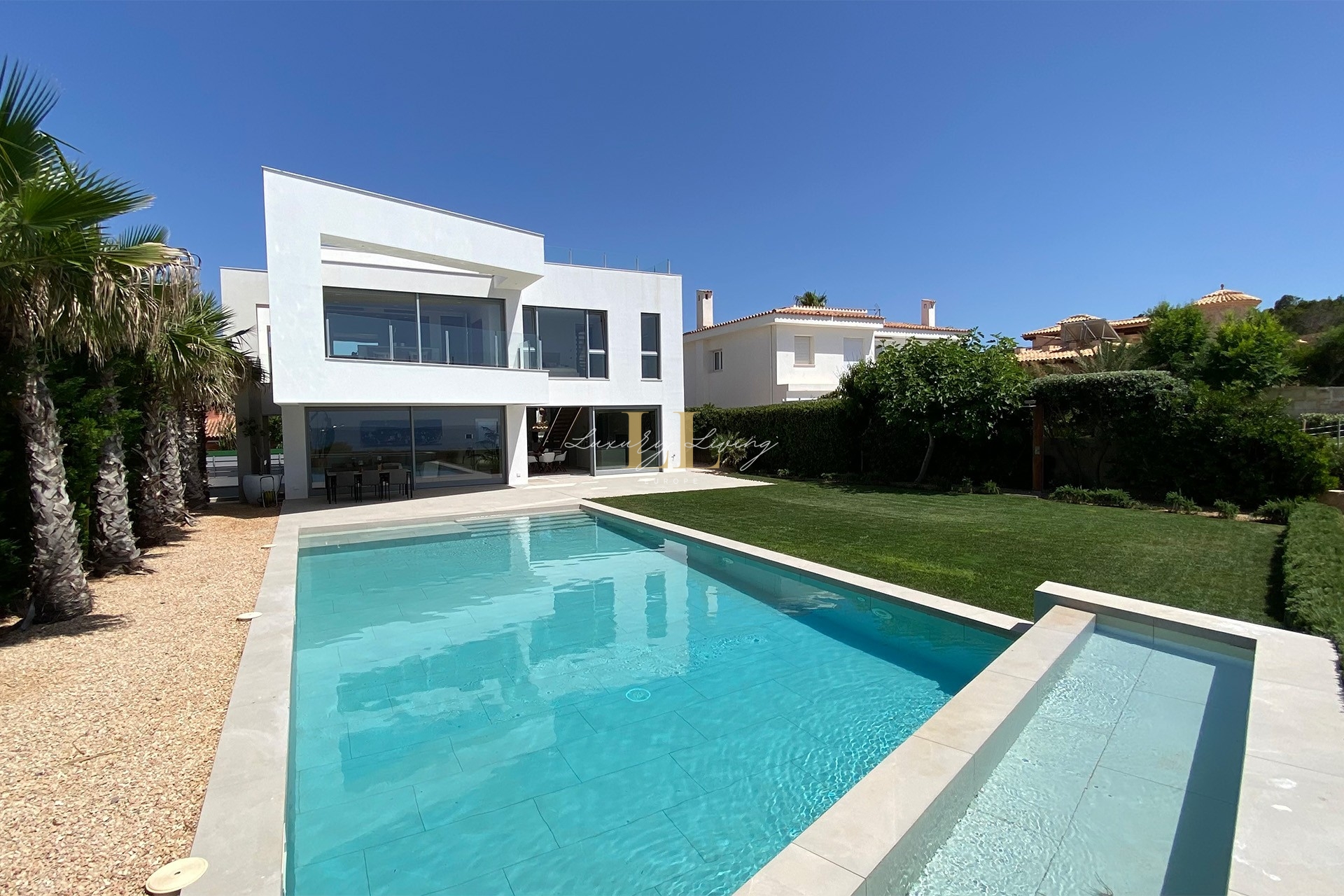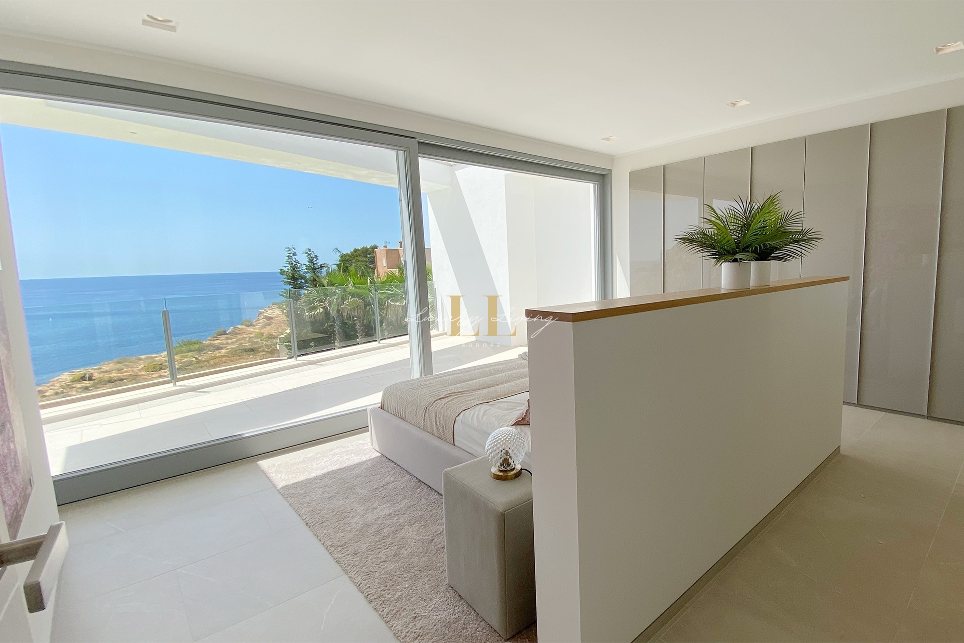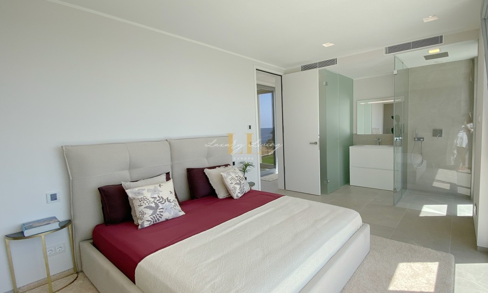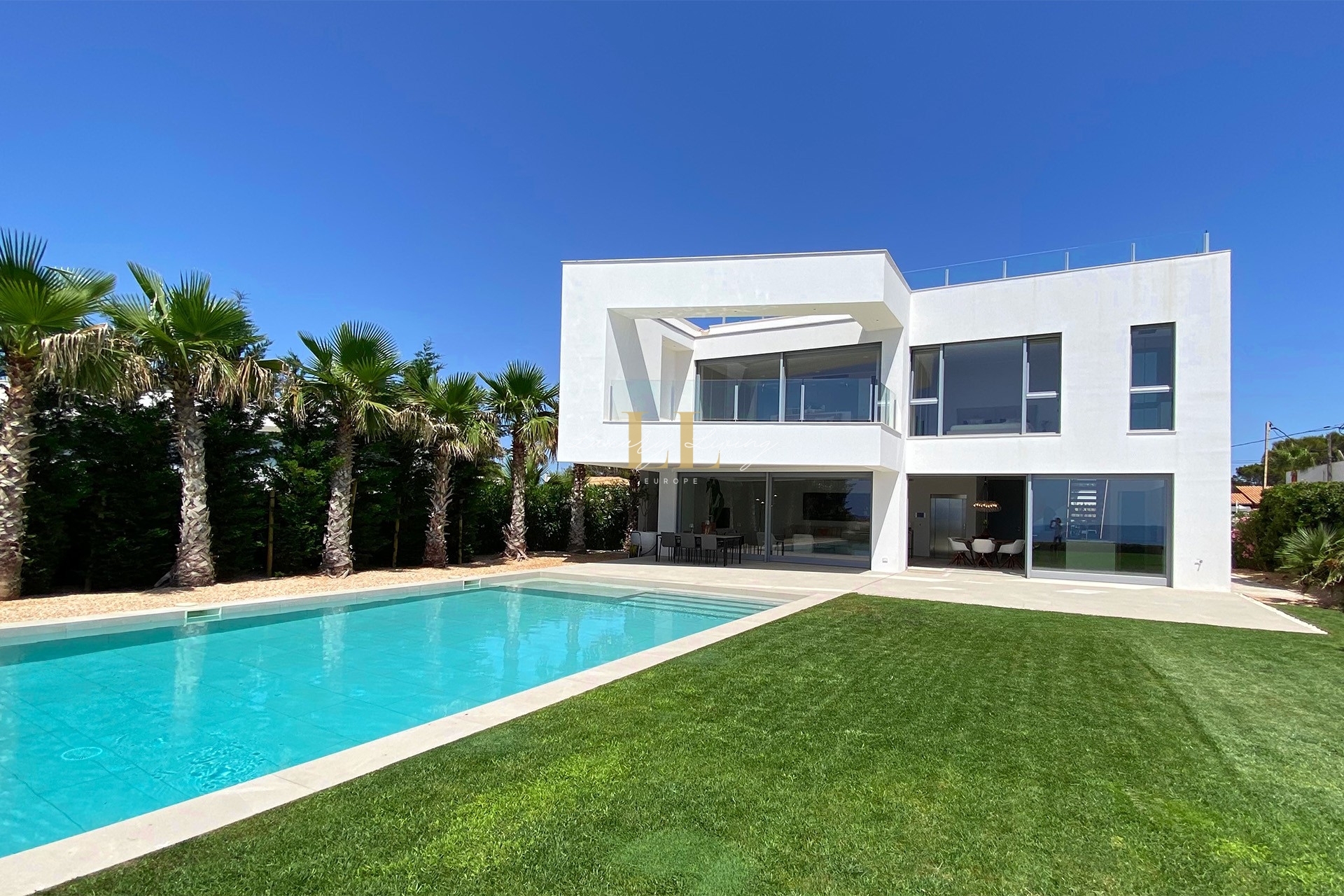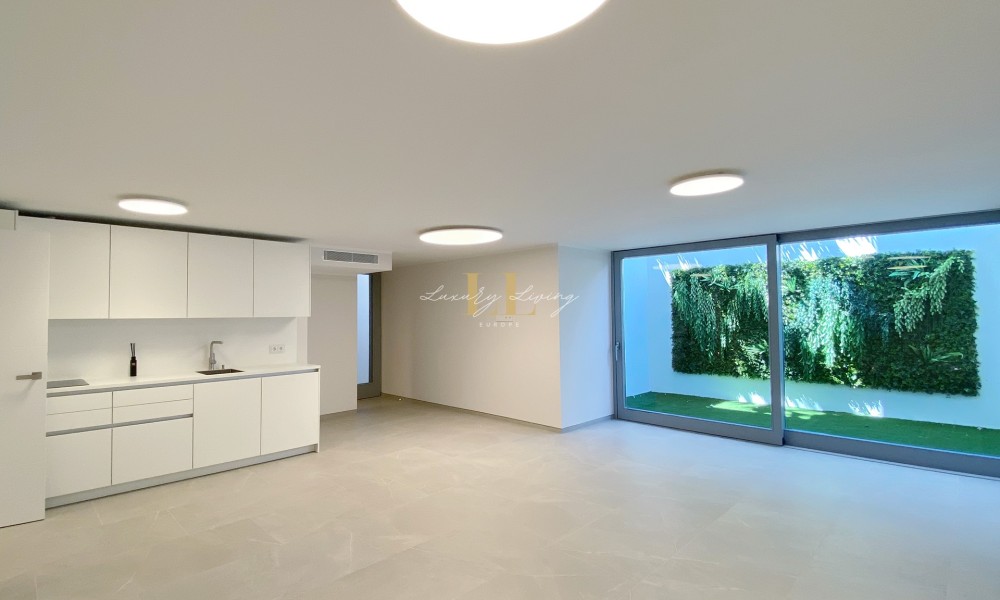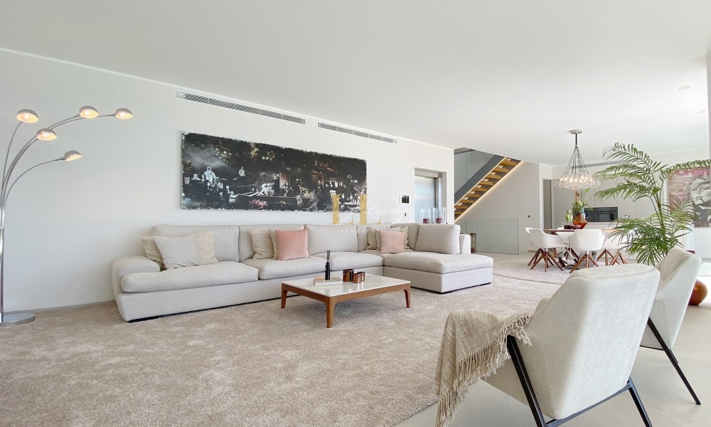 The architecture with large windows and high ceilings makes the interior of the villa shine bright and friendly. Generously sized open as well as covered terraces and the large pool with garden guarantee comfortable living together even with several people. On the ground floor there is an open-plan living-dining area with adjoining luxury fitted kitchen, a guest toilet and a utility room. You can reach all floors of this property with a lift. The upper floor extends to a total of 4 en suite bedrooms and is connected with a glazed staircase up to the roof terrace with a royal view of the Mediterranean Sea.