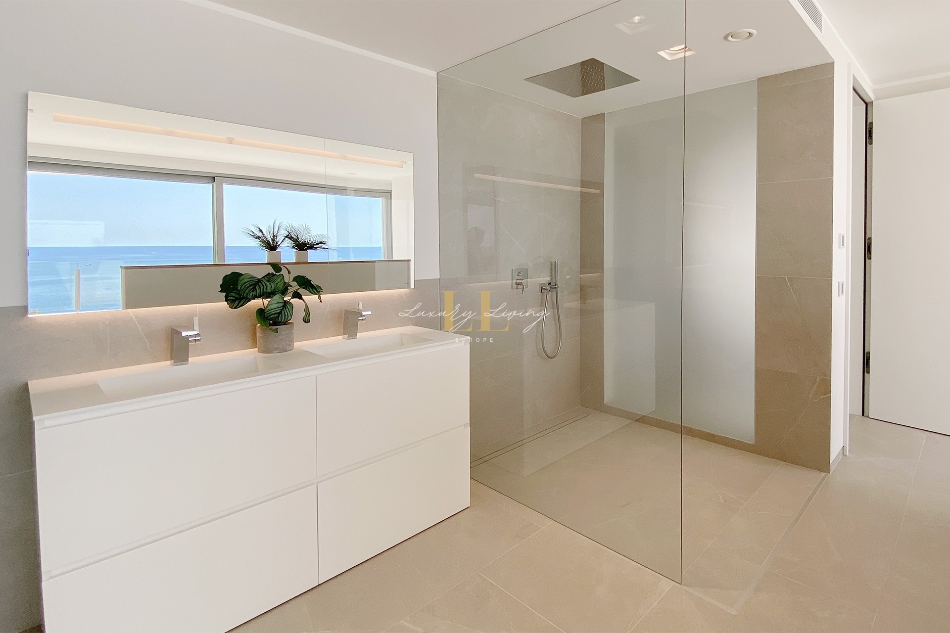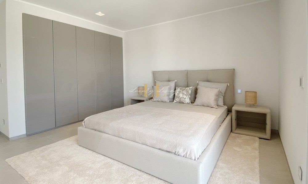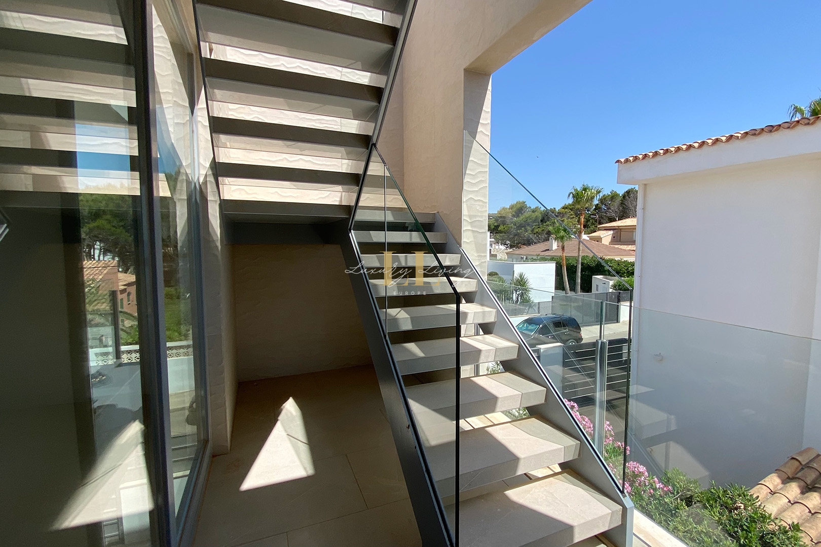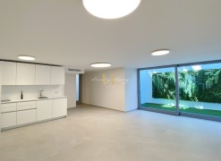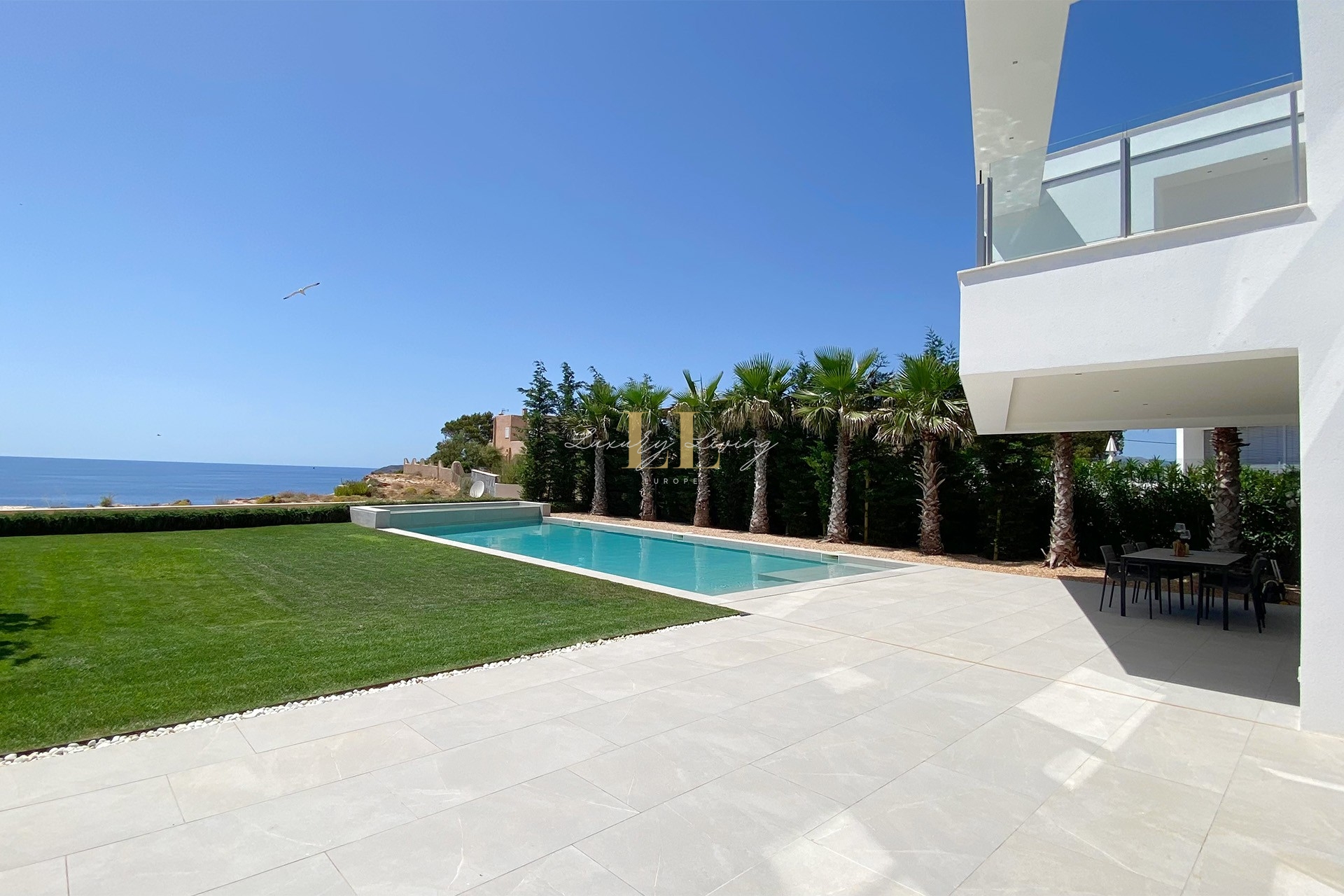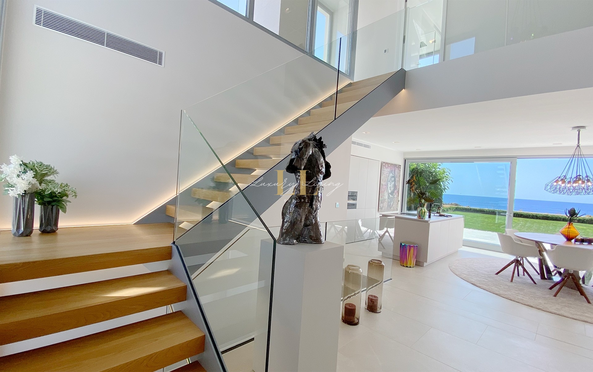 The architecture with large windows and high ceilings makes the interior of the villa shine bright and friendly. Generously sized open as well as covered terraces and the large pool with garden guarantee comfortable living together even with several people. On the ground floor there is an open-plan living-dining area with adjoining luxury fitted kitchen, a guest toilet and a utility room. You can reach all floors of this property with a lift. The upper floor extends to a total of 4 en suite bedrooms and is connected with a glazed staircase up to the roof terrace with a royal view of the Mediterranean Sea.