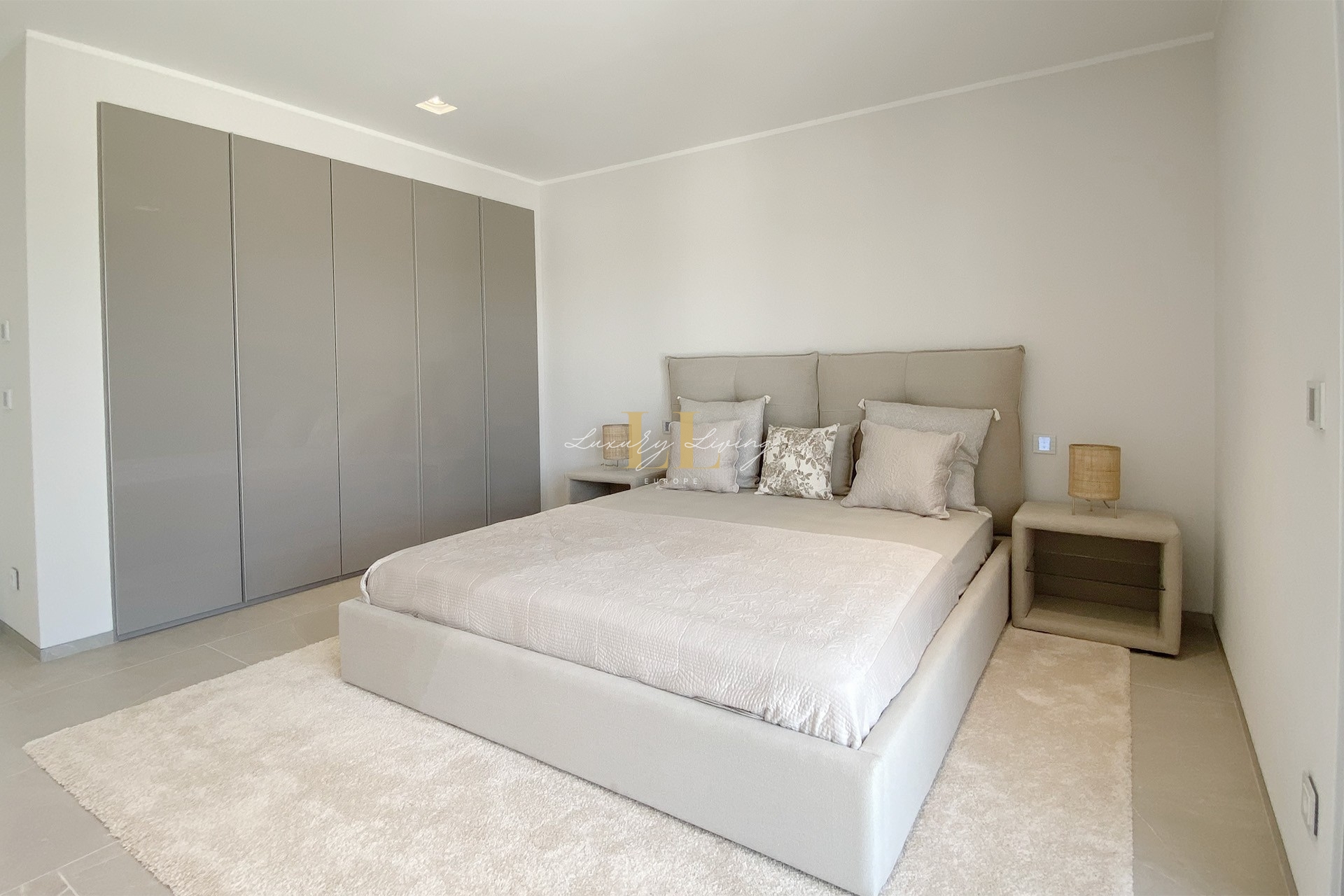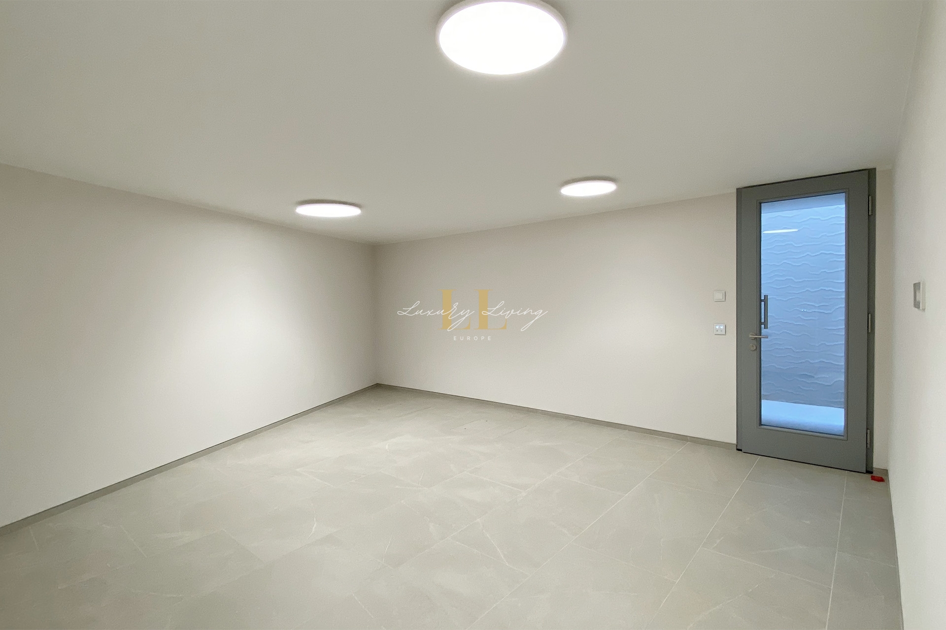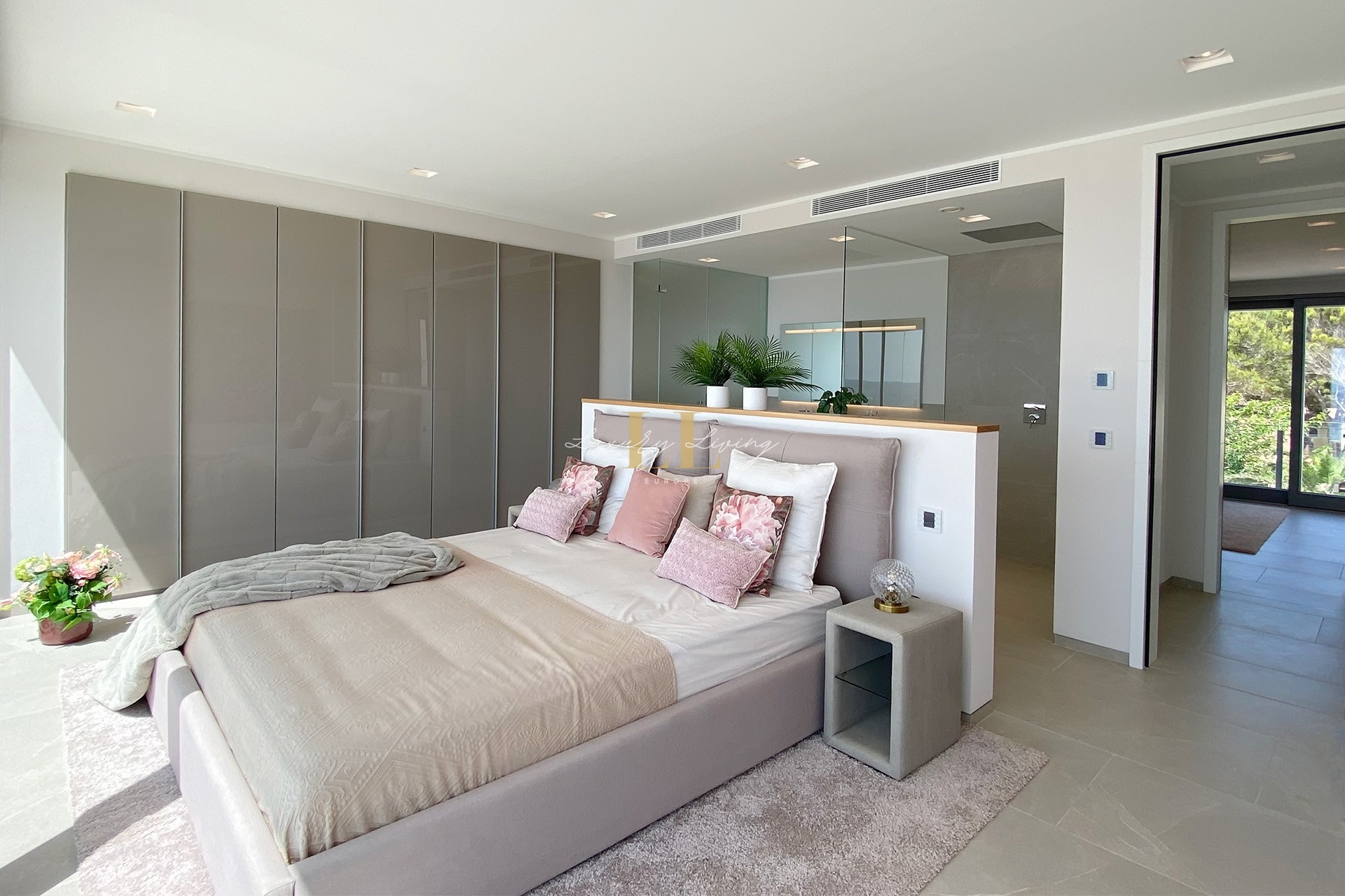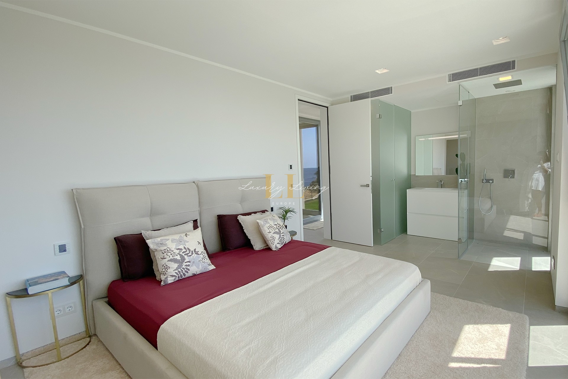 The architecture with large windows and high ceilings makes the interior of the villa shine bright and friendly. Generously sized open as well as covered terraces and the large pool with garden guarantee comfortable living together even with several people. On the ground floor there is an open-plan living-dining area with adjoining luxury fitted kitchen, a guest toilet and a utility room. You can reach all floors of this property with a lift. The upper floor extends to a total of 4 en suite bedrooms and is connected with a glazed staircase up to the roof terrace with a royal view of the Mediterranean Sea.