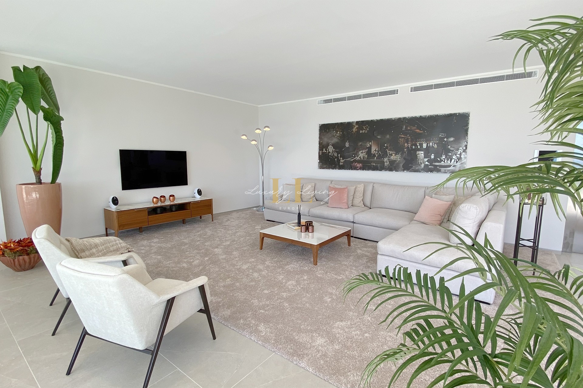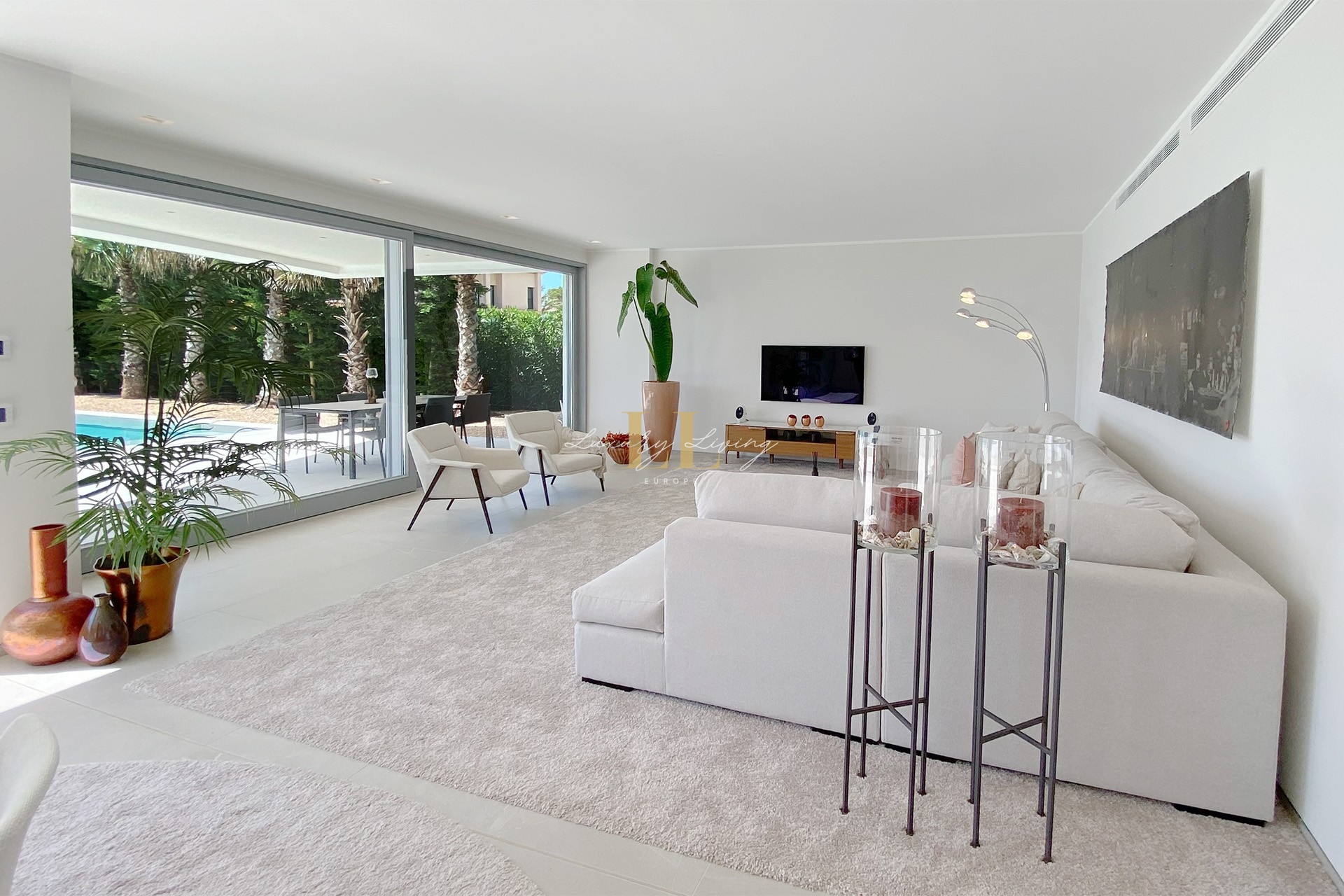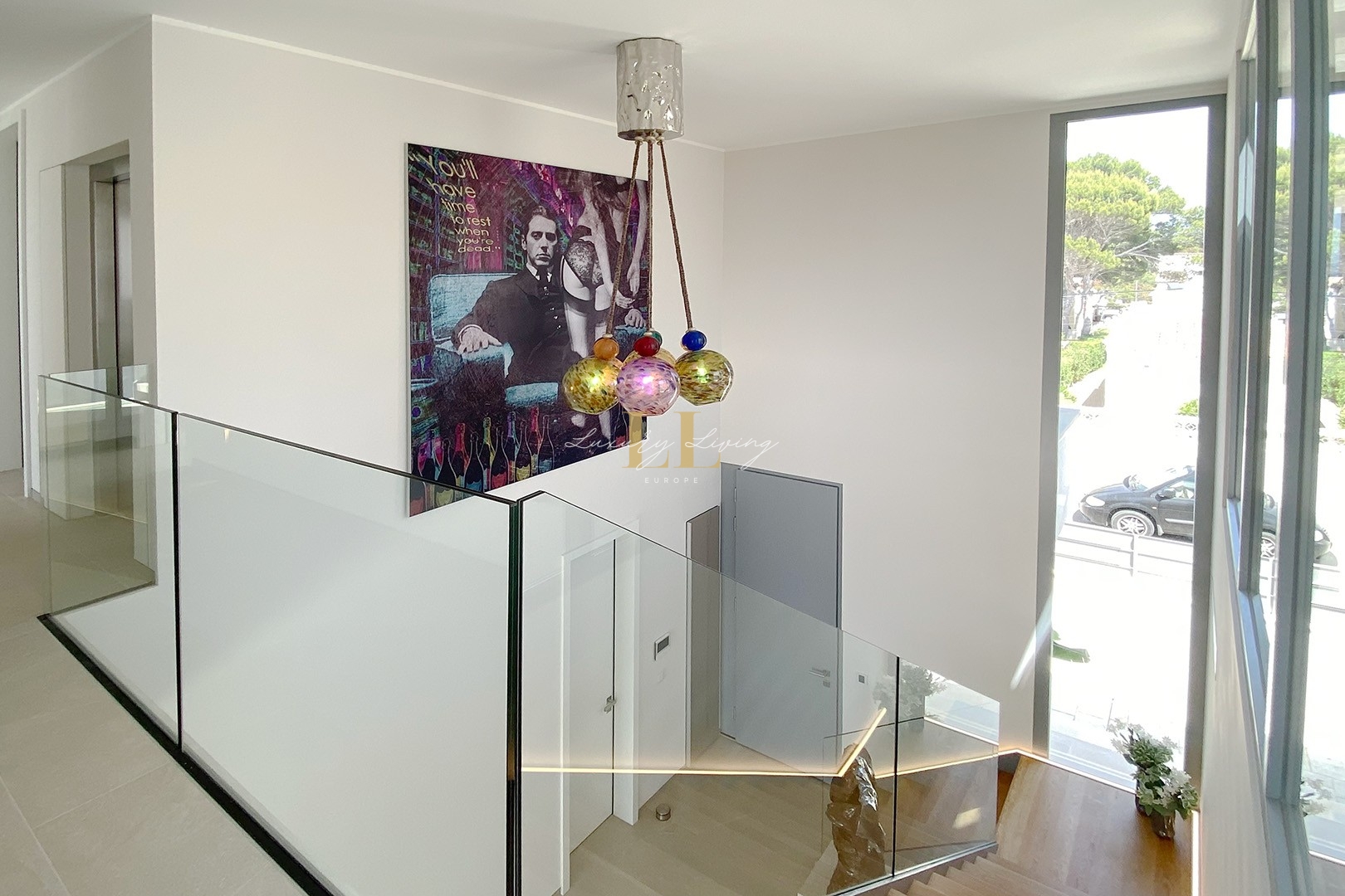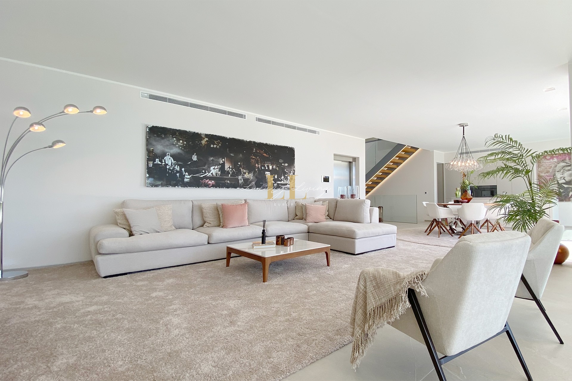 The architecture with large windows and high ceilings makes the interior of the villa shine bright and friendly. Generously sized open as well as covered terraces and the large pool with garden guarantee comfortable living together even with several people. On the ground floor there is an open-plan living-dining area with adjoining luxury fitted kitchen, a guest toilet and a utility room. You can reach all floors of this property with a lift. The upper floor extends to a total of 4 en suite bedrooms and is connected with a glazed staircase up to the roof terrace with a royal view of the Mediterranean Sea.