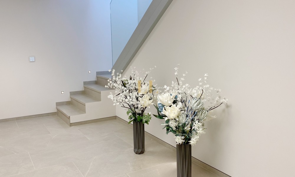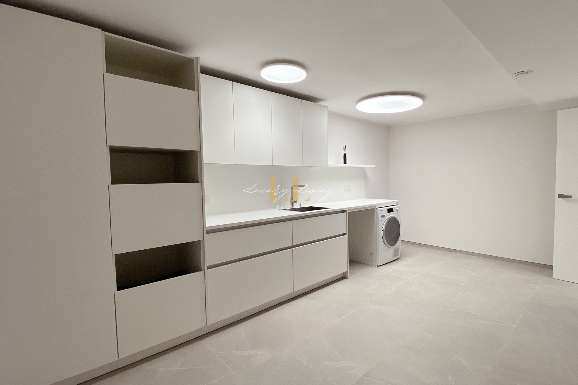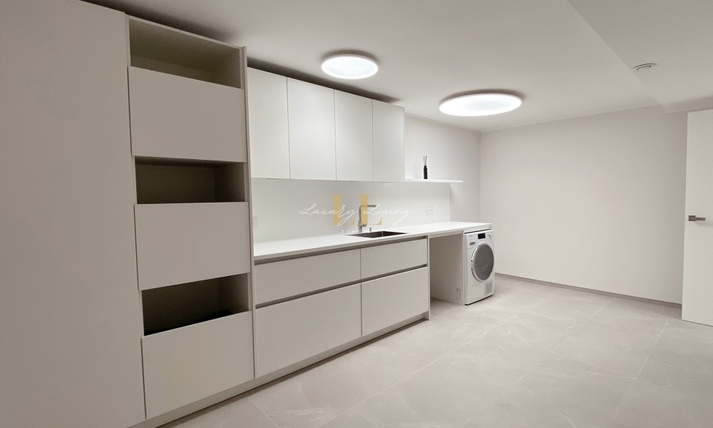 On the lowest floor you enter a large laundry room with fitted cupboards, technical room with storage space and an additional guest flat with kitchenette and bathroom.
