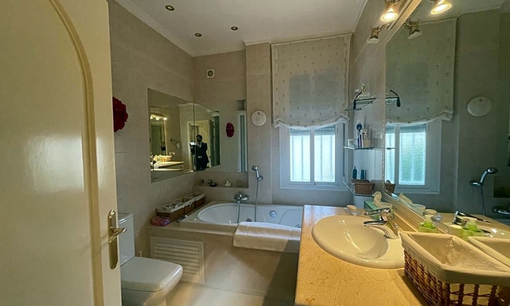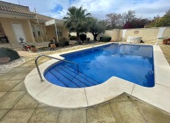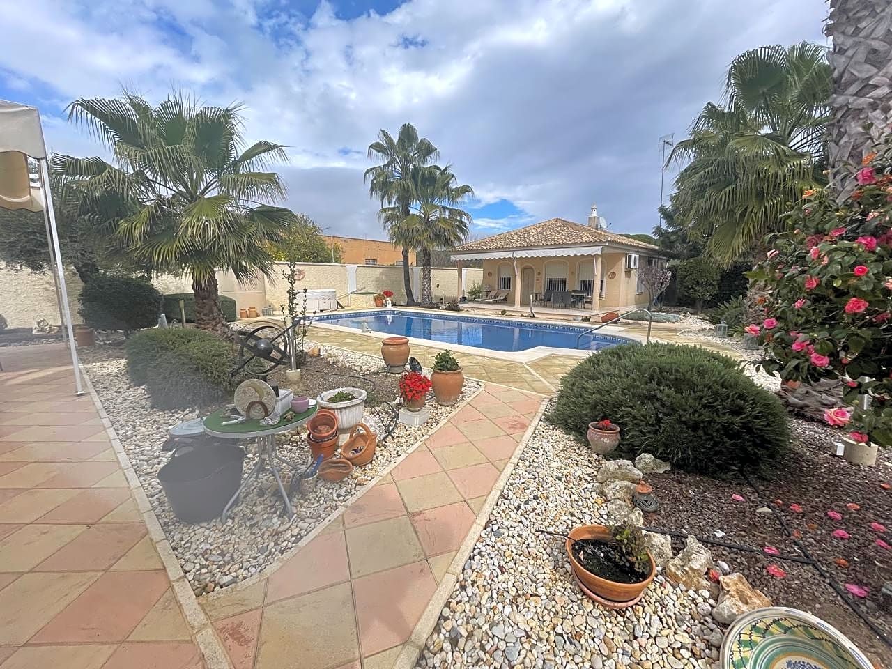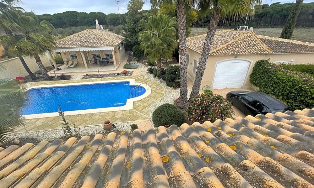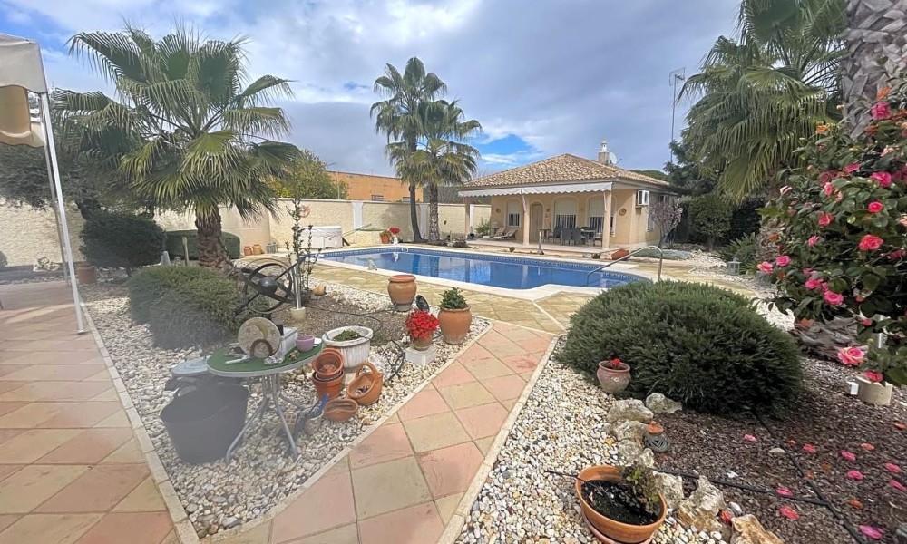 Beautiful villa made up of three individual Mediterranean-style houses located on a 1,585 m2 plot, the main house, the guest house and the service house, which can also be another guest house, a lifestyle house in Hinojos, Located in the Las Animas Urbanization, just a 10-minute walk from the town center. Urbanization Las Animas is a small community of Spanish, German, Dutch, French and other European clients, located in the Coto Doñana pre-park, in a very quiet area but at the same time close to all services, shops and a Magnificent quality of restaurants and bars, approximately twenty minutes from Seville airport, twenty-five from Matalascañas Beach and fifteen minutes from Coto Doñana and El Rocio.FIRST HOUSE: We will talk about the “MAIN HOUSE WITH FIREPLACE”. This and the other villas were built in 2003 with very high quality, perfect distribution and large spaces in all parts of the house. It has an entrance hall, dining room, two bedrooms and two full bathrooms, one of them with a Jacuzzi cabin. A true family home with all the charms, where everyone will be delighted to live. At the Hall level of the house we have an elegant, simple, bright entrance, giving way to the magnificently sized living room giving access to the bedroom area through a short corridor and the bathrooms. A beautiful kitchen on the right side with a laundry room – pantry leading to the double terrace, of majestic dimensions with views of the garden, pool and an outdoor toilet with separate shower and Jacuzzi that will delight any time of the year with its water. hot. The whole house has independent Air Conditioning in two wings of the house to be put to the interest of the owner. It also has all the parts Calor for high quality radiators.SECOND HOUSE: The “CHAMING GUEST HOUSE”.