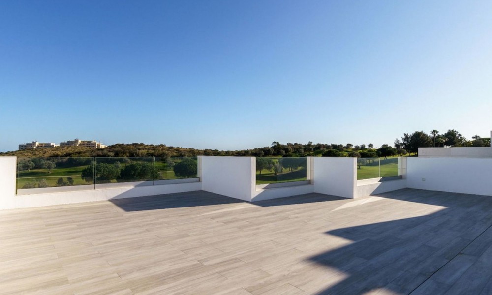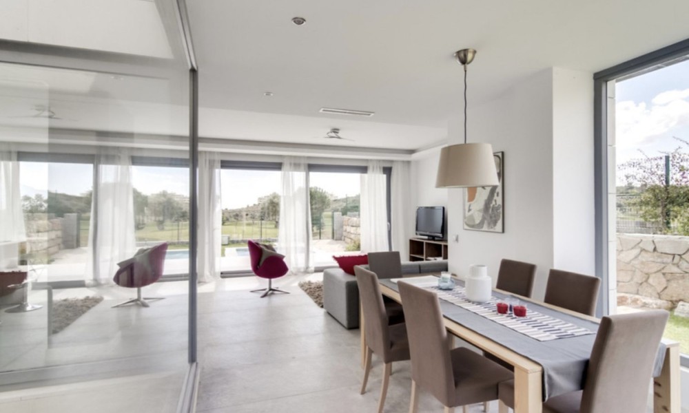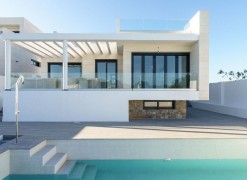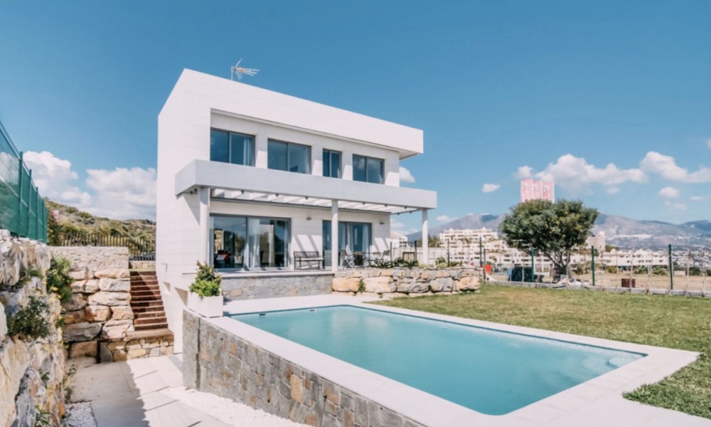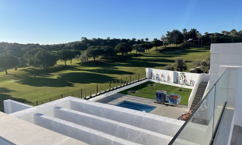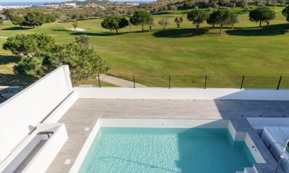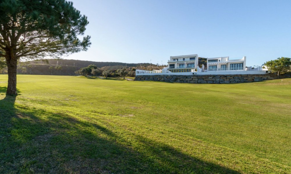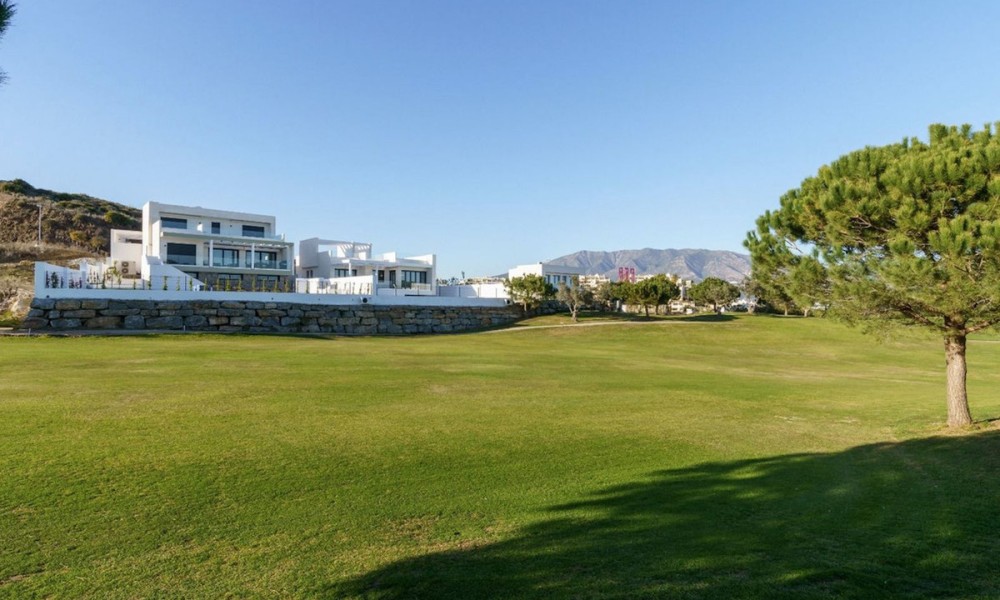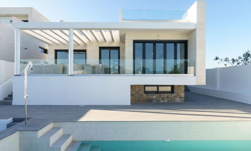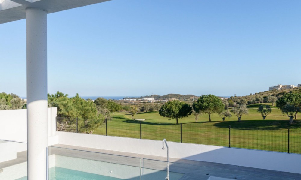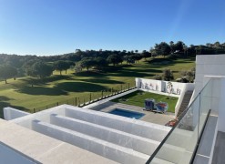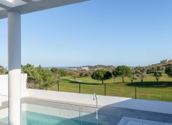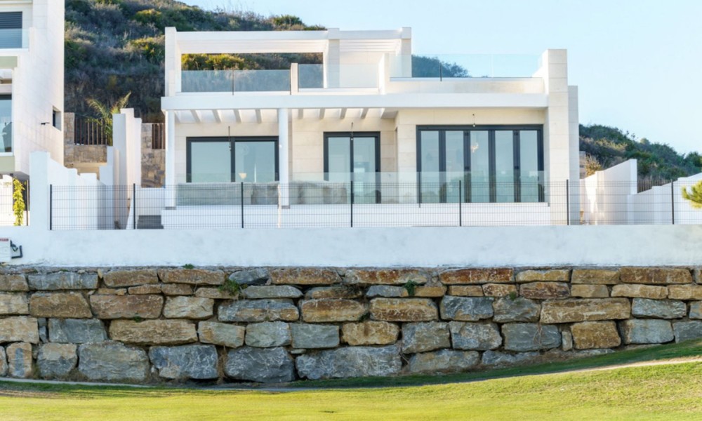 A staircase takes you to the first floor, where you find the master bedroom with private dressing room, bathroom and a unique exterior private shower. On this floor are two further bedrooms and one bathroom. On the lower floor you find private parking for one golf buggy, the machinery room, a huge storage room, a toilet and a private patio. These stunning properties have some great features including a ventilated facade with natural stone, LED lighting in kitchen and bathrooms, a fireplace in lounge, marble flooring on the ground floor and wooden floors upstairs, top quality Roca fittings in bathrooms, central heating and air conditioning, electric water heater with solar panel support, video intercom and security entrance door, with optional extras including a home automation system to control access, lighting, blinds, villa temperature, air quality, security and supplies such as water, electricity or gas.Breathtaking properties in an equally breathtaking location!