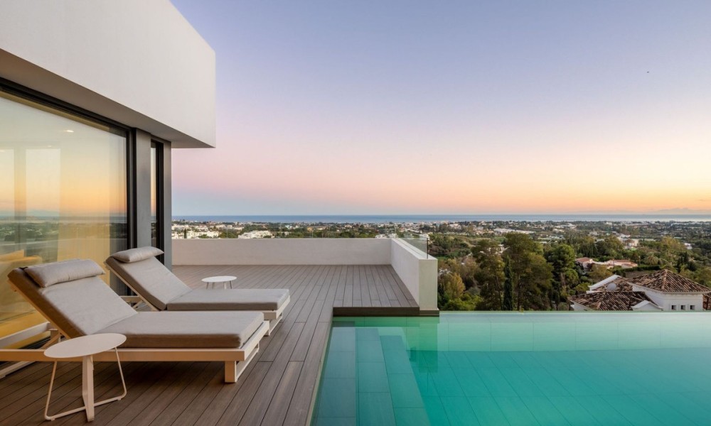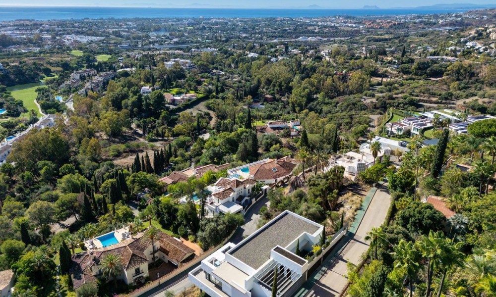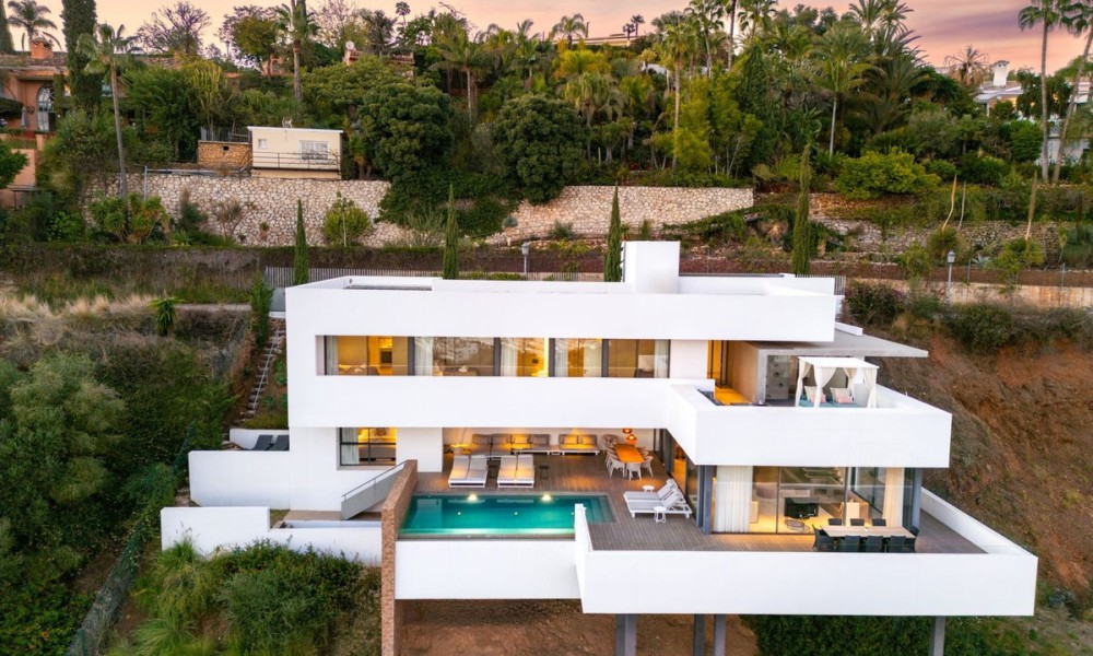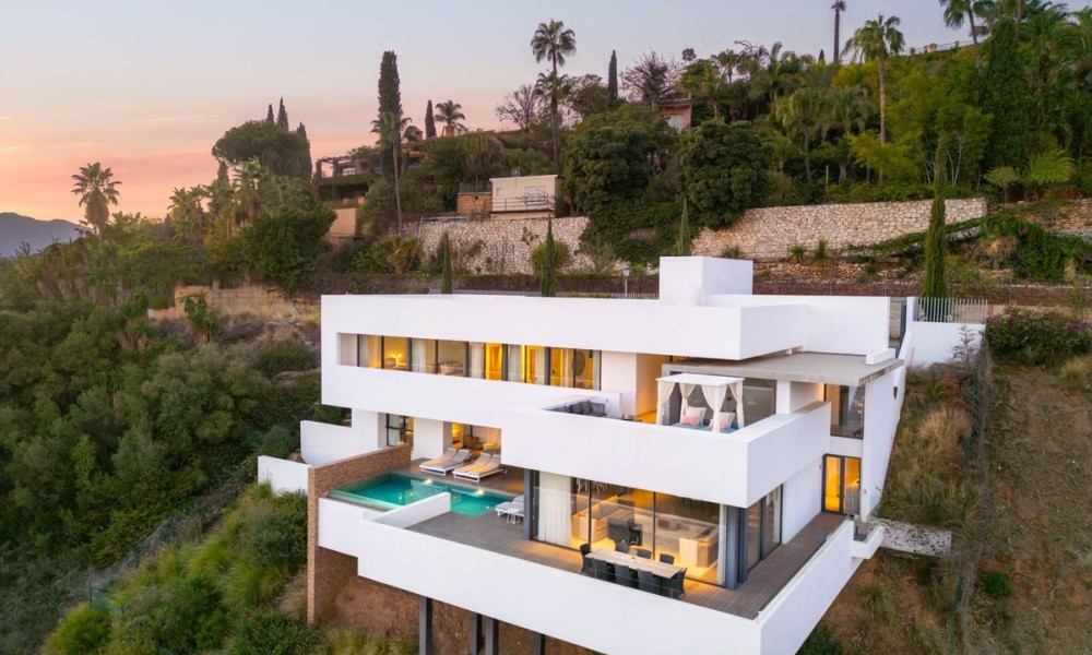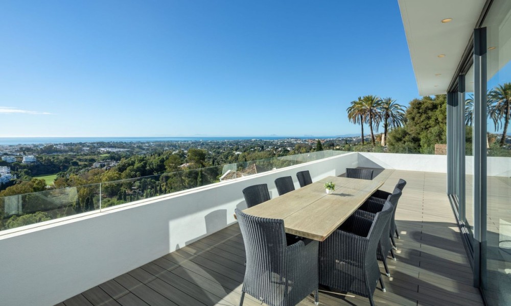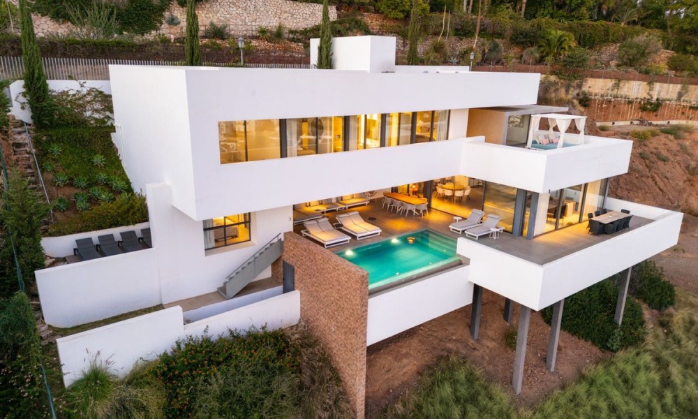 Spectacular Modern villa with a prime location in the gated community of El Herrojo Alto in La Quinta. This property benefits from an elevated position, providing stunning panoramic sea views from all levels of the villa, as well as views of the entire coastline, all the way to Gibraltar and North African coast. The expansive terrace allows for a private pool for all year round enjoyment, as well as chill-out areas and al-fresco dining. The interior offers a stunning open-plan layout, allowing for a seamless flow between living spaces.