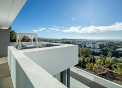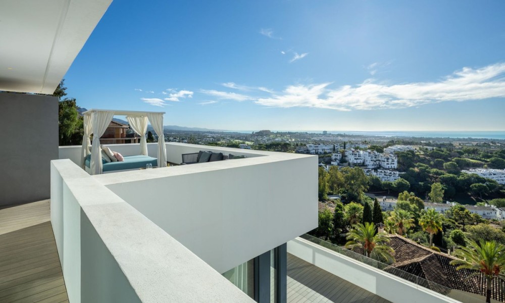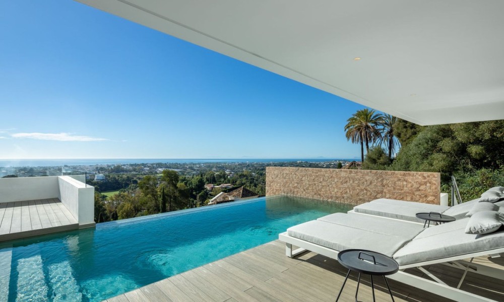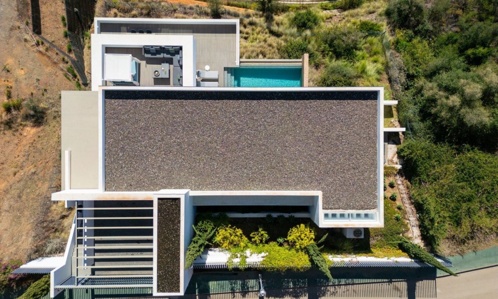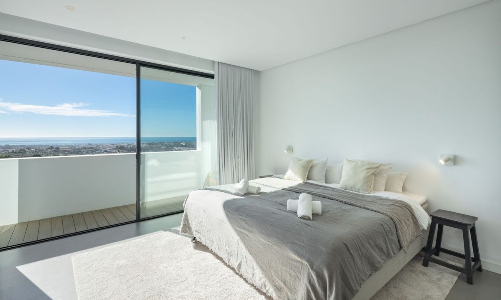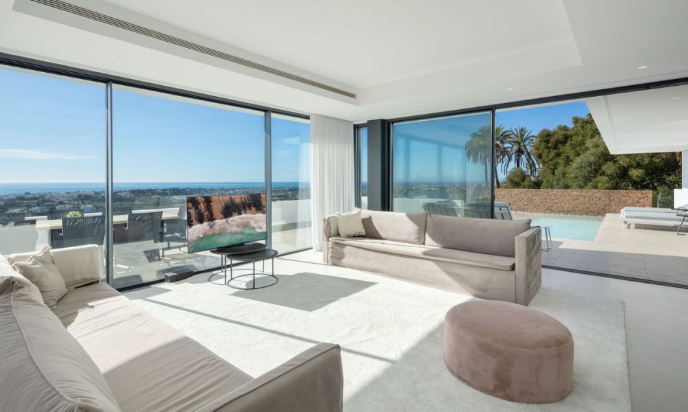 Spectacular Modern villa with a prime location in the gated community of El Herrojo Alto in La Quinta. This property benefits from an elevated position, providing stunning panoramic sea views from all levels of the villa, as well as views of the entire coastline, all the way to Gibraltar and North African coast. The expansive terrace allows for a private pool for all year round enjoyment, as well as chill-out areas and al-fresco dining. The interior offers a stunning open-plan layout, allowing for a seamless flow between living spaces.