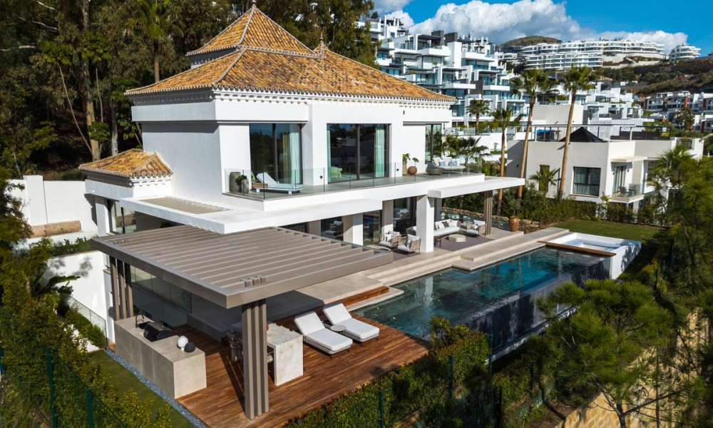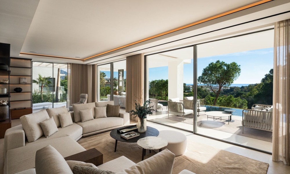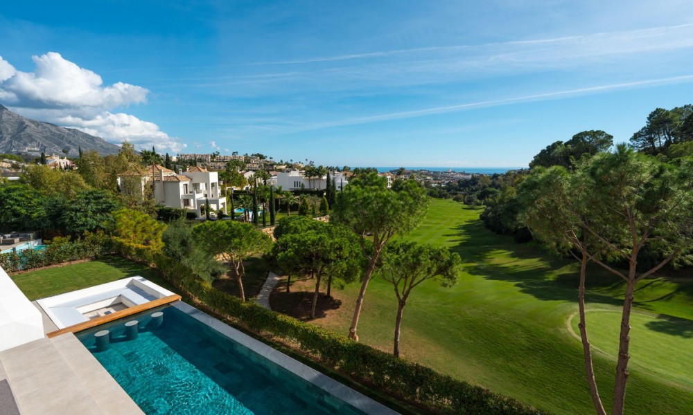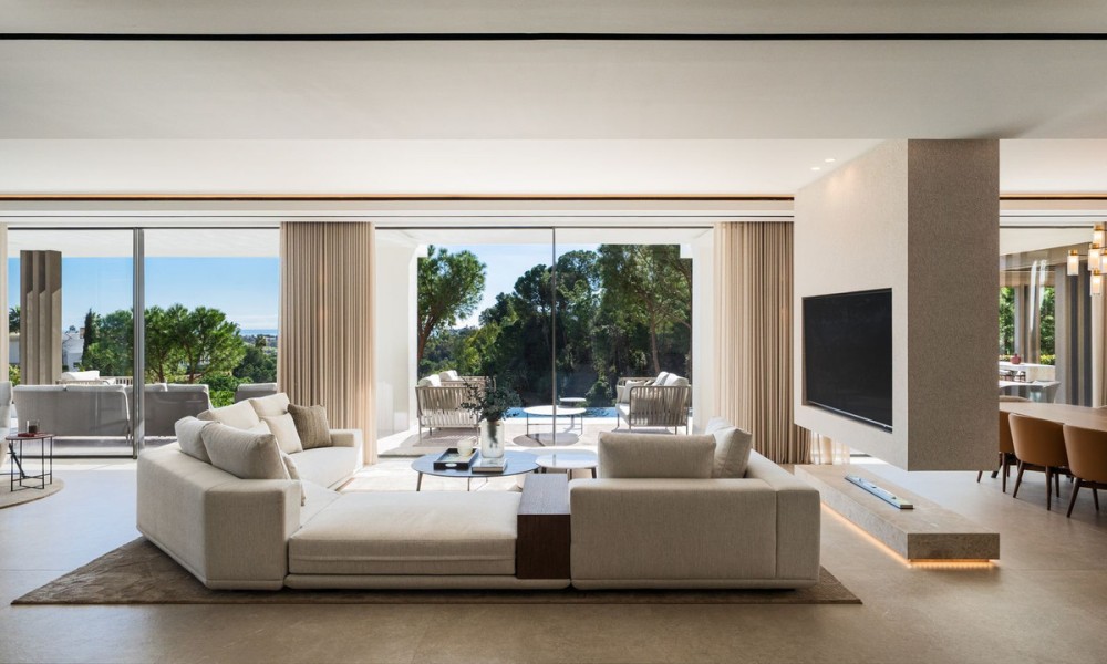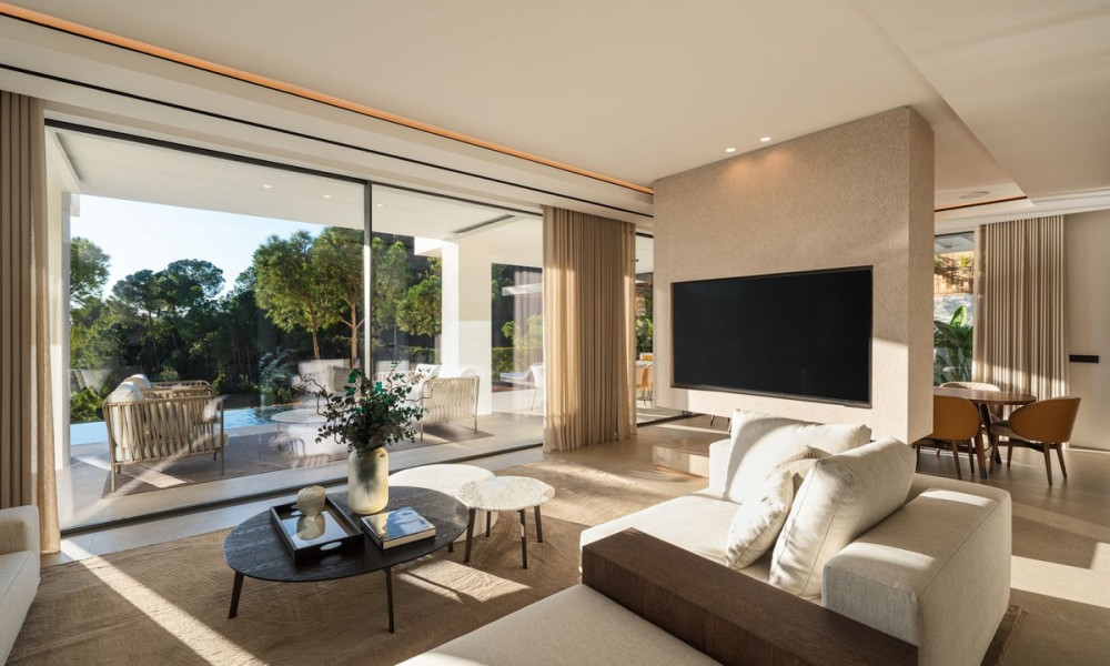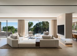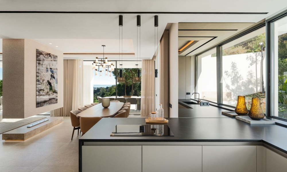 This frontline golf residence in La Quinta, Benahavís occupies an elevated 1,009 m² plot with 771 m² of meticulously executed interiors and 225 m² of terraces, combining architectural precision with panoramic views of the golf course and the Mediterranean beyond . The design is defined by clean lines, symmetry and expansive glazing, creating a seamless dialogue between interior sophistication and the surrounding landscape.The layout is distributed over multiple levels, centred around a bright open-plan living and dining area where large sliding panels retract fully to connect the interior with the main terrace. Aalto Exclusive Design interiors introduce natural tones, bespoke wood detailing and integrated lighting, delivering a refined yet functional atmosphere. The sleek kitchen features premium appliances, generous preparation space and direct access to outdoor dining areas, making the main floor ideal for both daily living and entertaining.The principal suite enjoys private upper-level terrace access and uninterrupted views, complemented by a spa-style bathroom and custom wardrobes. Five additional bedrooms, all en suite, are designed with the same attention to material quality and comfort, ensuring privacy for family and guests. Guest toilets on the main level enhance practicality when hosting.Entertainment and lifestyle facilities are concentrated on the lower level, where a custom-designed lounge with full bar provides an elegant social setting.