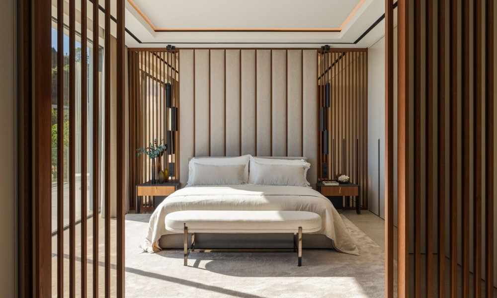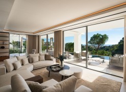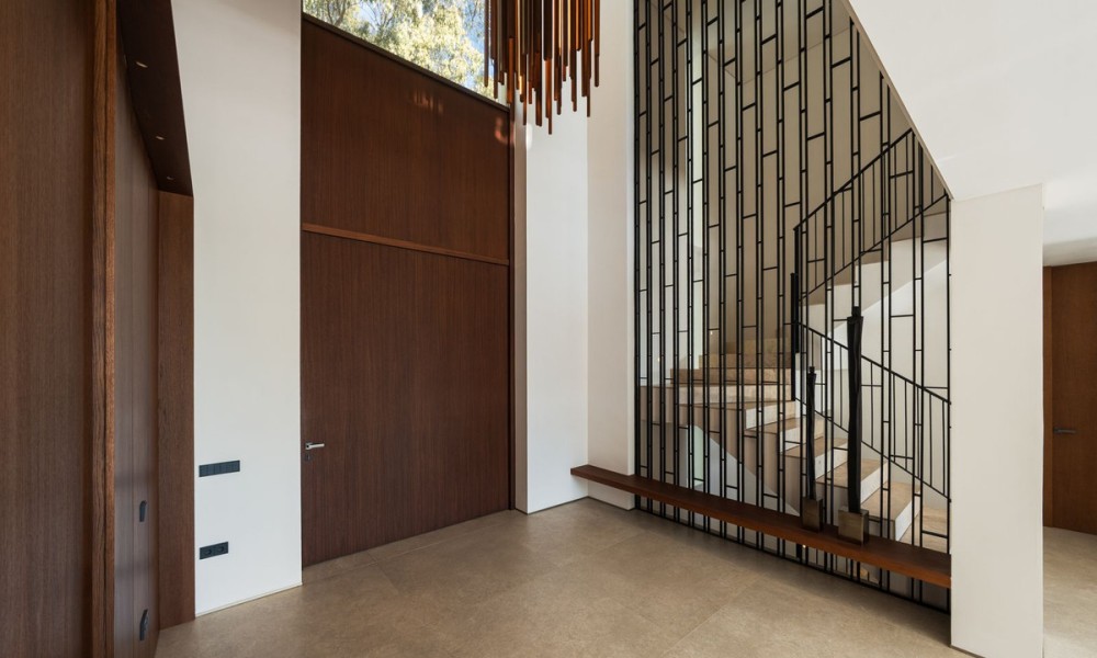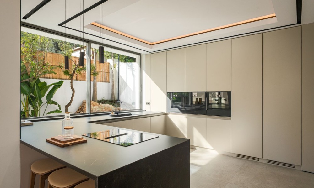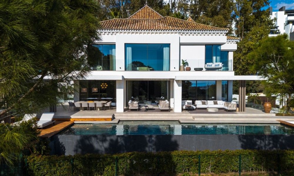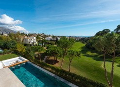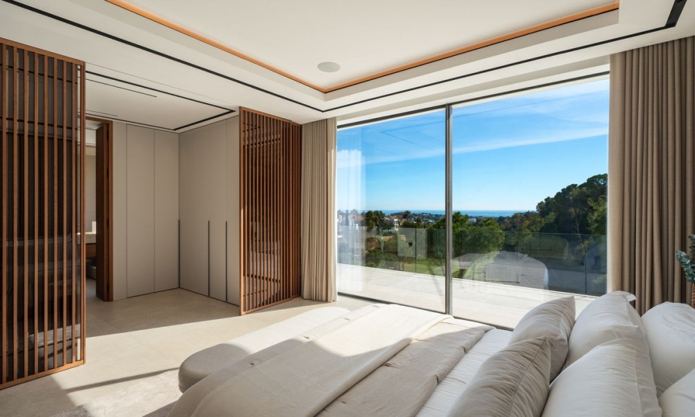 This frontline golf residence in La Quinta, Benahavís occupies an elevated 1,009 m² plot with 771 m² of meticulously executed interiors and 225 m² of terraces, combining architectural precision with panoramic views of the golf course and the Mediterranean beyond . The design is defined by clean lines, symmetry and expansive glazing, creating a seamless dialogue between interior sophistication and the surrounding landscape.The layout is distributed over multiple levels, centred around a bright open-plan living and dining area where large sliding panels retract fully to connect the interior with the main terrace. Aalto Exclusive Design interiors introduce natural tones, bespoke wood detailing and integrated lighting, delivering a refined yet functional atmosphere. The sleek kitchen features premium appliances, generous preparation space and direct access to outdoor dining areas, making the main floor ideal for both daily living and entertaining.The principal suite enjoys private upper-level terrace access and uninterrupted views, complemented by a spa-style bathroom and custom wardrobes. Five additional bedrooms, all en suite, are designed with the same attention to material quality and comfort, ensuring privacy for family and guests. Guest toilets on the main level enhance practicality when hosting.Entertainment and lifestyle facilities are concentrated on the lower level, where a custom-designed lounge with full bar provides an elegant social setting.