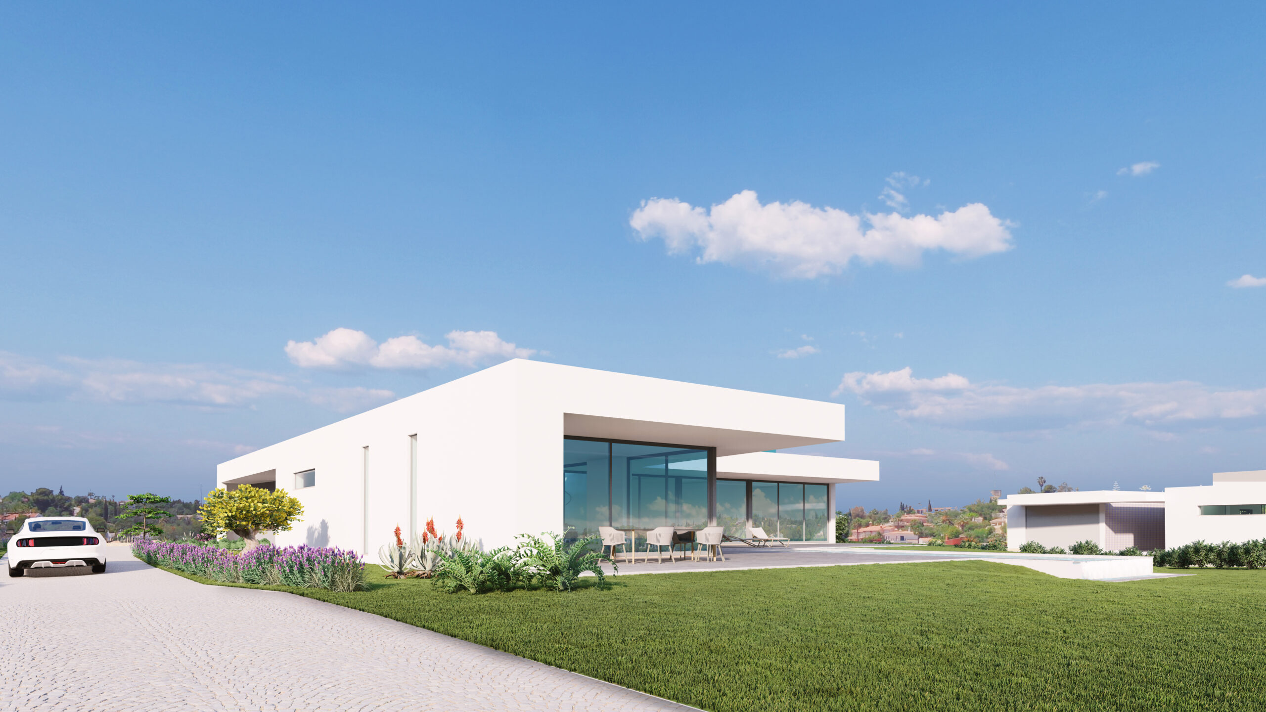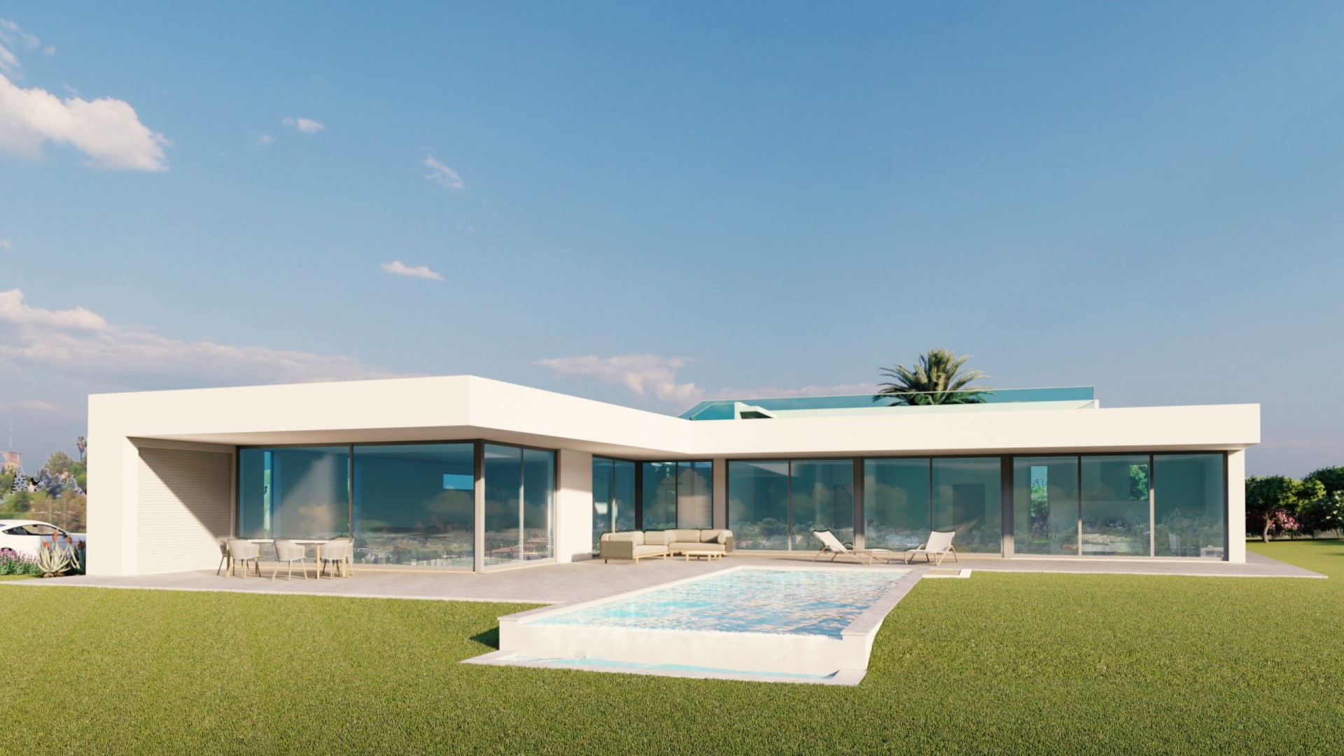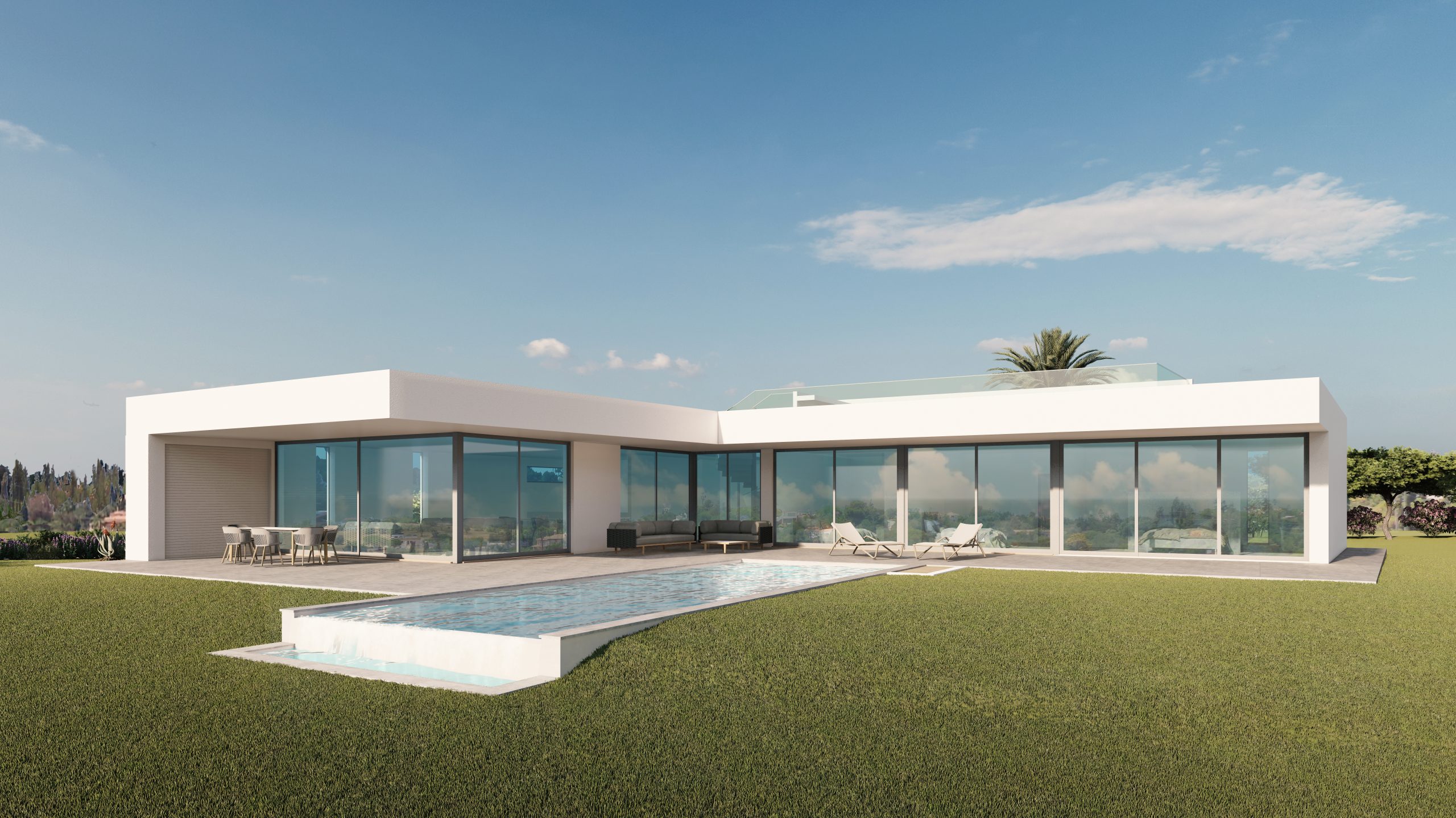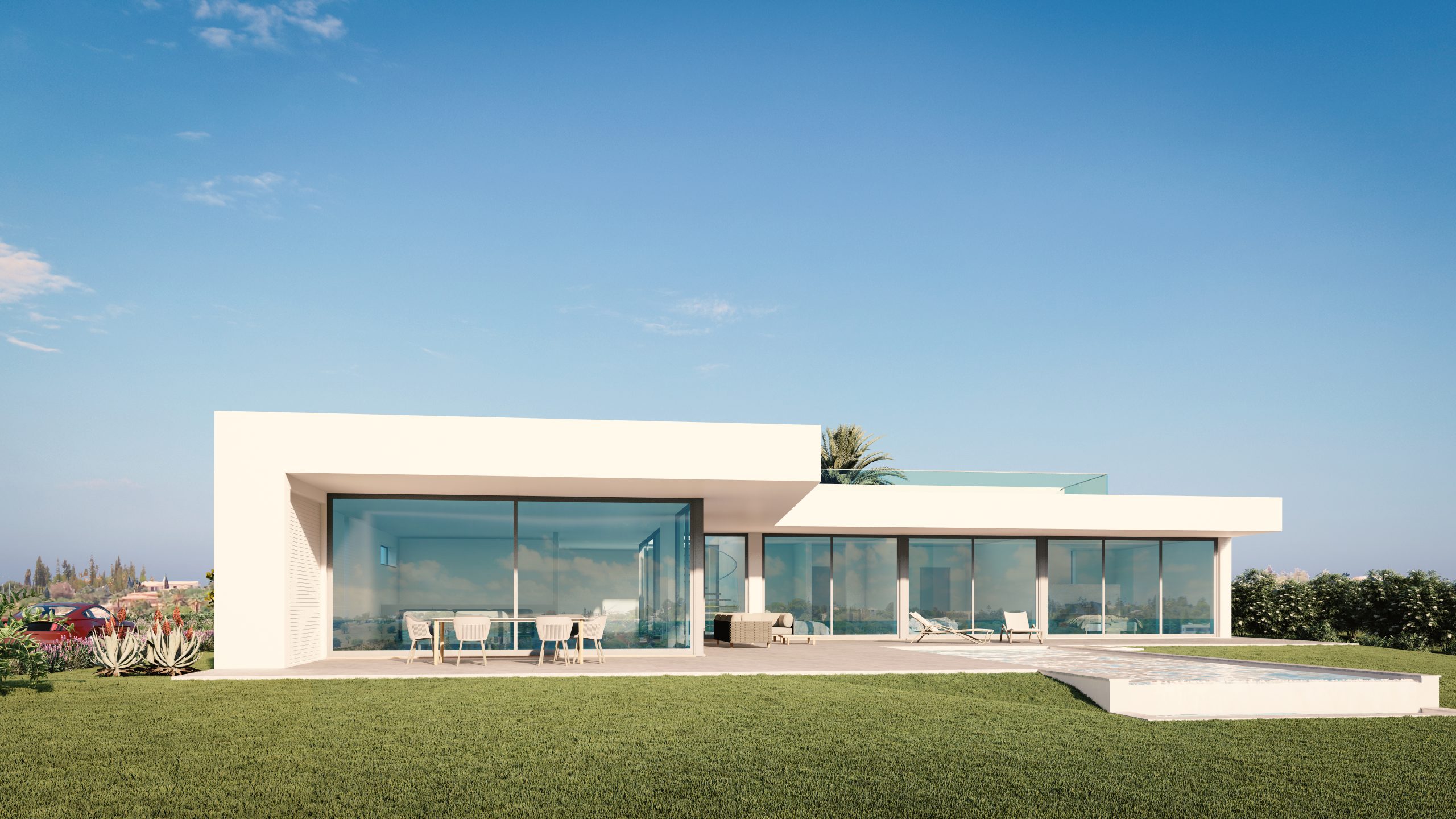 Three double bedrooms offer private en suites, again designed with lots of glass to offer a spacious flow.Further features include a garage, carport, landscaped garden and all the modern conveniences one would expect.Options of a roof terrace, basement, wine cellar, sauna, etc can easily be incorporated.