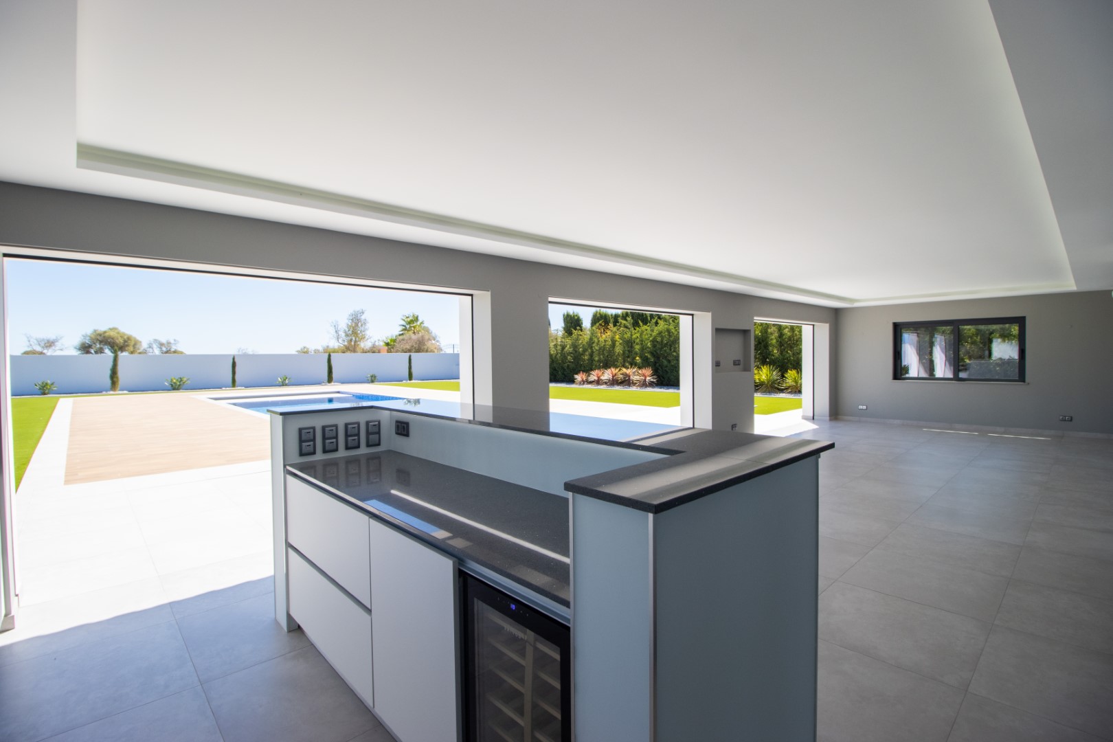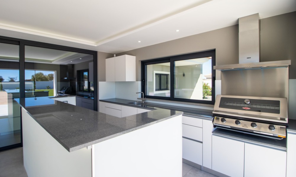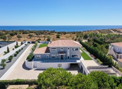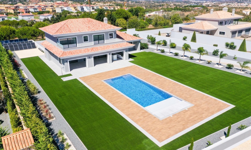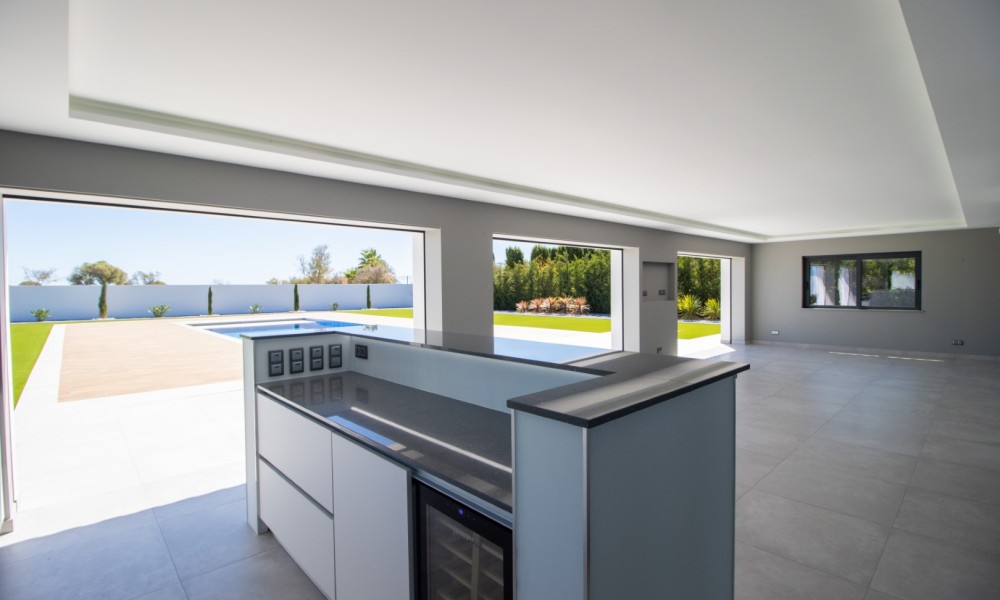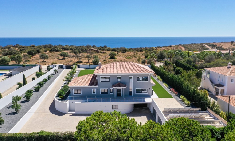 This luxurious newly constructed villa is located in a very peaceful and private location between Boavista Golf Resort and the Atlantic coast.The property is set in a 2607m2 plot, and has been built to an exceptional standard by one of the best builders in the area, with luxury finishes throughout.The boundaries of the plot are walled, and access is through an electric gate and a calçada drive which leads to the villa. On the ground floor, a double height entrance leads through to an open plan living, dining and kitchen area. Sliding windows open onto a spacious covered area, with a kitchen which overlooks the large swimming pool and low maintenance gardens – the perfect place for entertaining and outdoor living. Also on this level is an office area and a guest annex which has 2 bedrooms and a bathroom.Stairs lead up to the first floor of the property where you´ll find the master bedroom with walk-in closet and private en-suite bathroom. There are a further 2 en-suite bedrooms on this level. All bedrooms have stunning sea views and access to a large balcony.In the basement there is a large gym room with sliding doors and natural light, a cinema room with its own bar area, a laundry, storage room, and another area that could be used as a wine cellar.