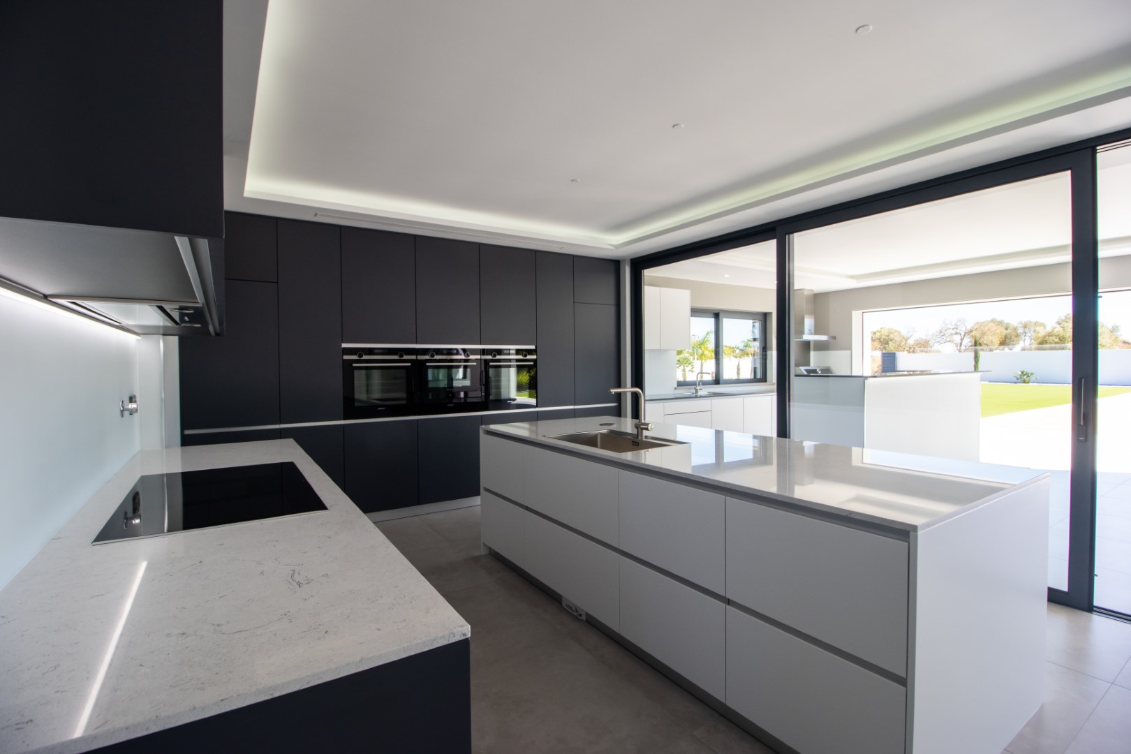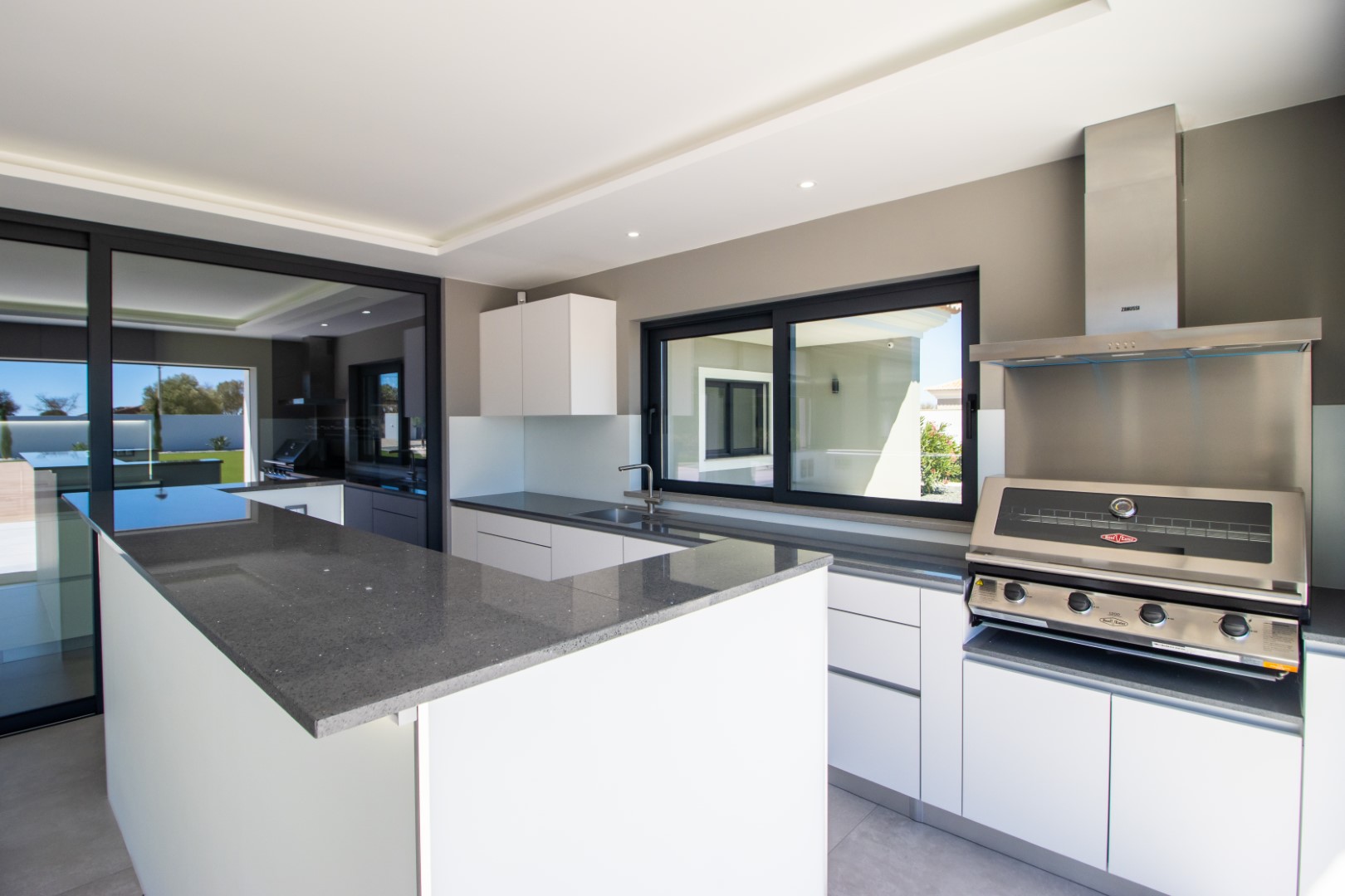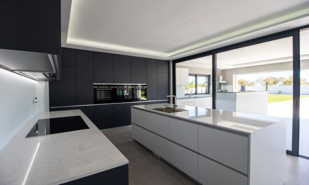 This luxurious newly constructed villa is located in a very peaceful and private location between Boavista Golf Resort and the Atlantic coast.The property is set in a 2607m2 plot, and has been built to an exceptional standard by one of the best builders in the area, with luxury finishes throughout.The boundaries of the plot are walled, and access is through an electric gate and a calçada drive which leads to the villa. On the ground floor, a double height entrance leads through to an open plan living, dining and kitchen area. Sliding windows open onto a spacious covered area, with a kitchen which overlooks the large swimming pool and low maintenance gardens – the perfect place for entertaining and outdoor living. Also on this level is an office area and a guest annex which has 2 bedrooms and a bathroom.Stairs lead up to the first floor of the property where you´ll find the master bedroom with walk-in closet and private en-suite bathroom. There are a further 2 en-suite bedrooms on this level. All bedrooms have stunning sea views and access to a large balcony.In the basement there is a large gym room with sliding doors and natural light, a cinema room with its own bar area, a laundry, storage room, and another area that could be used as a wine cellar.