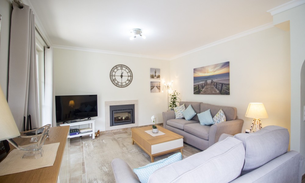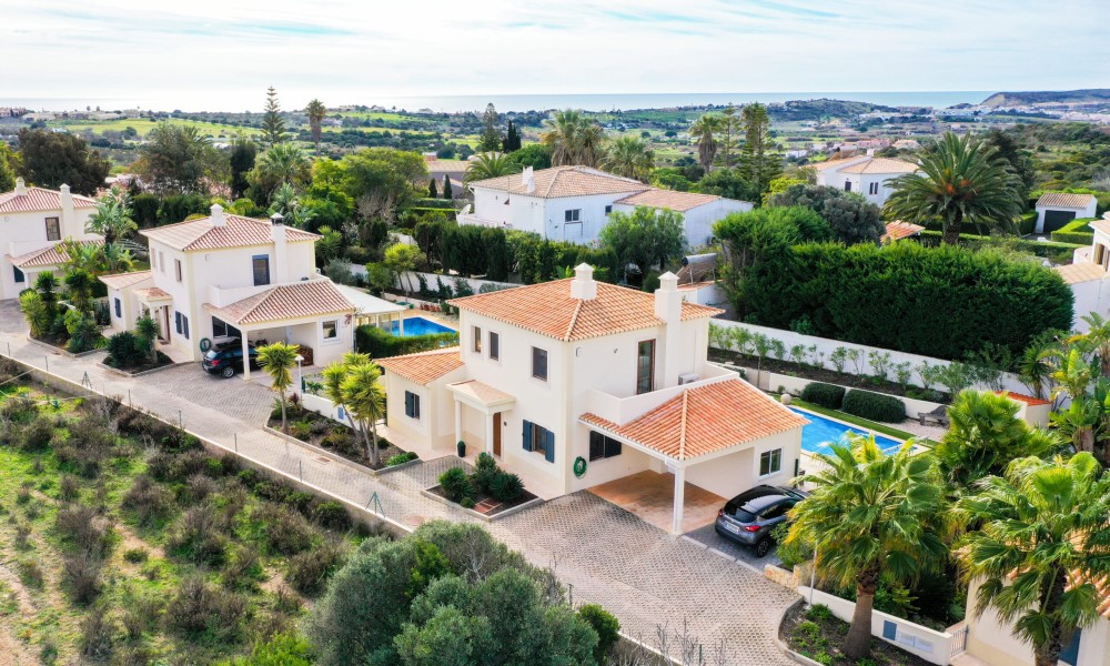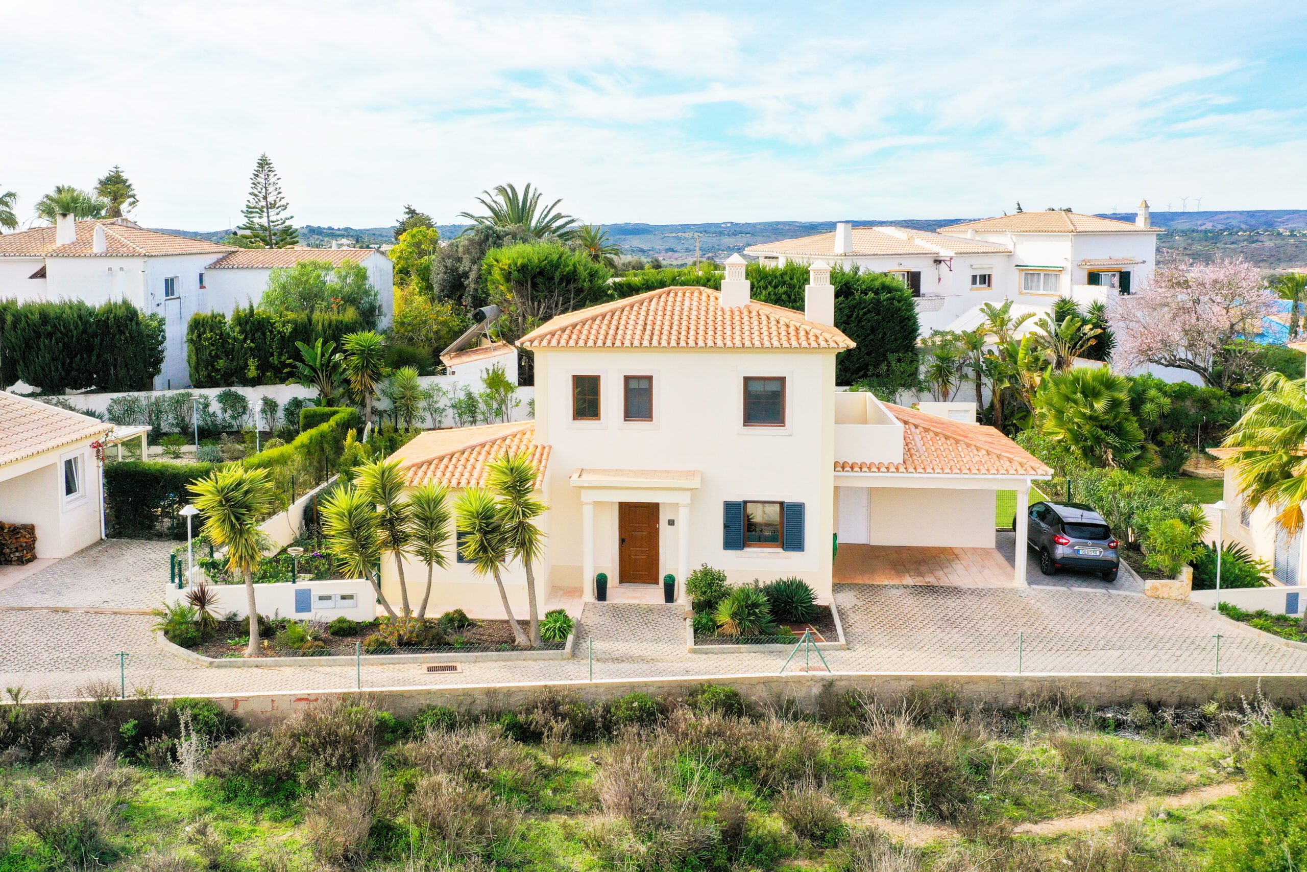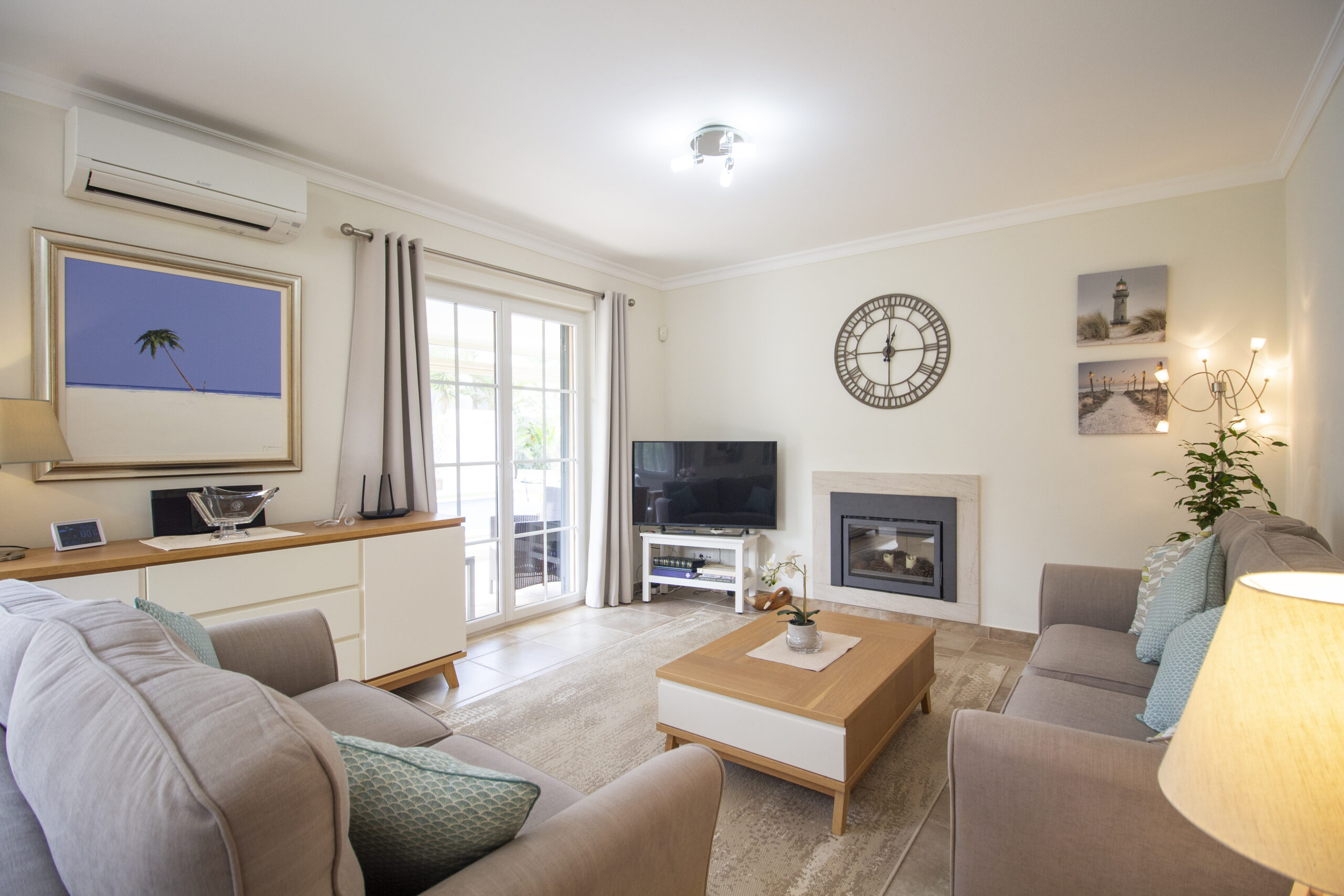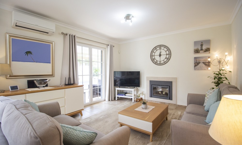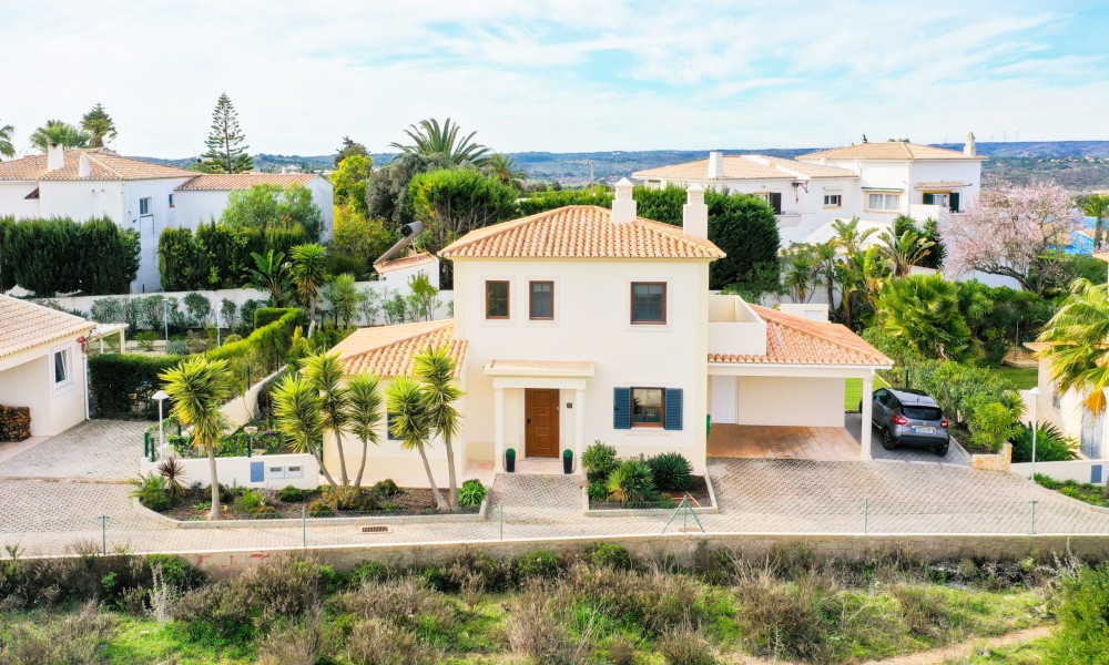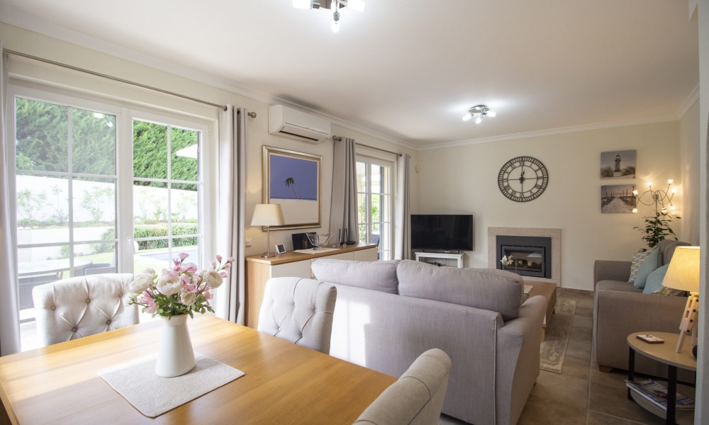 This charming and beautifully maintained 2+1 bedroom villa is situated in an elevated position in a quiet residential area of Luz. Set on two floors, it is in a small gated community and is only a 7 minute drive from the centre of the town.The hallway leads to a beautiful lounge/dining area with a wonderful view of the terrace and pool area. There is also a wood burning fireplace. There is a fully equipped kitchen just off the hallway. On this level there is also a guest bedroom which could also be used as an office. This bedroom is served by a shower and utility room next door. There is also a guest toilet. On the first floor are two further bedrooms – the master bedroom has a balcony with stunning views of the surrounding countryside. There is also a modern bathroom and separate guest toilet on this level. Outside, the villa has a beautiful terrace and well maintained garden area which is very private.
