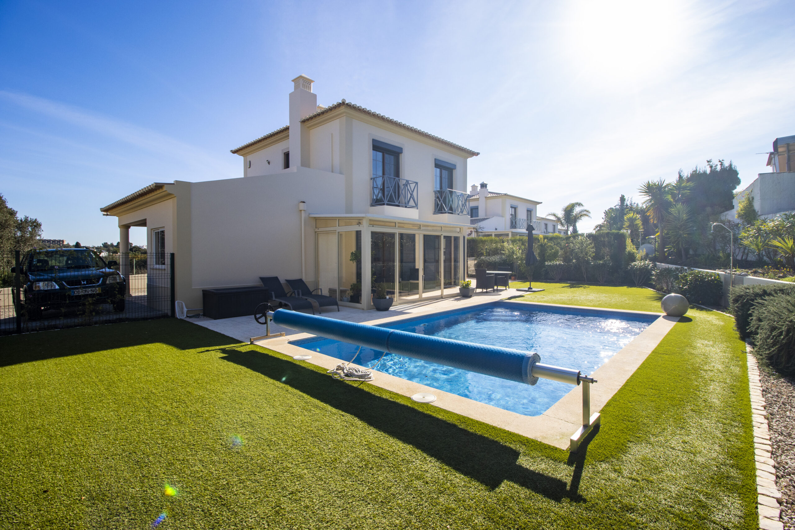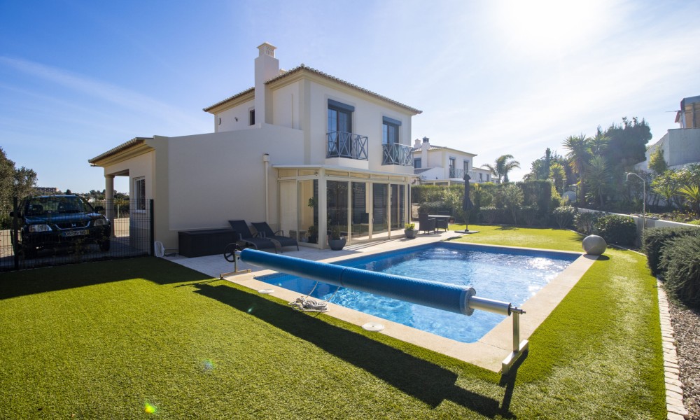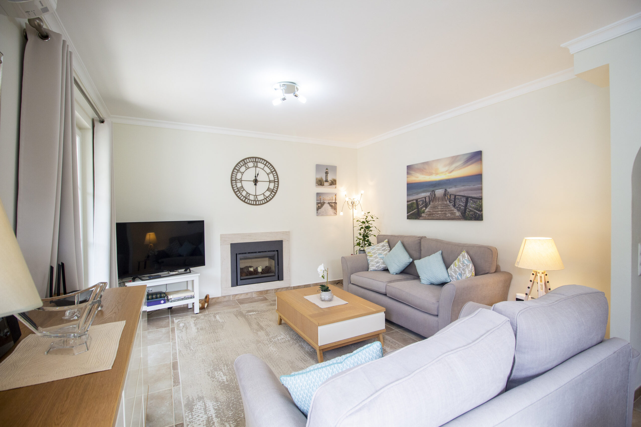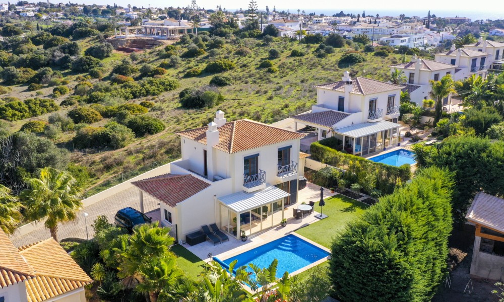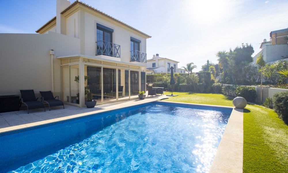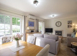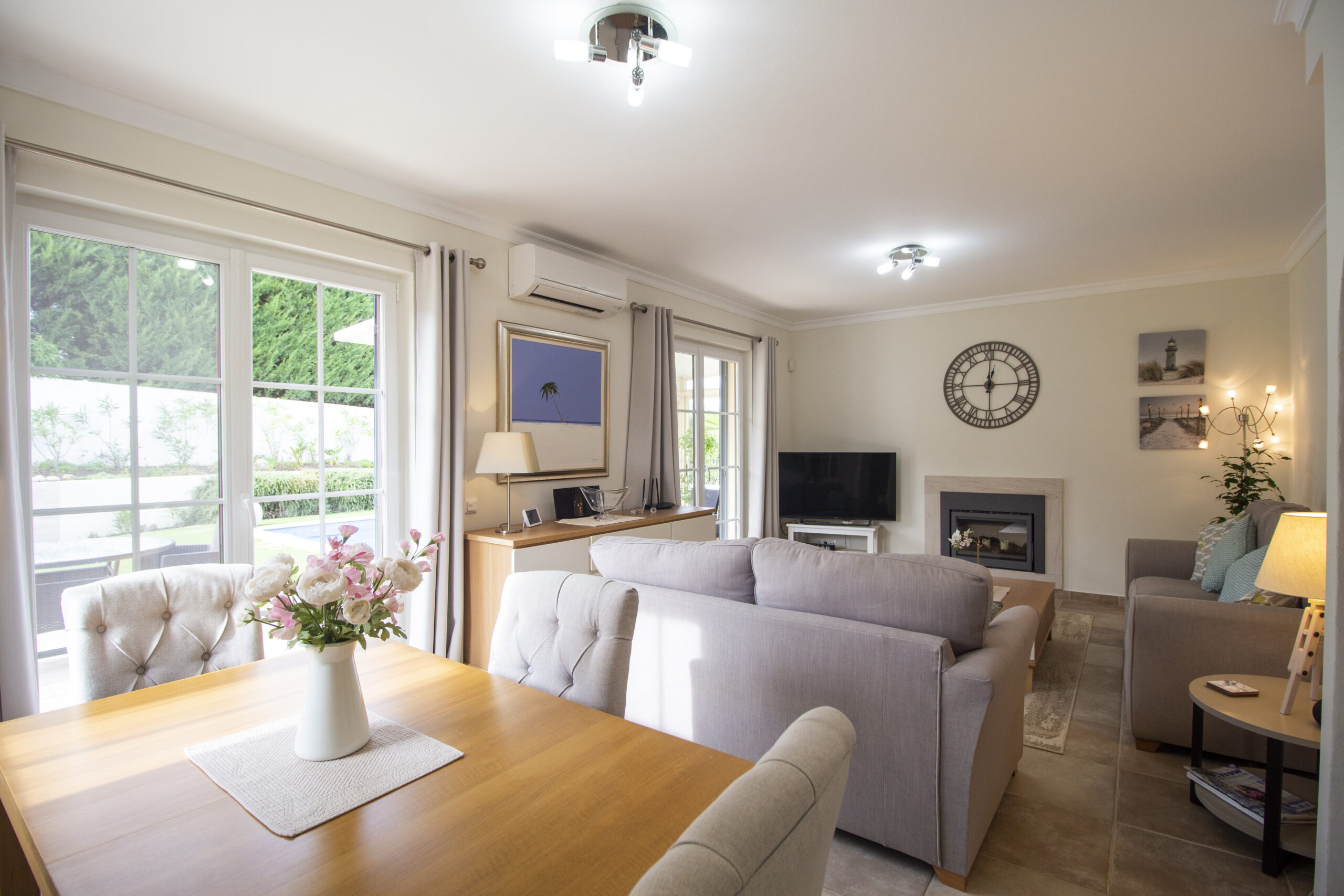 This charming and beautifully maintained 2+1 bedroom villa is situated in an elevated position in a quiet residential area of Luz. Set on two floors, it is in a small gated community and is only a 7 minute drive from the centre of the town.The hallway leads to a beautiful lounge/dining area with a wonderful view of the terrace and pool area. There is also a wood burning fireplace. There is a fully equipped kitchen just off the hallway. On this level there is also a guest bedroom which could also be used as an office. This bedroom is served by a shower and utility room next door. There is also a guest toilet. On the first floor are two further bedrooms – the master bedroom has a balcony with stunning views of the surrounding countryside. There is also a modern bathroom and separate guest toilet on this level. Outside, the villa has a beautiful terrace and well maintained garden area which is very private.