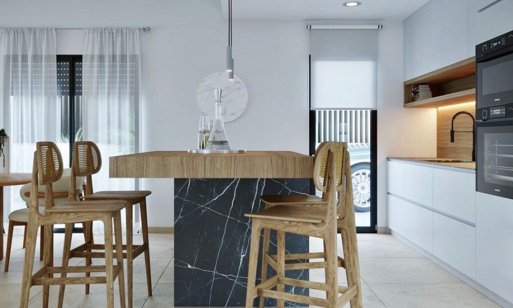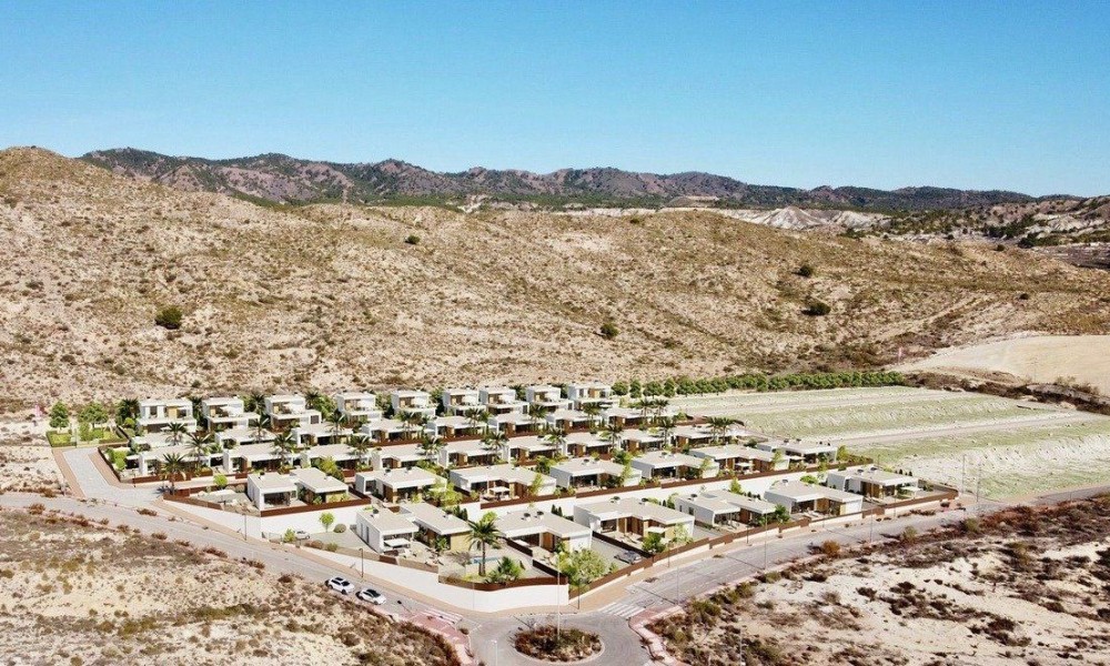 We are proudly presenting these lovely villas on Altaona Golf and Country Village Cherry, sunny homes designed with an outdoor lifestyle in mind. They come with either 3 or 4 bedrooms and have 2 bathrooms or 2 bathrooms and a some of them also a guest toilet. * They are all in one plan. * All of them are South facing. * Tiles and kitchen worktop etc are supplied by Porcelanosa. * They all have private pools 18 m2 to 25 m2. * All white goods are included. * Heated floors in bathrooms. * LED lights in all rooms. * Pre-installation for ducted air-conditioning. * Electric shutters in the bedrooms * Off street parking Plot sizes are from 325 m2 to 609 m2. There are 4 options of layouts to choose from. This model has a brilliant layout, it is 3 bed, 2 baths, guest toilet on a 357 m2 plot. The big kitchen/dinner/lounge is 41 m2 has large glass doors to the garden/pool area. All white-goods are included in the kitchen. From the kitchen is also access to the large utility room and the guest toilet. Master bedroom is 17 m2 and has plenty of wardrobe space and en-suite bathroom with double sink and large walk-in shower.