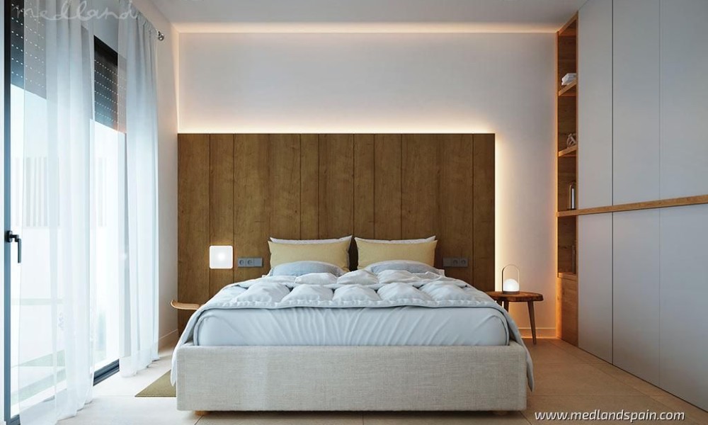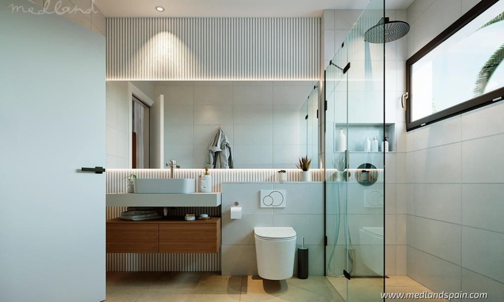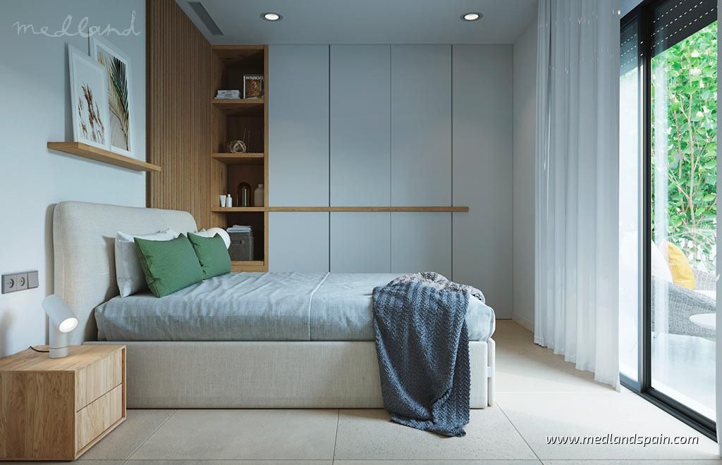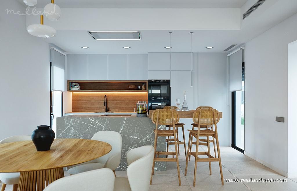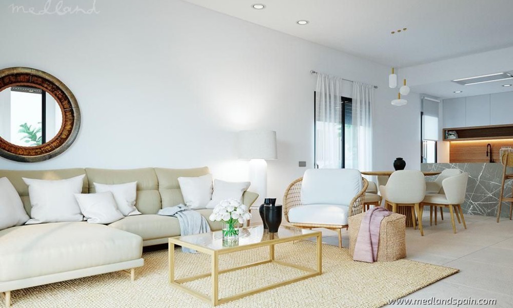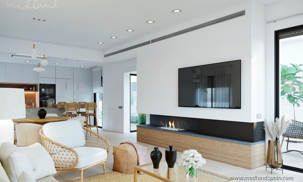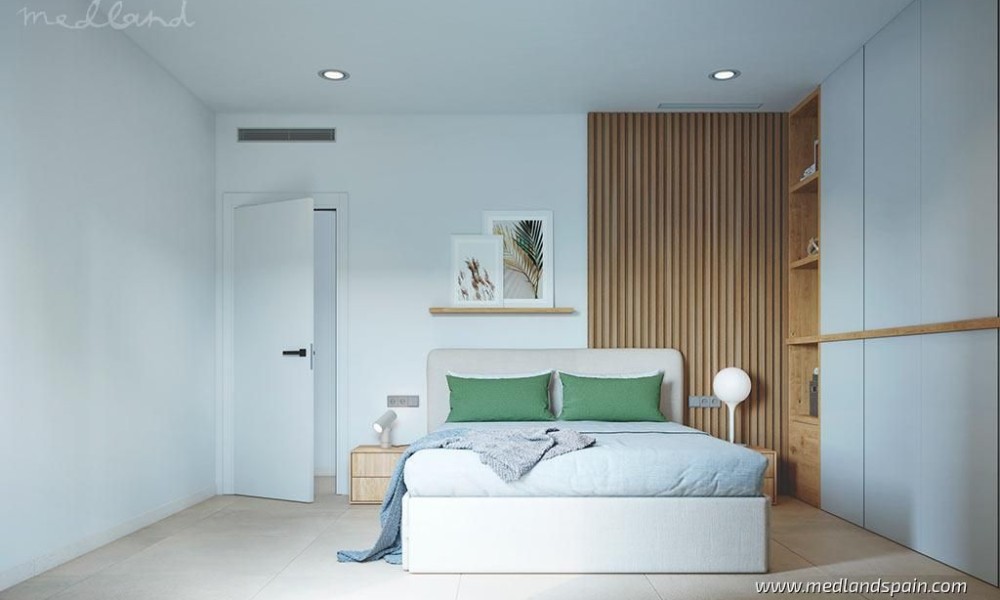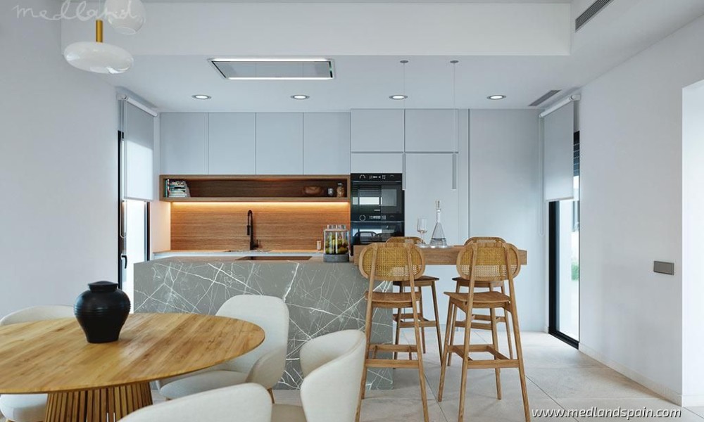 All the villas are on one level, and present a spacious living area, combing the lounge, dining area and fully equipped kitchen. Thanks to the large windows in the lounge, the partially covered terrace and pool area are a natural extension of the living area. The ideal place to enjoy the Mediterranean outdoor lifestyle all year ‘round. The master bedrooms have a private bathroom and a walk-in closet.The villas are built with top quality materials, and combine crisp white surfaces with natural materials creating a warmer facade. The villas include pre-installation for A/C, white goods, underfloor heating in the bathrooms, LED Lighting, laundry facilities, private pool and garden, and parking on the premises.