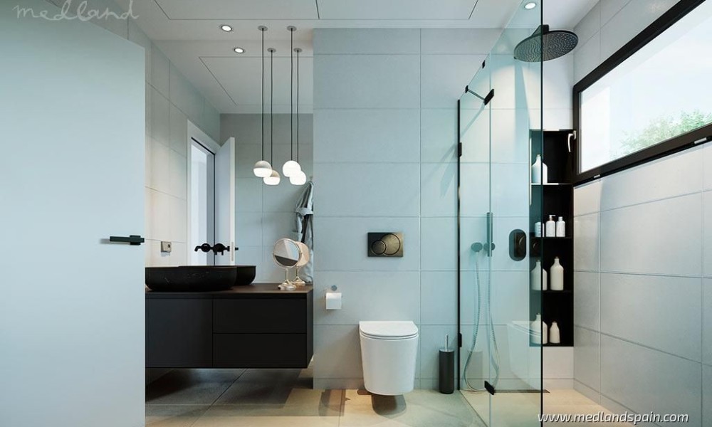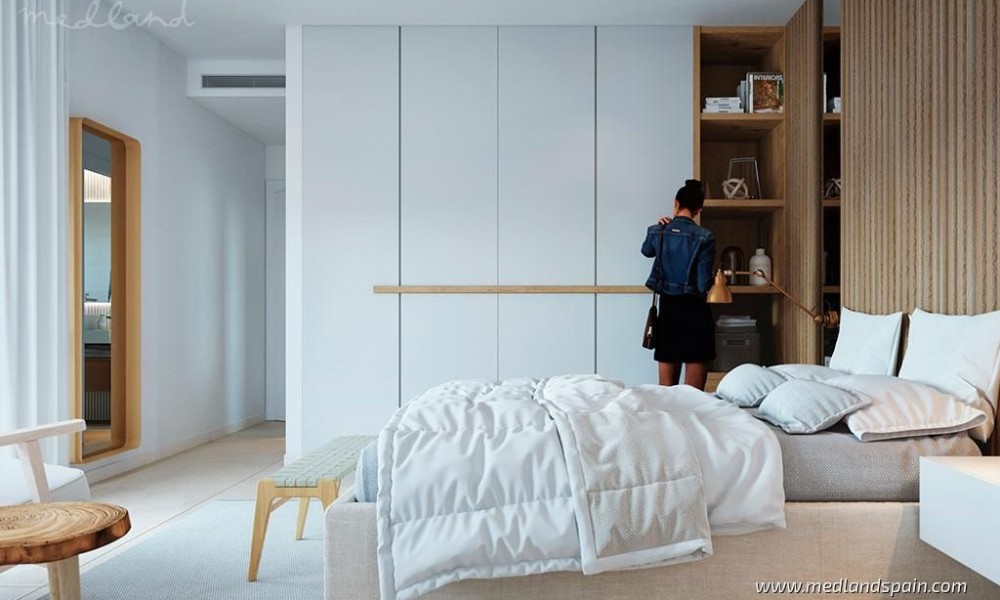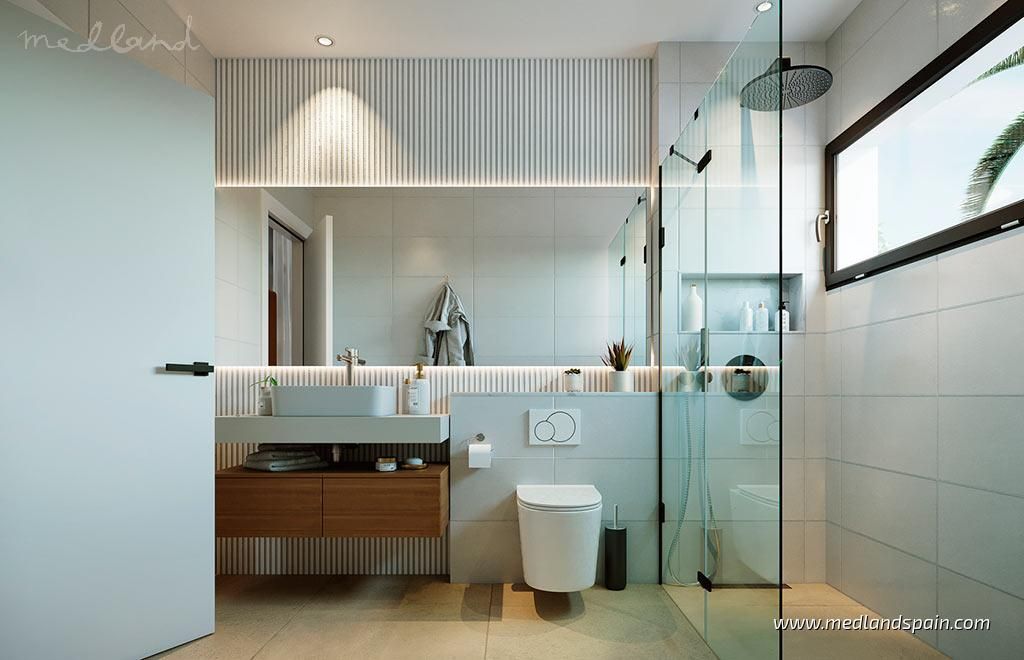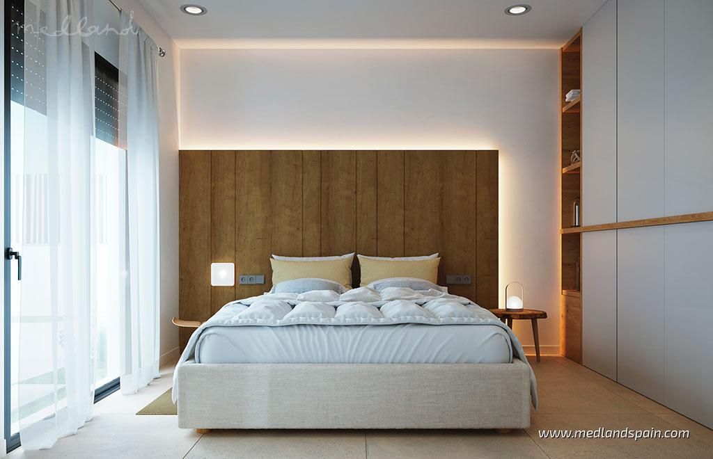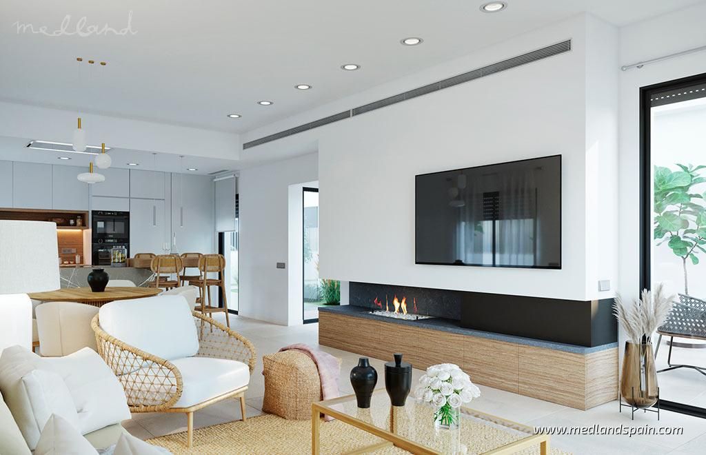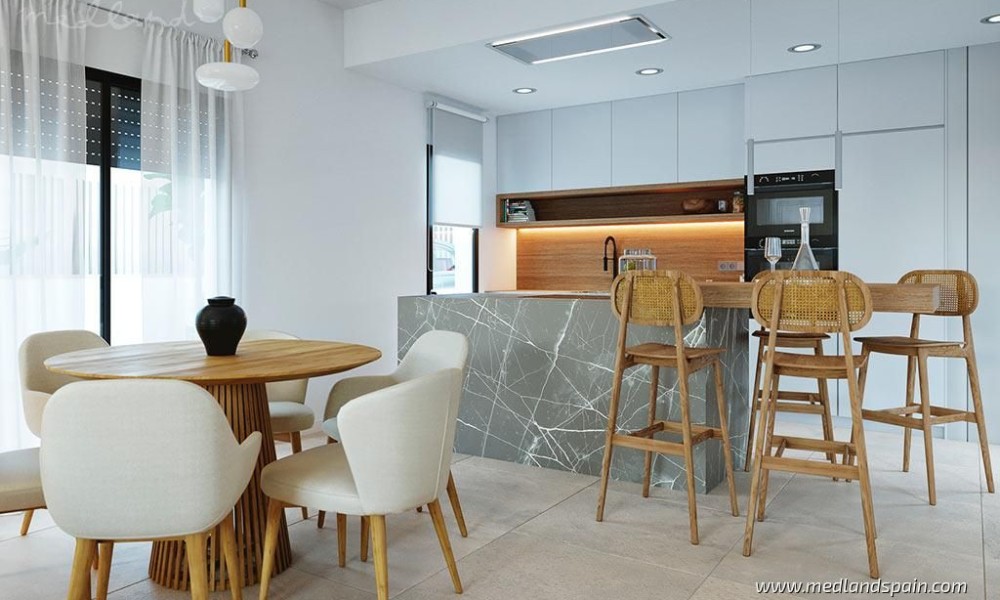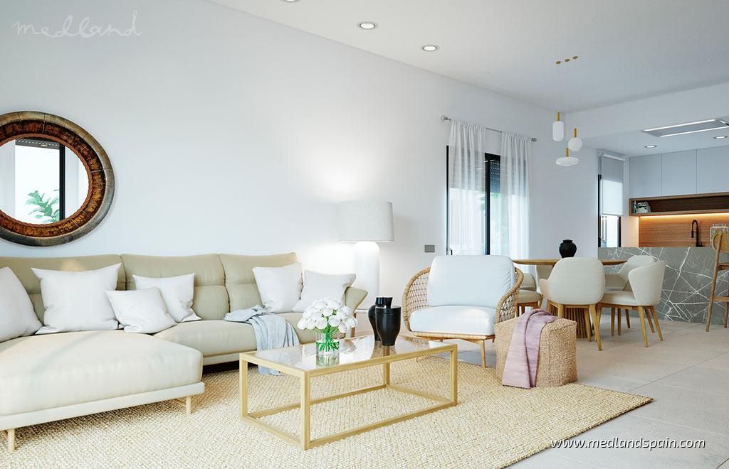 All the villas are on one level, and present a spacious living area, combing the lounge, dining area and fully equipped kitchen. Thanks to the large windows in the lounge, the partially covered terrace and pool area are a natural extension of the living area. The ideal place to enjoy the Mediterranean outdoor lifestyle all year ‘round. The master bedrooms have a private bathroom and a walk-in closet.The villas are built with top quality materials, and combine crisp white surfaces with natural materials creating a warmer facade. The villas include pre-installation for A/C, white goods, underfloor heating in the bathrooms, LED Lighting, laundry facilities, private pool and garden, and parking on the premises.