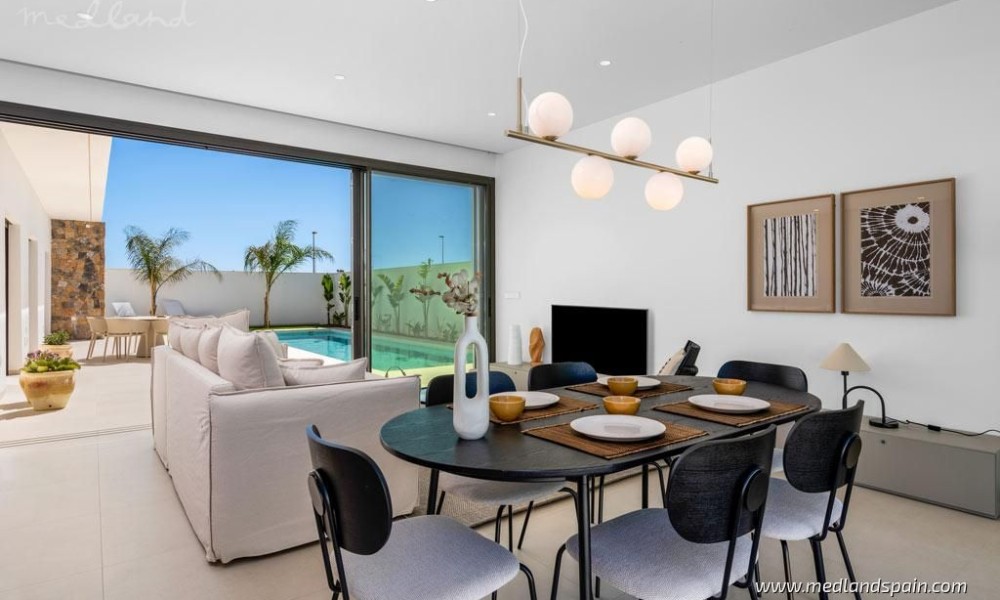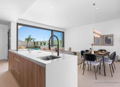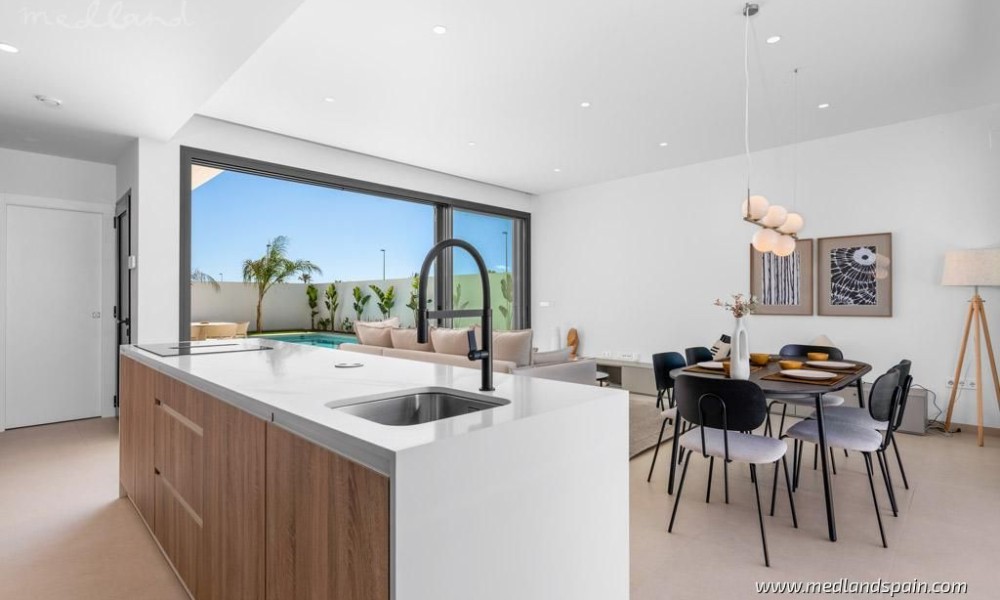 New project of modern villas in La Serena Golf resort, less than 1.5km from the beach in Los Alcazares. The resort includes an 18-hole golf course, as well as the Club House, with a pro-shop, an a-la-carte restaurant, and a bar with a terrace overlooking the golf course and the Mar Menor. The town of Los Alcazares has a complete selection of daily services and amenities, like supermarkets, bars and restaurants, banks and pharmacies, schools, and a medical centre. Not only is the area known for its various golf courses, but there are other outdoor activities to enjoy, like hiking or mountain biking, as well as water activities like sailing, scuba diving etc. The Murcia airport is 30 minutes’ drive from the project, while the Alicante airport can be reached in a little over an hour, thanks for the convenient AP7 motorway.The project presents detached villas on one level, built on plots between 250m2-507m2.