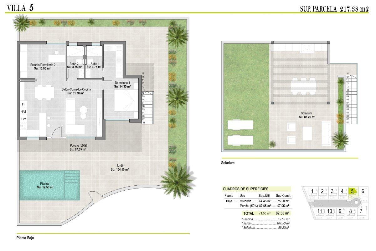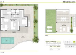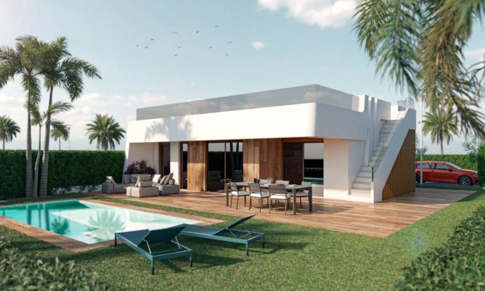 Murcia airport is only 30 minutes away, while Alicante is a 1.15 hour drive. The capital of Murcia, famous for its cathedral and historic centre, is also 30 minutes away. ~ ~ The villas consist of 3 or 4 bedrooms, 2 or 3 bathrooms, a fully equipped kitchen, complete bathrooms, living-dining room, private swimming pool, large solarium of 105M² including summer kitchen, parking and much more.