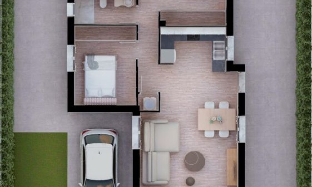This brand new detached villa is situated on a spacious 350m2 plot in Los Alcazares. The villa features 3 bedrooms and 2 bathrooms, an open-plan kitchen opening onto the living room, fitted wardrobes, a solarium, a private garden with off-road parking and space for a swimming pool. Optionally, there is the possibility of adding a private pool at an additional cost. The spacious living room features large sliding doors leading to a terrace. There are spacious terraces at both the front and rear, allowing owners to enjoy the sun all day.