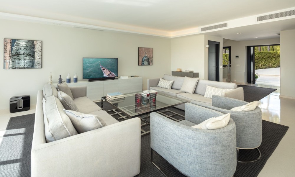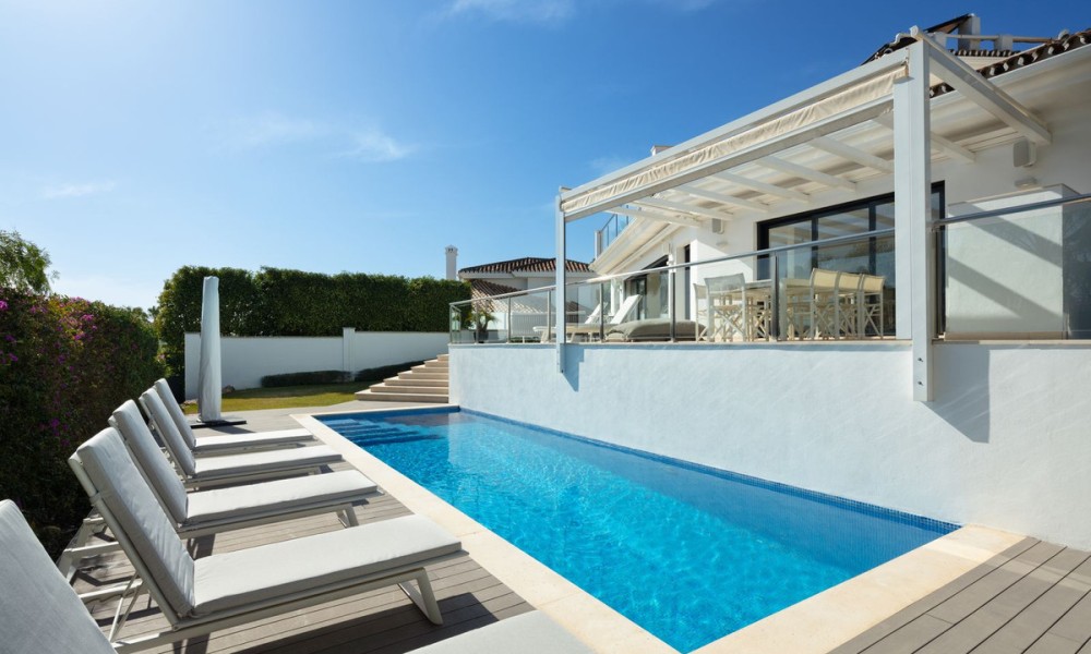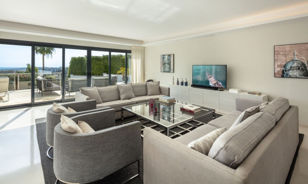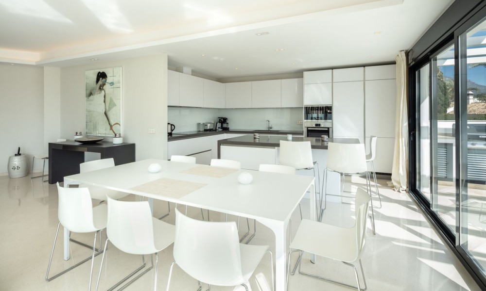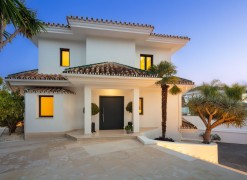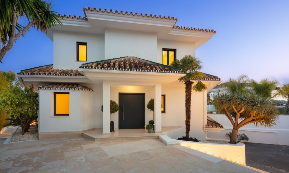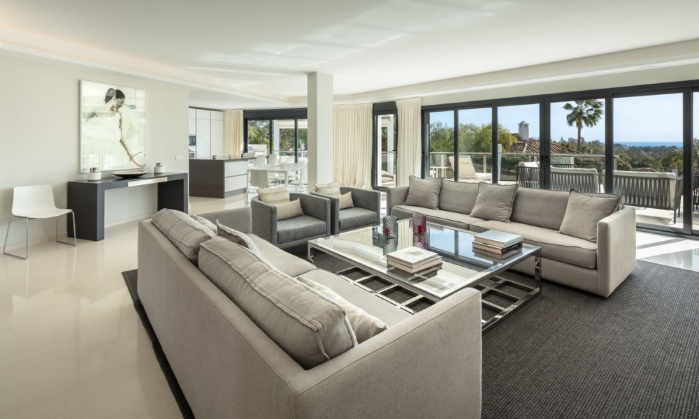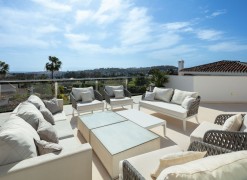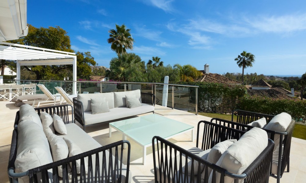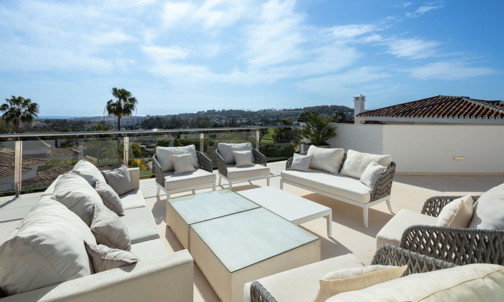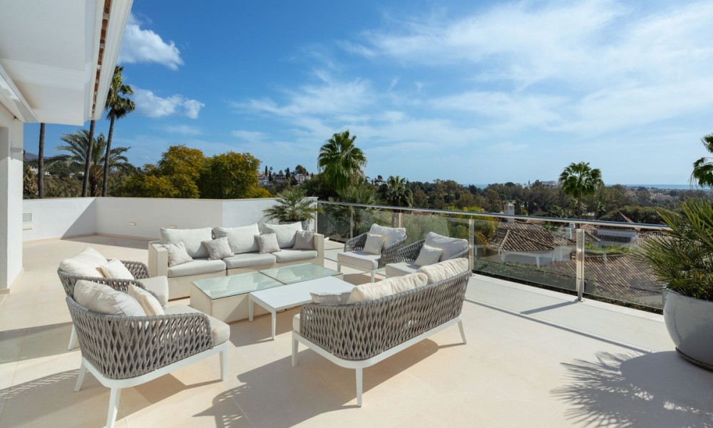 Completely refurbished family villa with breathtaking sea views in the heart of the Golf Valley (Nueva Andalucia). The property is distributed over 3 levels and offers open space layout with plenty of natural light. Entrance level includes living room/open plan kitchen, 3 double bedrooms, 2 bathrooms and a guest WC. Top floor offers 2 bedrooms: main suite and a guest bedroom and a bathroom. 90m2 solarium terrace enjoys beautiful views of la Concha mountain in the east, over the golf course and Puerto Banus towards the south and evening sun on the west side.