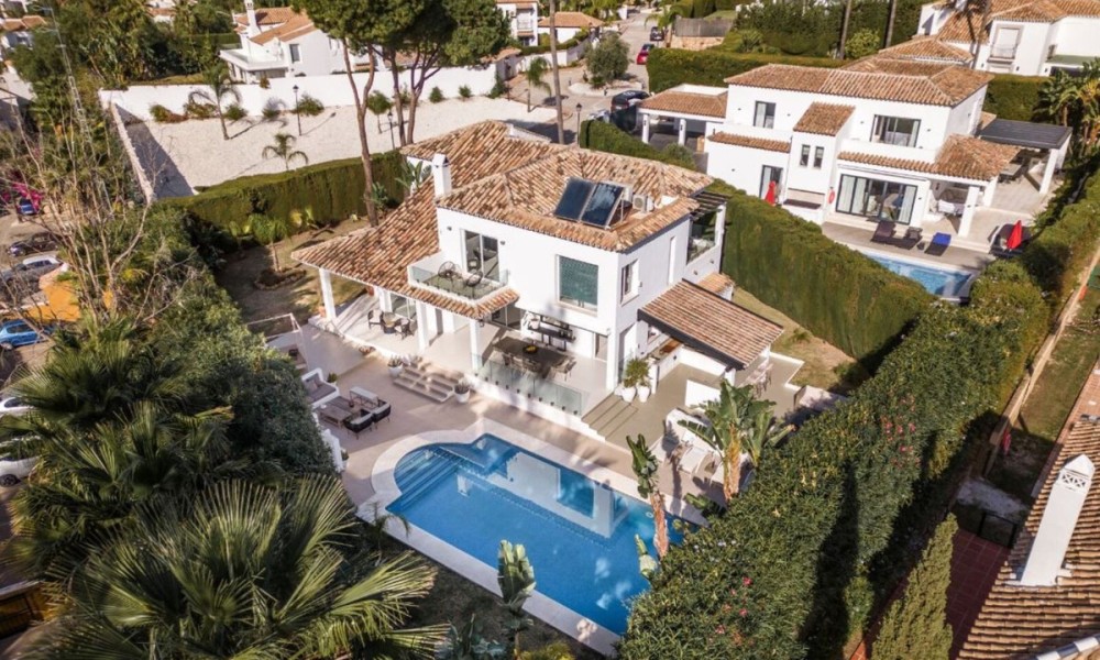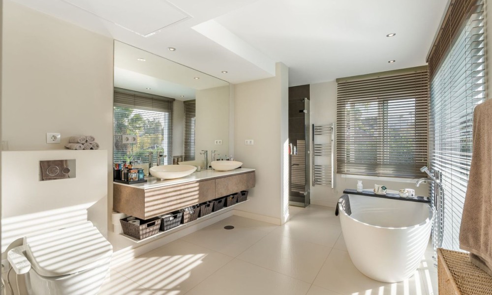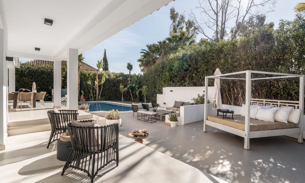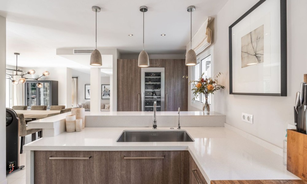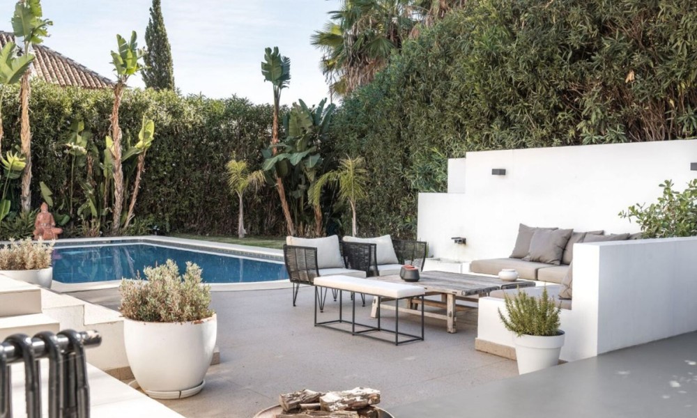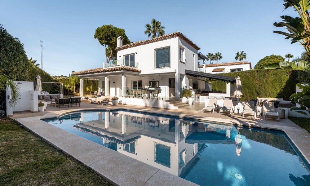 Stunning detached residence situated in one of Marbella’s most esteemed locations, this property epitomizes the essence of refined living.The outdoor space is a haven of sophistication, featuring a fully equipped kitchen with a gas pizza oven, a 4-burner gas grill, a wood/charcoal Maria style BBQ/Grill, fridges, and a wine cooler. The outdoor kitchen lounge, sun deck, pool lounge with a water feature, sun bed lounge, and dining terrace for 12 offer an unparalleled blend of relaxation and entertainment. The 11m x 5.5m pool and carefully orchestrated garden lighting enhance the property’s elegance.The master bedroom suite is a sanctuary of luxury, complete with a private balcony, a walk-in closet, and a bespoke ensuite featuring an oversized shower, bespoke stone bathtub, and an auto toilet. Three additional ensuite bedrooms, each boasting private balconies, fully fitted wardrobes, and automated toilets, cater to both comfort and convenience.The heart of the home lies in its modern amenities.