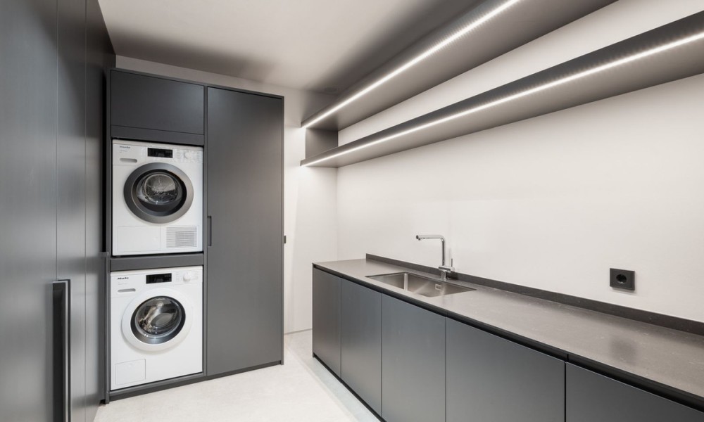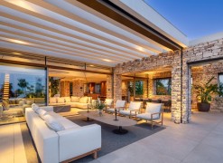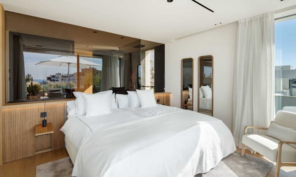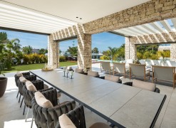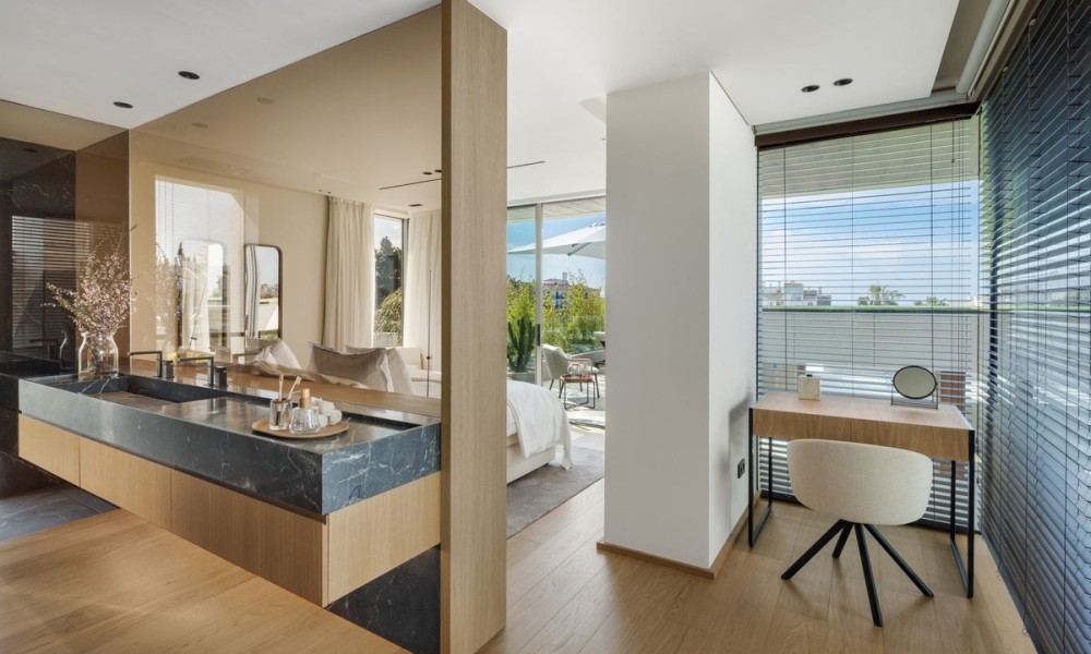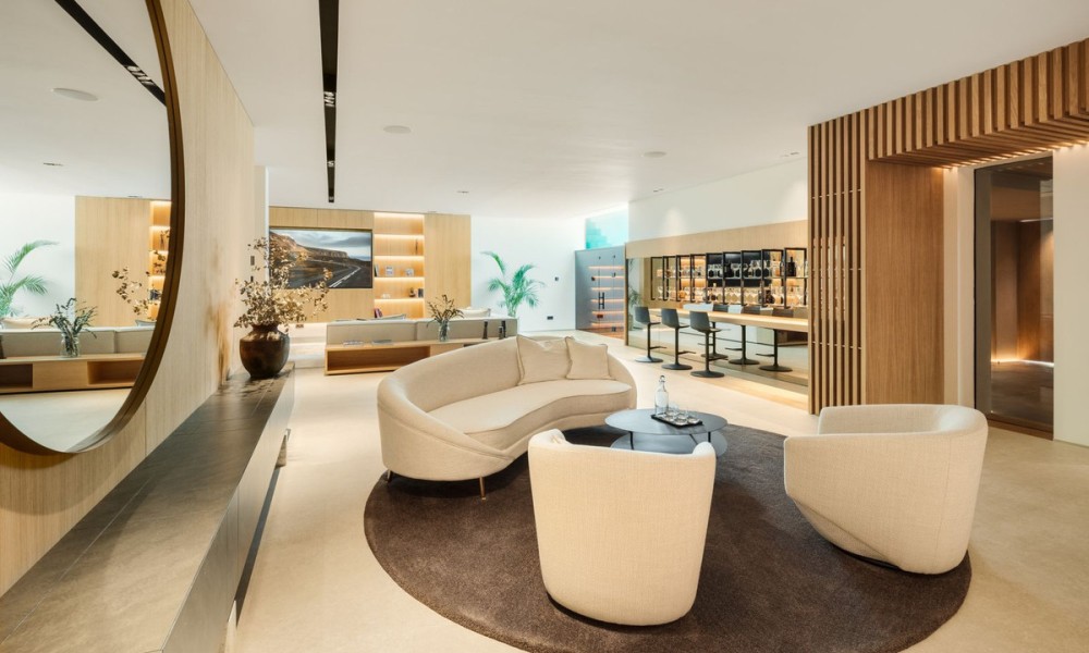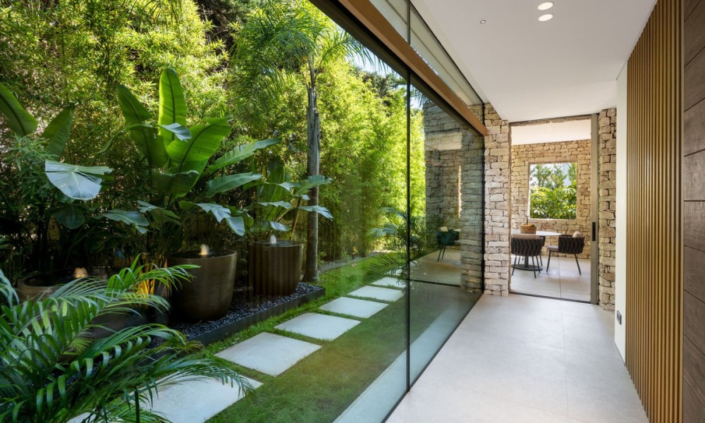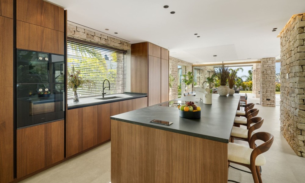 Stunning architectural masterpiece in Nueva Andalucia, where every detail is designed to offer an unparalleled lifestyle. Just minutes from Puerto Banus and within walking distance to all amenities, this extraordinary property combines stunning modern design with an unbeatable location. The villa’s exterior boasts a striking infinity pool, stretching seamlessly from the garden to the interior, enhanced by LED lights that create an enchanting atmosphere at night. A generous terrace offers multiple chill-out areas and alfresco dining spaces, perfect for entertaining or relaxing in style. Accessible via a private driveway, the villa includes a convenient private garage, ensuring ultimate privacy and security.Step inside to an interior that is nothing short of spectacular. The open-plan living, dining and kitchen area is bathed in natural light, thanks to floor-to-ceiling windows and a double-height ceiling that exudes an airy, spacious feel. The living area features stunning Travertino Tajal stone walls, mimicking the villa’s exterior, and a cosy nook adorned with lovely trees. The kitchen is a dream, with generous proportions, state-of-the-art appliances, natural oak accents, ample storage and direct access to both formal and intimate dining areas.