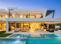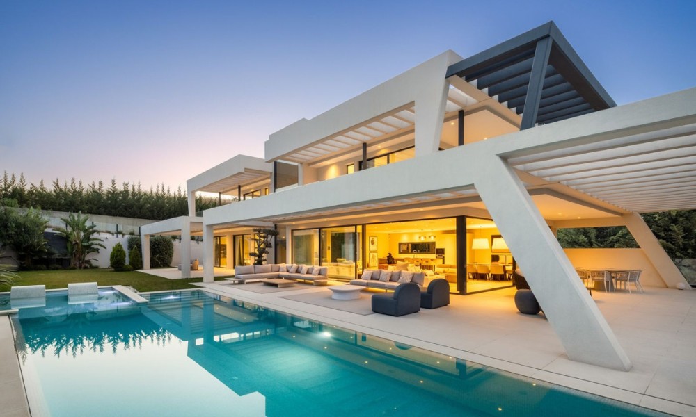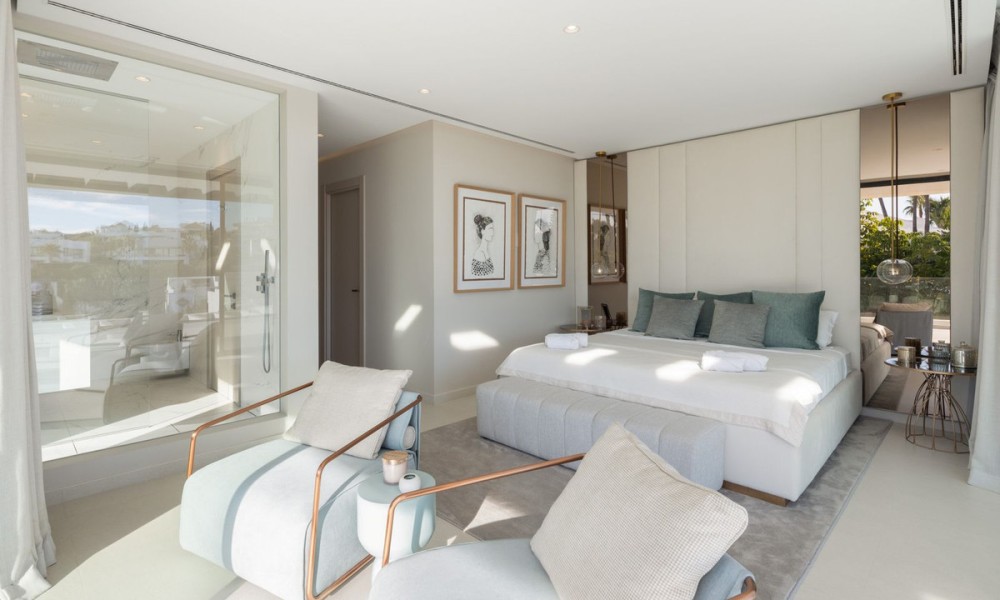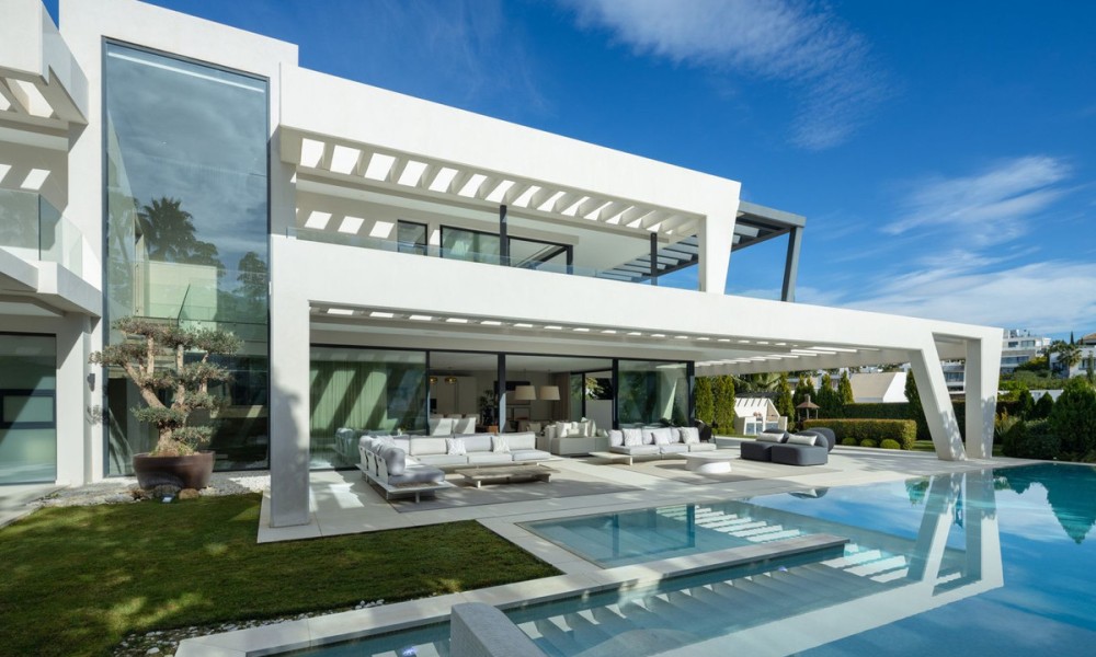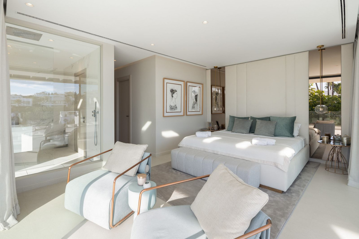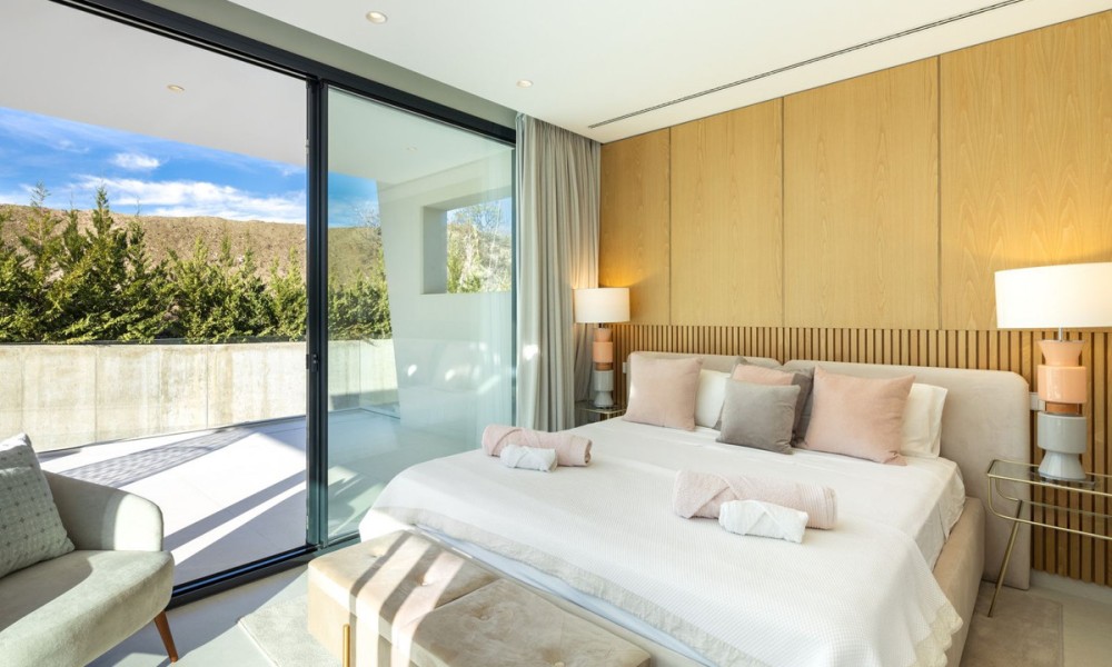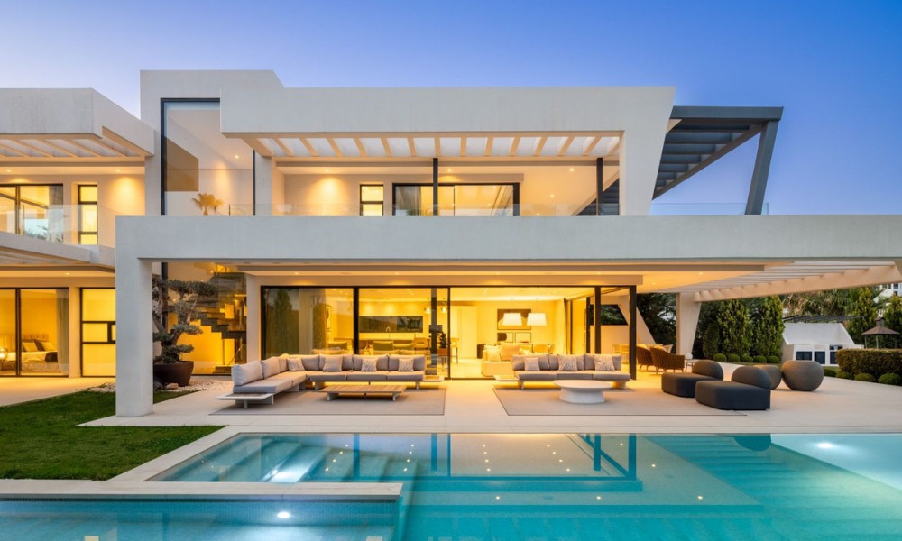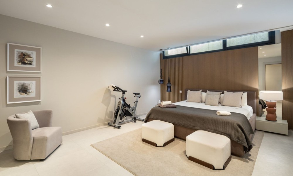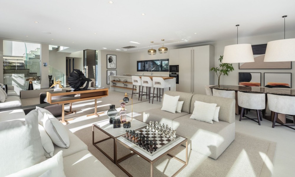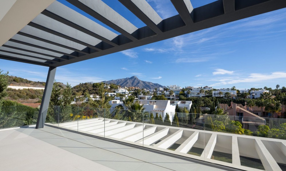 Exceptional modern property located in the heart of Nueva Andalucía, steps away from the renowned Los Naranjos golf club and a short drive from Puerto Banús and Marbella Golden Mile. The residence spans across three levels, sitting on a generous 1,420m2 plot and boasts a stunning manicured garden.The main entrance level boasts a welcoming foyer with a guest powder room, an expansive living room with an integrated dining area and an open-plan, fully equipped kitchen complete with Miele appliances. This level also features two generously sized bedrooms, each with its own private en-suite bathroom.The upper level of the home offers two additional bedrooms, including a luxurious master bedroom with dedicated dressing and lounge areas for added comfort and convenience. The master bedroom opens up to an ample terrace that provides sweeping views of the surrounding area.