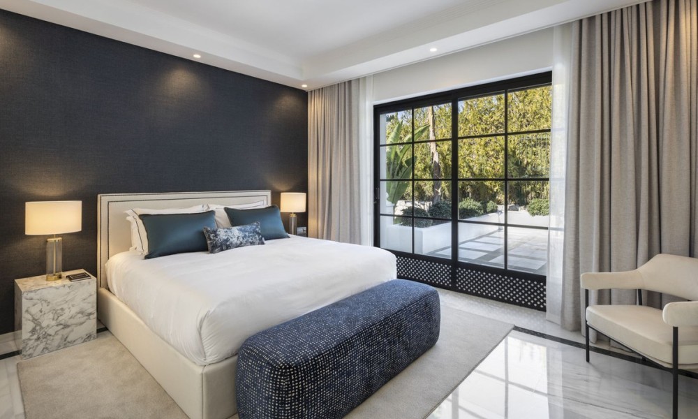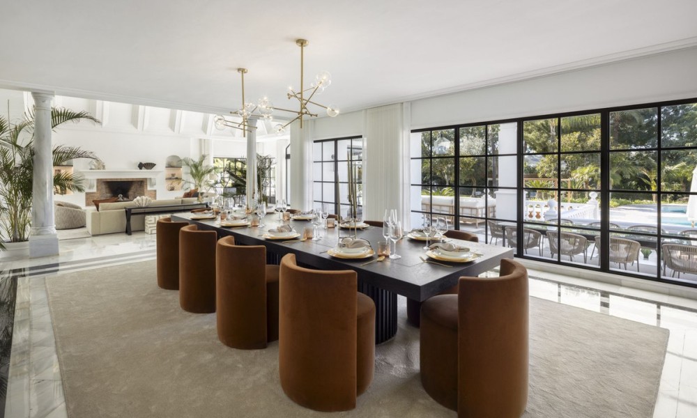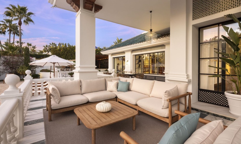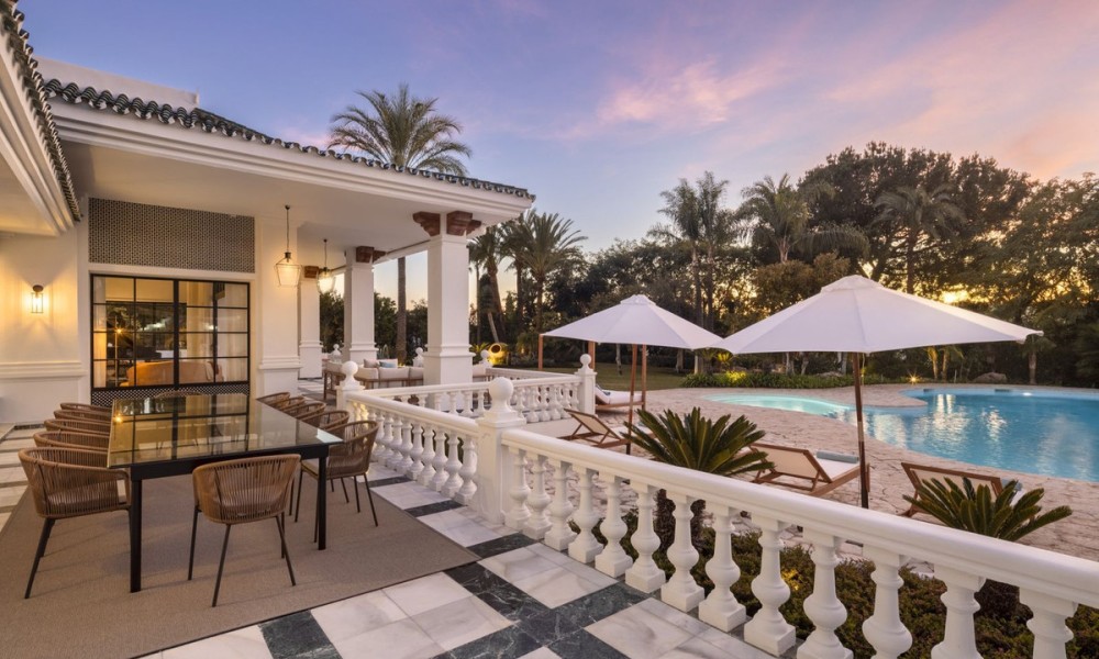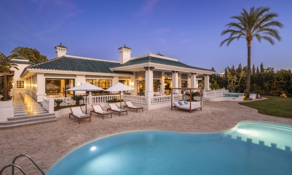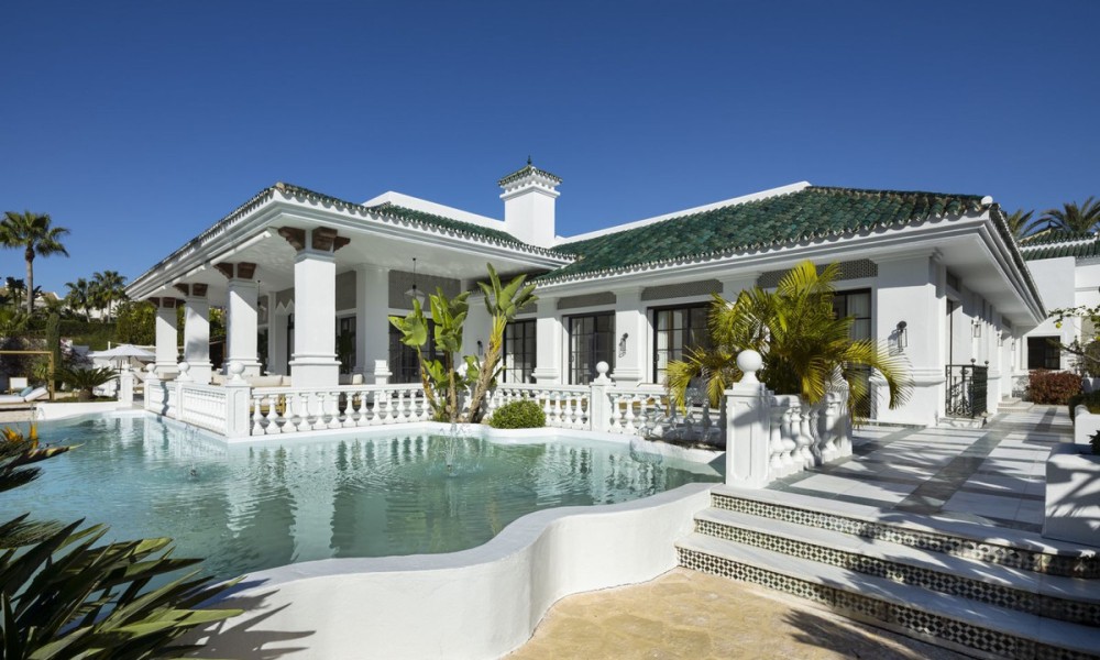 Architectural masterpiece, seamlessly blending traditional Andalusian aesthetics with Moorish influences, creating a palatial residence that is both enchanting and evocative. The meticulous attention to detail in its design transports residents to a world of opulence, reminiscent of the rich cultural heritage of Andalucia. This residence is not merely a home; it is an immersive experience that captures the essence of its surroundings.Nestled on a sprawling plot exceeding 4000m2, the villa’s outdoor spaces are a testament to thoughtful design. The immaculate garden, adorned with a lagoon-inspired private pool and a charming outdoor pergola, allows residents to indulge in the ultimate luxury of serenity and leisure. The various terraces provide versatile settings, from intimate alfresco dining areas to tranquil spots for relaxation, making every corner of this property a canvas for luxurious living and entertainment. Meticulous landscaping adds a layer of privacy and beauty to the gardens.Upon arrival there is a stunning patio, adorned with two fountains, which serves as a prelude to the exquisite interiors that follow. The abundance of windows and glass sliding doors ensures that natural light floods the living spaces, creating a seamless harmony between the indoor and outdoor realms. The open-plan living and dining area, with its lofty ceilings, further amplifies the sense of grandeur and spaciousness.Inside, the recently-refurbished villa is a showcase of sophistication. Carefully selected furniture and fixtures adorn the living spaces, creating an atmosphere of refined elegance.