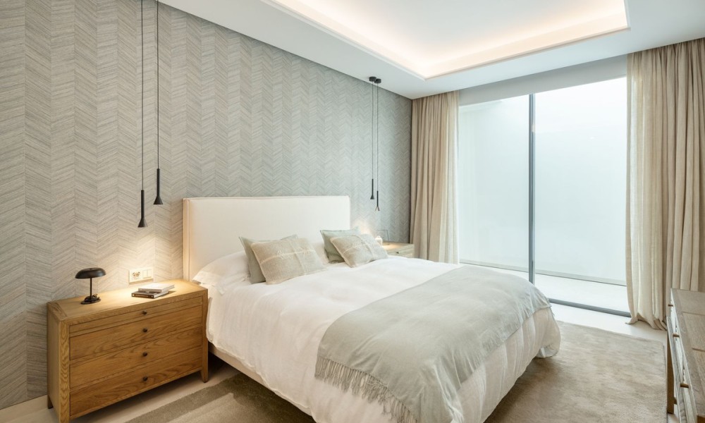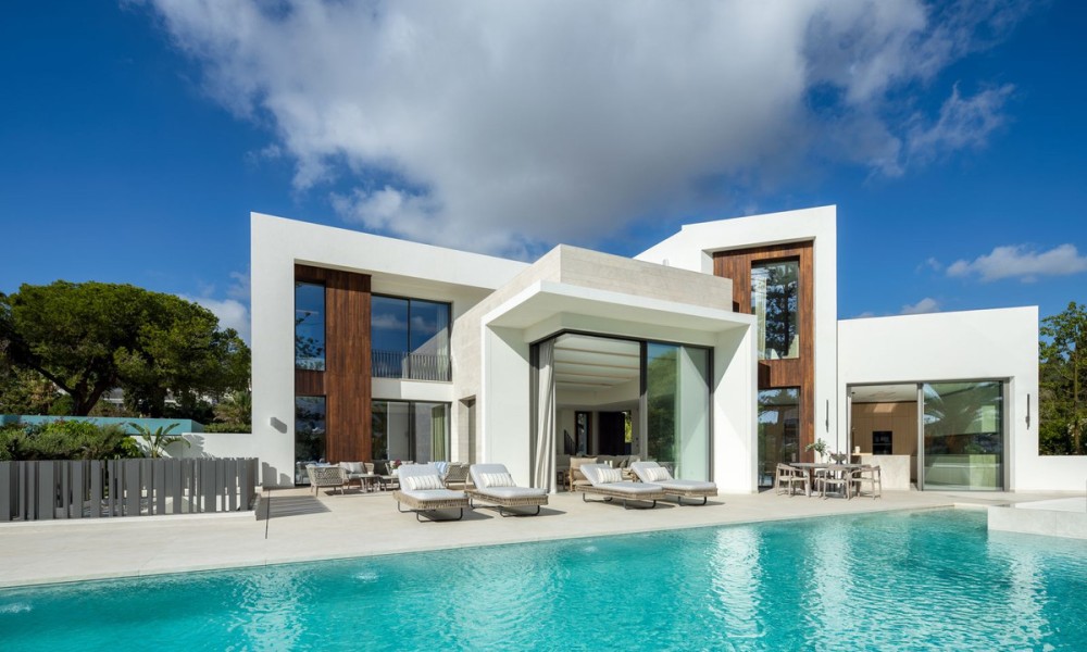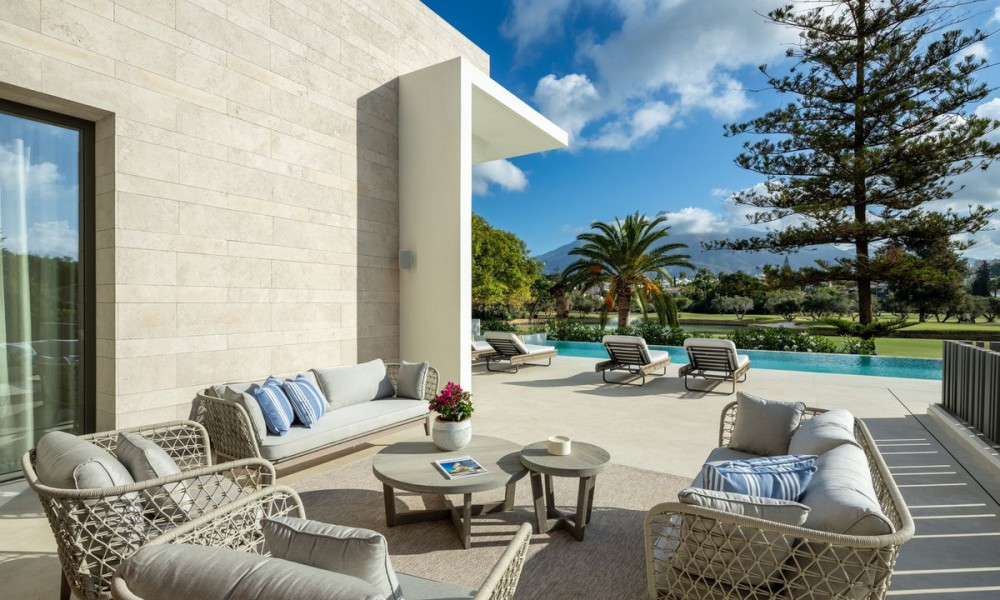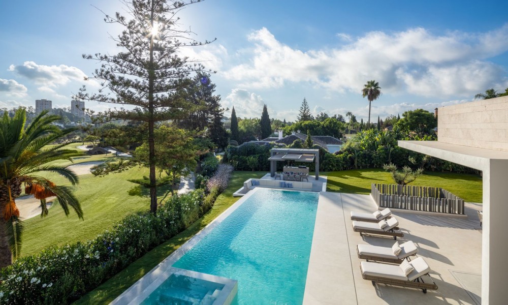 Brand newly built villa offers a luxurious living experience with modern design and natural beauty. Crafted by a renowned architect and top-tier developer, the property exemplifies impeccable standards. Located frontline at Las Brisas Golf Club in Nueva Andalucía, the villa combines tranquility with proximity to Marbella’s amenities, including the vibrant Puerto Banús. Residents enjoy a peaceful atmosphere in a well-established neighborhood, just a short drive from Marbella’s heart. Spanning 1,454 square meters and 710 square meters across three levels, the villa features five spacious en-suite bedrooms and an additional guest toilet. High ceilings, expansive windows, and premium materials enhance the design. The inviting main living area boasts an open-plan layout, large archways, and leaded windows, creating a sense of grandeur. The kitchen is equipped with high-end appliances and an oversized island, overlooking the infinity pool and jacuzzi with stunning golf course views.