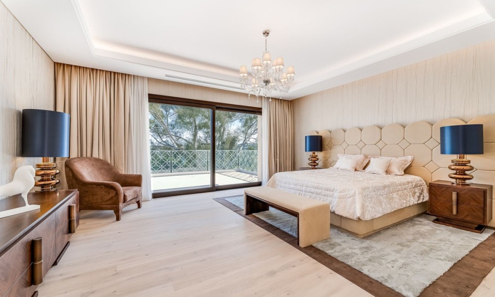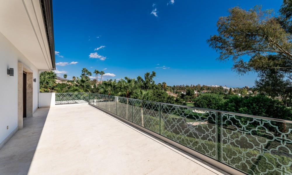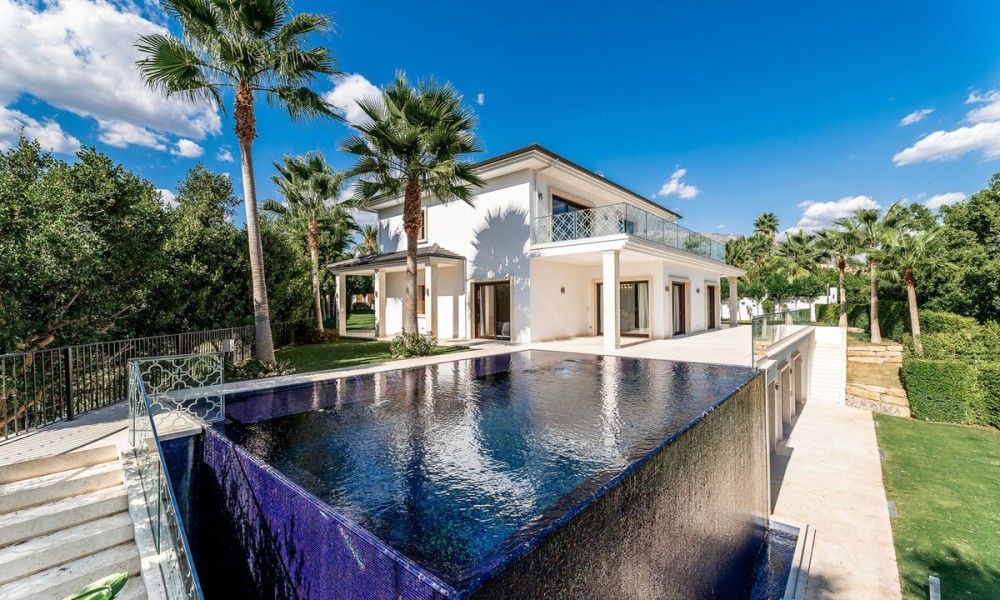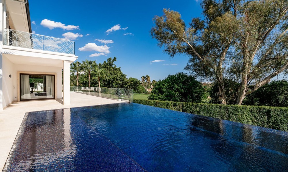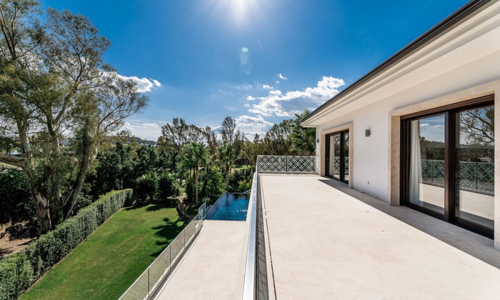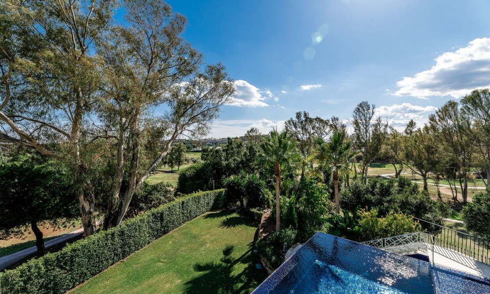 Nestled in the heart of Marbella’s Nueva Andalucia, this luxurious property seamlessly blends modern technology with the serenity of nature. Positioned on a unique triangular plot and surrounded by golf courses on both sides, it offers a privileged front-row golf location. Situated at the end of a cul-de-sac, the villa provides unmatched privacy and tranquility, making it a true retreat.Crafted with meticulous attention to detail, the property was constructed using only the highest quality materials. Every element, from cabinetry and doors to windows and electric shutters, has been sourced from the renowned luxury brand Roman Clavero. Fully furnished with custom Italian pieces from the prestigious brand Smania, the interiors exude elegance and sophistication, offering a perfect balance of comfort and style.This exquisite villa features five spacious bedrooms, each with its own en suite bathroom, ensuring privacy and convenience for all residents. The living spaces include a grand living room, a fully equipped kitchen with an integrated dining area, a laundry zone, and a storage room.