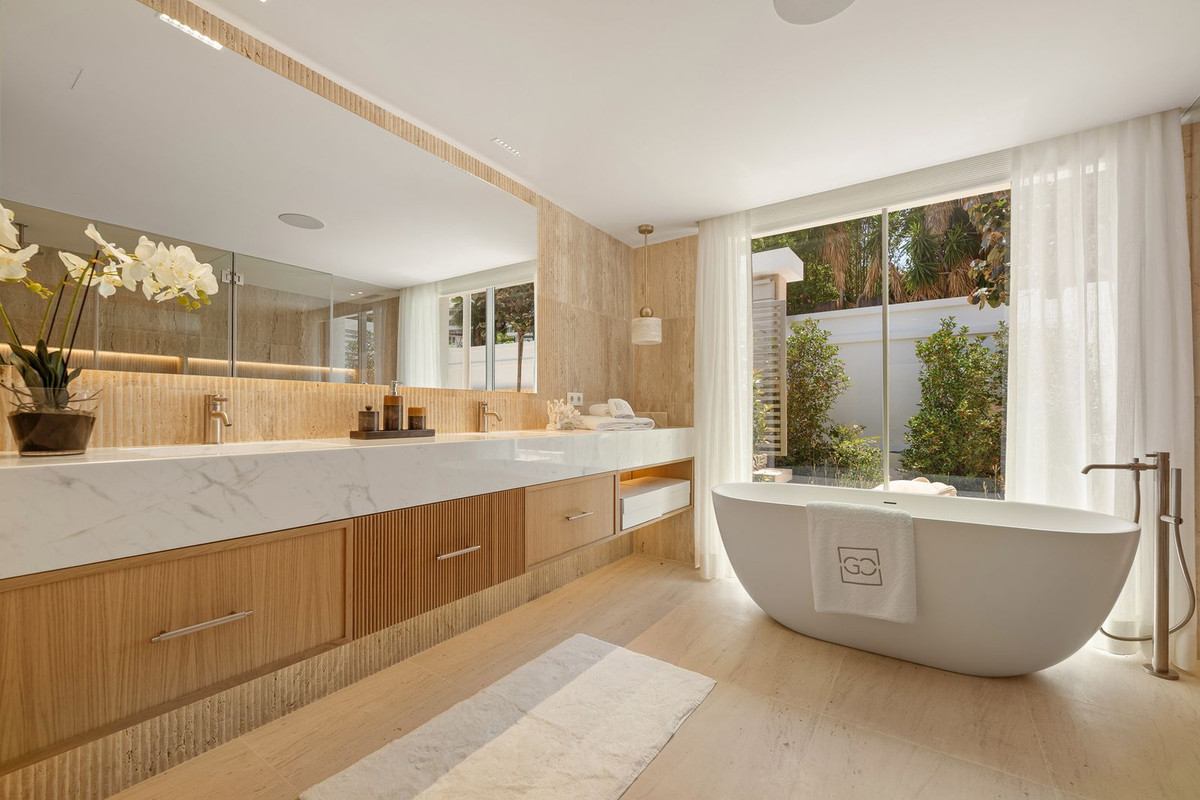 Stunning example of modern Mediterranean architecture by renowned design firm GC Studio. Carefully curated to blend light-toned wood, natural stone, and organic textures, the design achieves a harmonious balance between sophistication and comfort. Every element reflects a commitment to quality and understated luxury.The villa features an open-concept layout that effortlessly connects key living spaces. A state-of-the-art gourmet kitchen flows into a refined dining area and a welcoming lounge, all bathed in natural light. Full-height sliding glass doors create a seamless transition to the expansive outdoor terrace.The main suite offers a private retreat with serene views and elegant finishes. Spacious and peaceful, it includes custom wardrobes and a luxurious en-suite bathroom, designed to provide ultimate relaxation and style.The five-bedroom configuration accommodates both family and guests with ease. Flexible space planning allows for dedicated staff or guest quarters, maintaining privacy and independence for all occupants.The terrace lounge, multiple seating areas, and panoramic views create a captivating atmosphere for entertaining.The villa’s resort-style outdoor setting includes a crystal-clear swimming pool and secluded lounging zones, offering a private wellness experience.