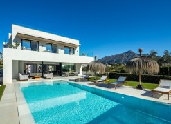 This contemporary villa showcases sleek architectural lines and a minimalist aesthetic that blends beautifully with its natural surroundings. Expansive floor-to-ceiling glass sliding doors invite natural light into every corner while seamlessly connecting the interior with the landscaped outdoor spaces. The design emphasizes openness, clarity, and modern luxury, with finishes that highlight high-end craftsmanship and sophistication.The home’s open-plan layout enhances both functionality and flow, with a central living area that integrates effortlessly with the dining space and kitchen. A striking marble island anchors the modern kitchen, which features premium integrated appliances. The living room opens directly onto the terrace, creating a seamless indoor-outdoor experience ideal for year-round enjoyment.The first floor hosts five well-proportioned bedrooms, each designed to provide privacy and comfort. The master suite is a standout feature, offering direct access to a private terrace and a luxurious en-suite bathroom complete with elegant finishes and abundant natural light.The villa’s generous bedroom distribution makes it well-suited for accommodating family and guests. Rooms can be flexibly adapted for staff or visiting relatives, ensuring privacy and independence across all living zones.Entertainment & Lifestyle AreasAn entire lower level is dedicated to entertainment, complete with a custom-designed bar, television lounge, and relaxed social area—ideal for gatherings, celebrations, or family movie nights. Thoughtful lighting design enhances the space, creating a vibrant yet sophisticated evening atmosphere.With private terraces for sunbathing, shaded chill-out zones, and a solarium ideal for relaxation, the home offers the essence of wellness-inspired living. Residents can also enjoy nearby health clubs and spa facilities within Nueva Andalucía and the Golden Mile.The outdoor areas are crafted for both elegance and comfort. A stylish pergola crowns the far end of the private pool, which is surrounded by sun terraces, landscaped gardens, and a fully equipped outdoor kitchenette with built-in BBQ—perfect for alfresco dining and entertaining under the stars.A private driveway leads to a secure entrance and carport, offering both convenience and discretion.