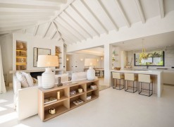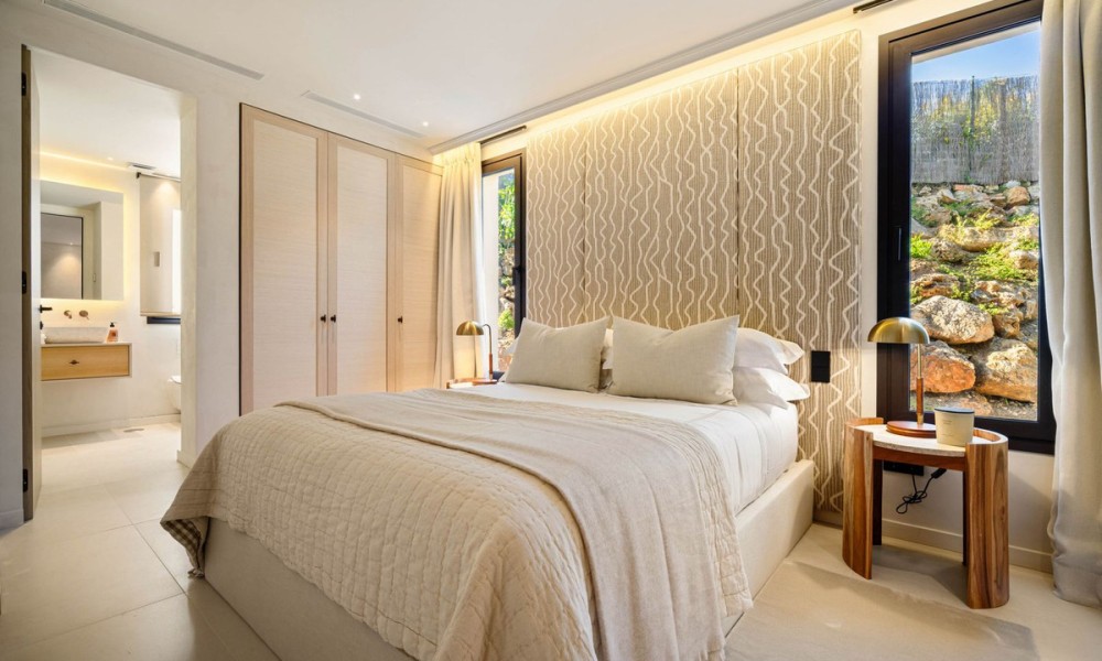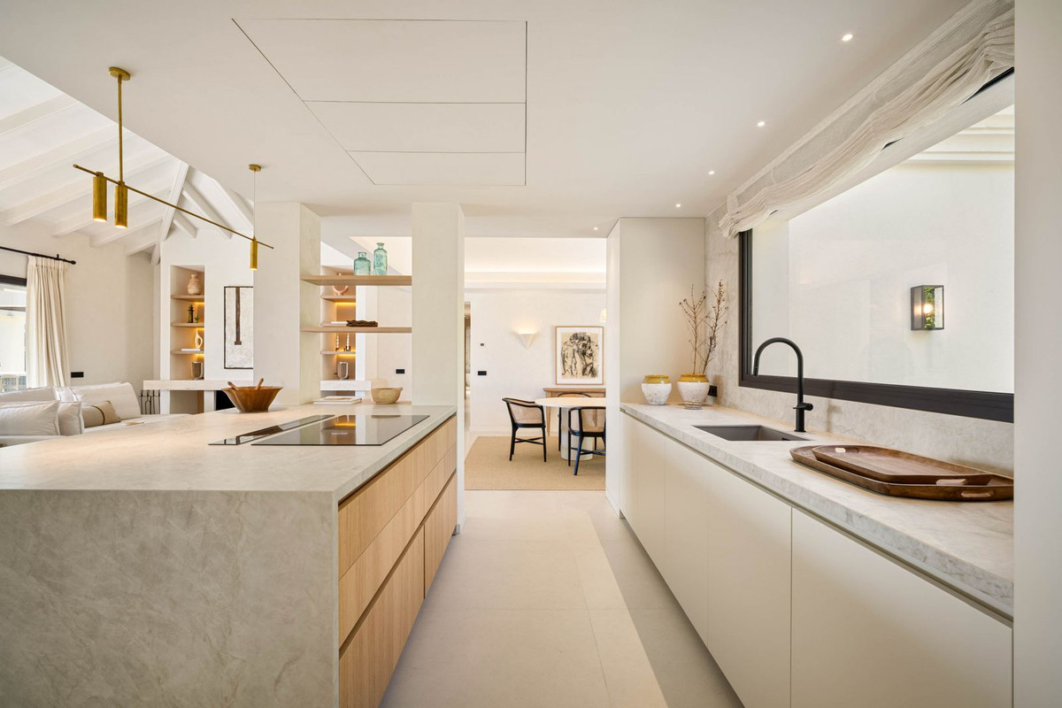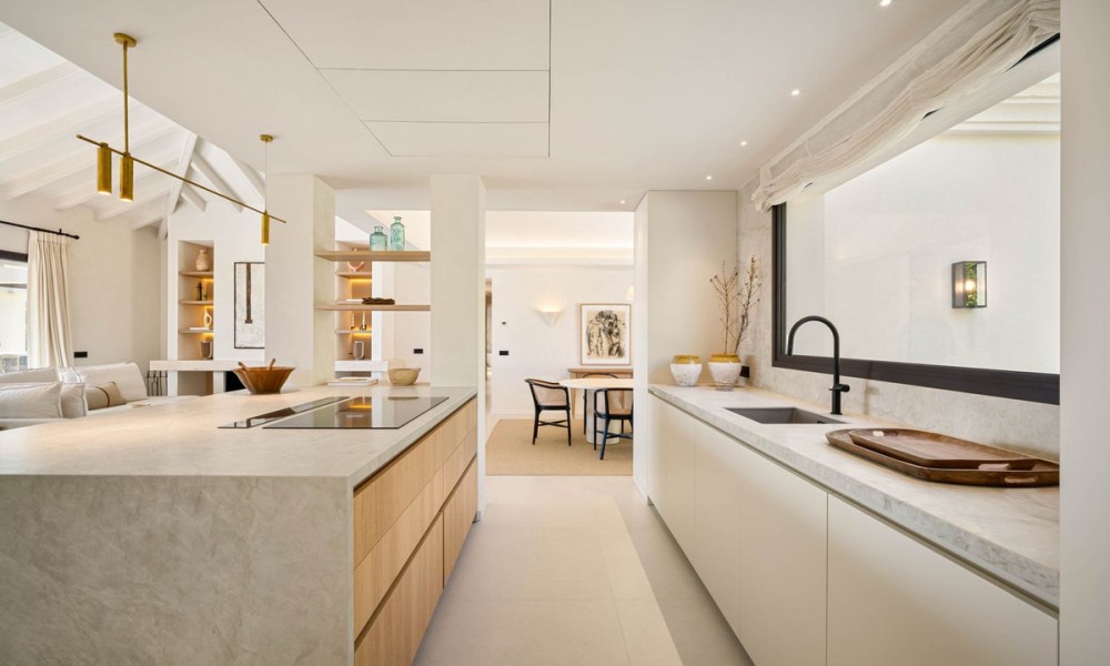 Set within the prestigious residential enclave of Nueva Andalucía, just minutes from the renowned Los Naranjos Golf Course, this beautifully reimagined single-level villa offers a sophisticated blend of Mediterranean charm and modern luxury. Elevated above the lush valley, the property enjoys total privacy, stunning views, and seamless access to Marbella’s most exclusive lifestyle amenities.Crafted by acclaimed developers, the villa showcases a masterful balance of traditional Andalusian architecture and sleek contemporary styling. Vaulted ceilings, natural textures, and a neutral, calming palette create a warm and inviting aesthetic, while thoughtful updates introduce modern design elements and high-end finishes.Designed on a single level, the open-plan living area serves as the heart of the home. With generous proportions and abundant natural light, the space flows effortlessly from the lounge to the dining area and into a fully integrated modern kitchen. Floor-to-ceiling sliding glass doors enhance the indoor-outdoor connection, framing spectacular valley and sea views.The villa includes four generously sized bedrooms, with the principal suite offering direct garden access and tranquil views. Custom wardrobes, soft ambient lighting, and high-quality materials ensure a serene and luxurious atmosphere, while the en-suite bathroom combines function and indulgence with sleek, modern fittings.The three additional bedrooms offer flexibility for guests or family, each with ample space, natural light, and stylish finishes. The layout ensures privacy for all occupants, making the home ideal for both permanent living and hosting.This home is built for entertaining and enjoying the Marbella lifestyle. A spacious outdoor terrace features a sunken lounge with built-in seating, an alfresco dining zone, and a fully equipped outdoor kitchen. The striking pool is visually integrated into the landscape, enhancing the property’s resort-style ambiance.The villa’s tranquil layout is complemented by carefully designed wellness elements, including a private rooftop terrace with panoramic views—ideal for yoga, meditation, or sunbathing—as well as a peaceful internal courtyard with a water feature, offering a calming space for reflection.