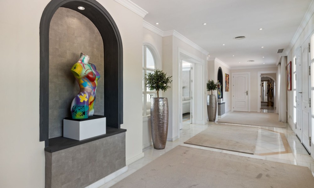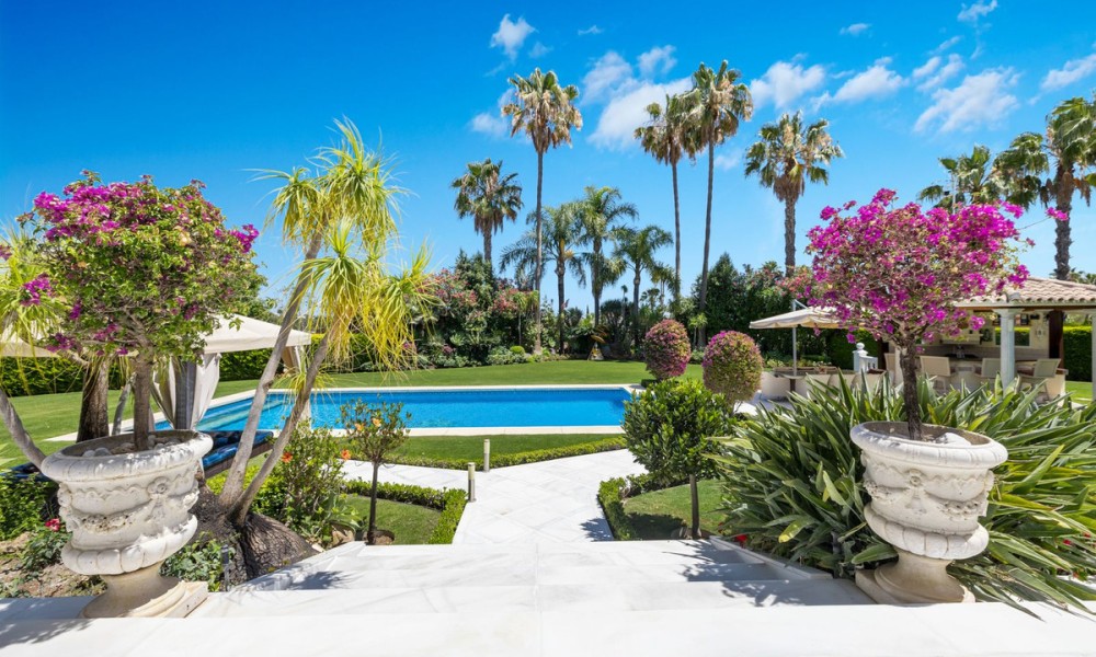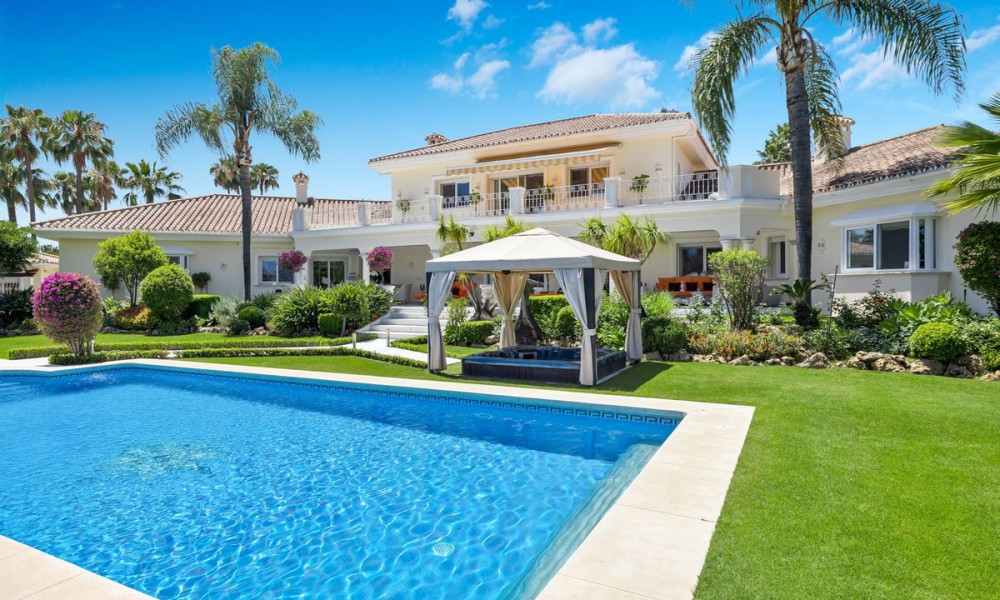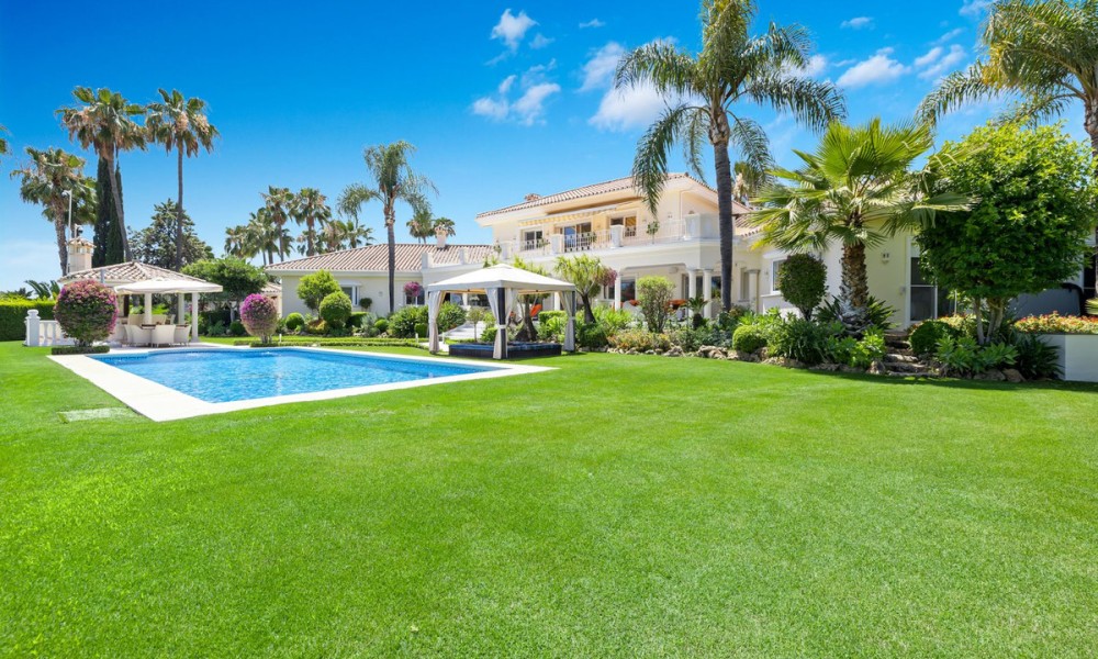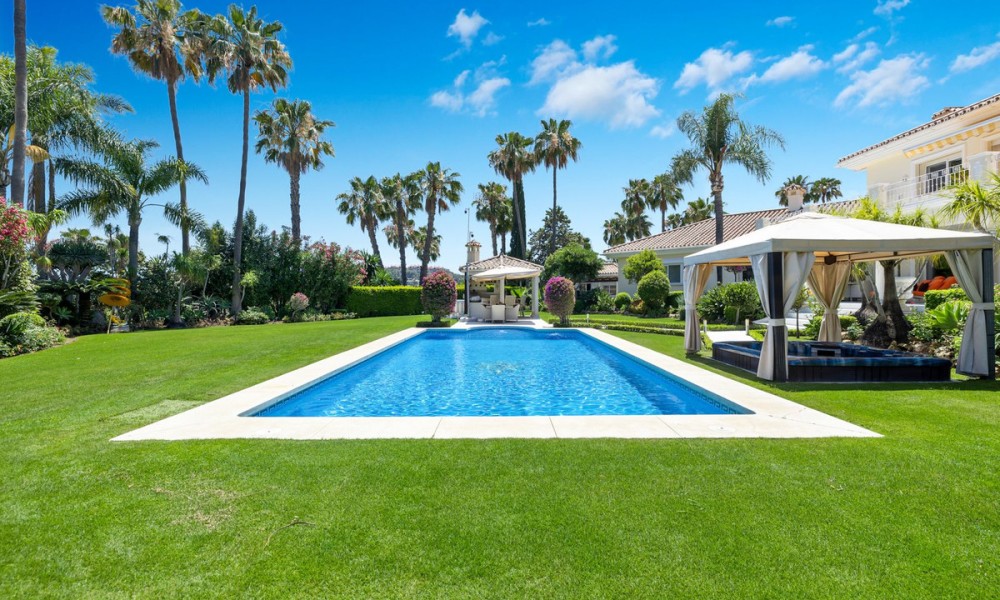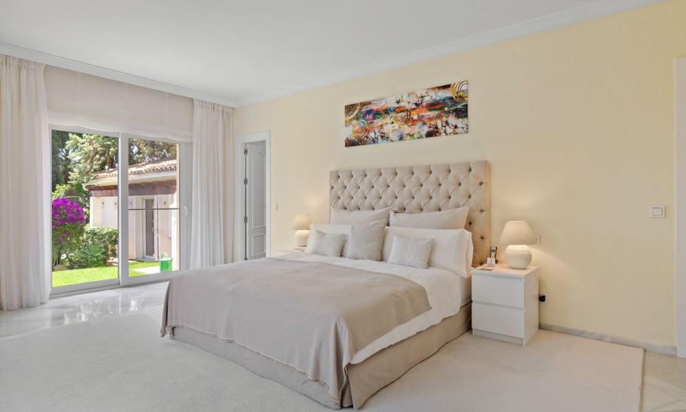 Fabulous Luxury Villa with La Concha Views | Nueva Andalucía, MarbellaA stunning villa that perfectly blends contemporary design with timeless Andalusian charm. Recently renovated and situated in one of Nueva Andalucía’s most sought-after residential areas, this south-facing residence enjoys exceptional privacy, tranquillity, and magnificent views of La Concha mountain.The main level welcomes you with a grand entrance hall, soaring ceilings, and an elegant living area with a feature fireplace. The open-plan dining space flows into a fully fitted kitchen equipped with premium Siemens and Neff appliances, complemented by an impressive entertainment bar. This floor also hosts four en-suite guest bedrooms, an office, a guest toilet, and a laundry area. Expansive terraces lead directly to the manicured gardens and a beautiful pool area designed for relaxation and entertaining.