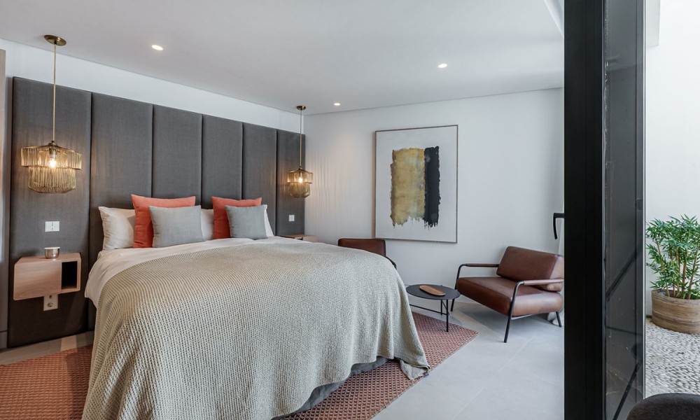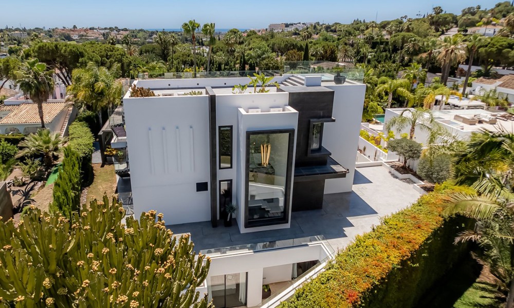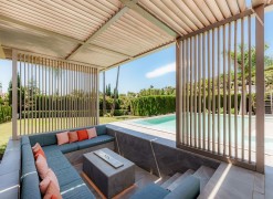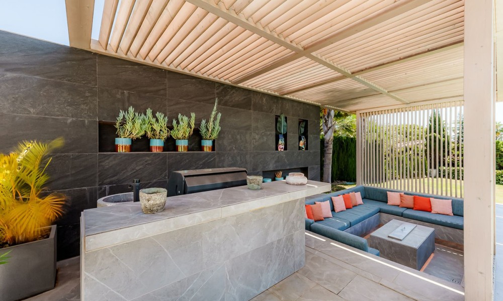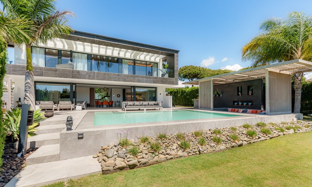 Contemporary Luxury Villa with Ocean and Golf Views | Las Brisas, Nueva AndaluciaExperience modern luxury in this striking south-facing residence located in the heart of Las Brisas, one of Nueva Andalucia’s most prestigious enclaves. Designed for refined living, the property perfectly balances style, comfort, and functionality within a serene golf community. The villa features a sleek open-plan kitchen with premium Gaggenau appliances and a spacious living area that flows effortlessly onto beautifully landscaped gardens and a private pool.