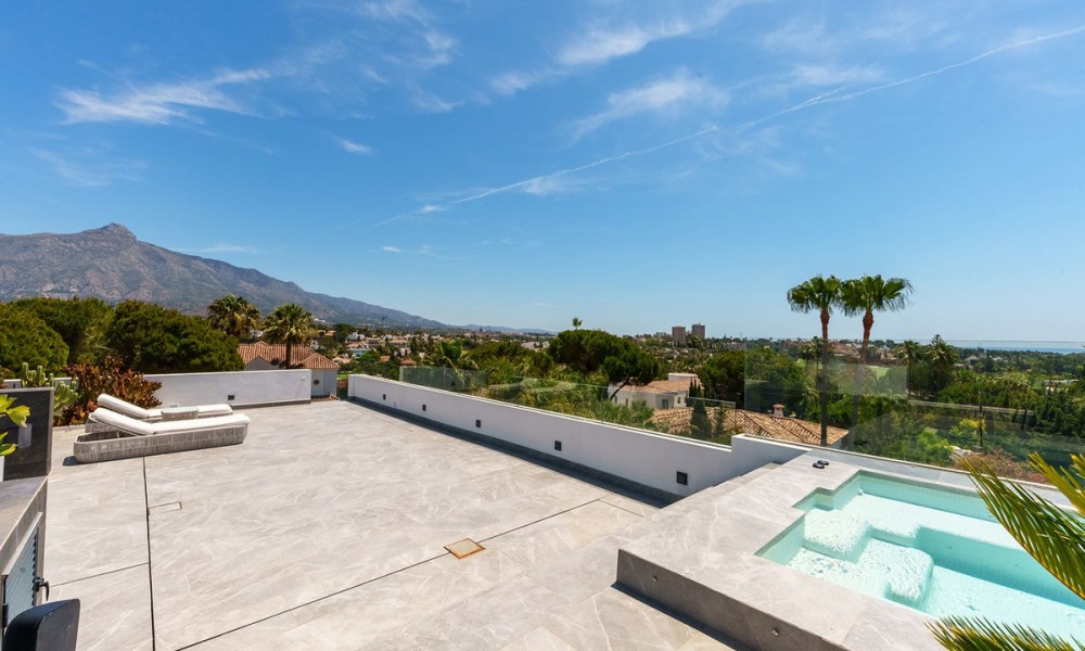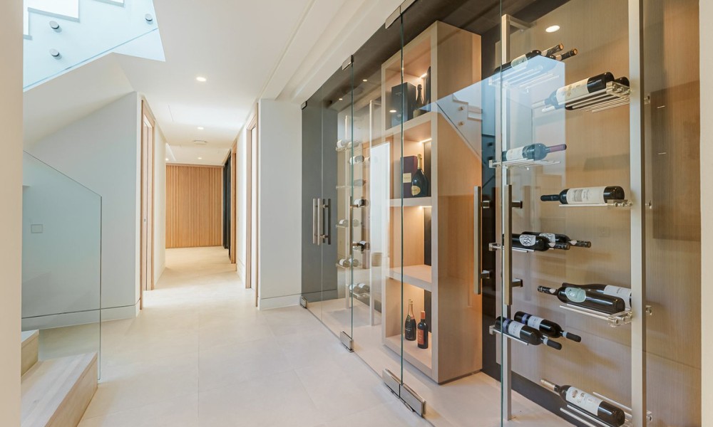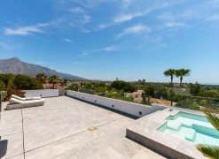 The upper level hosts an impressive master suite opening onto a magnificent terrace with panoramic ocean views, creating the ultimate retreat.Exceptional lifestyle amenities include a private gym, sauna, and Jacuzzi, complemented by a two-car garage, aerothermal system, and central air conditioning. With its elegant design, seamless indoor-outdoor flow, and breathtaking golf, mountain, and sea vistas, this home offers an unrivalled living experience in Nueva Andalucia.