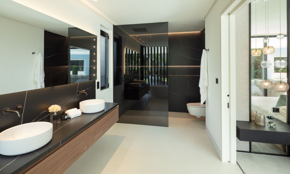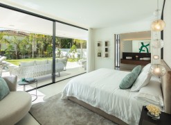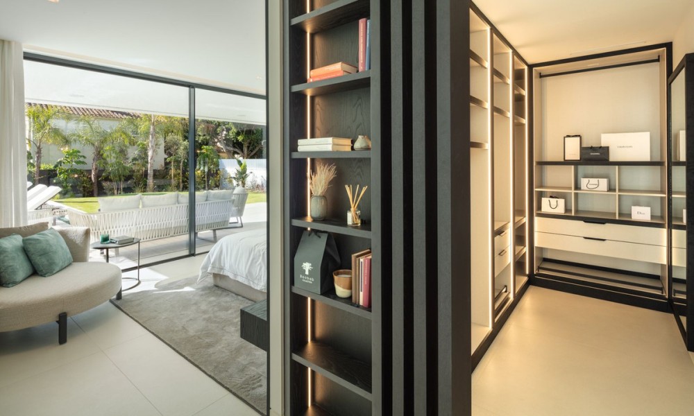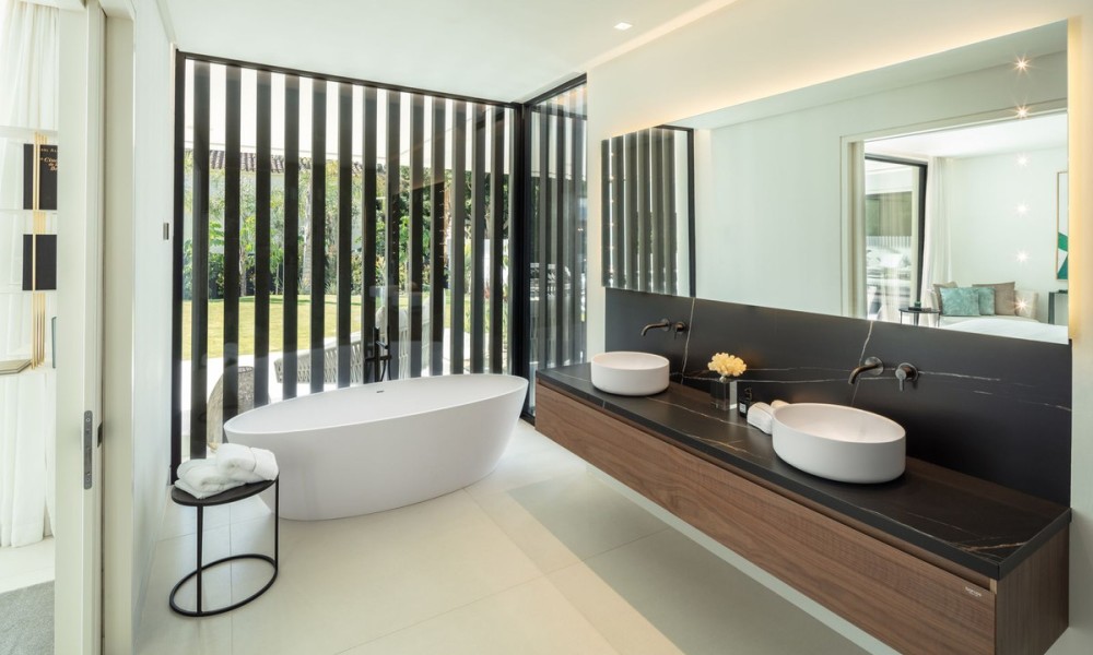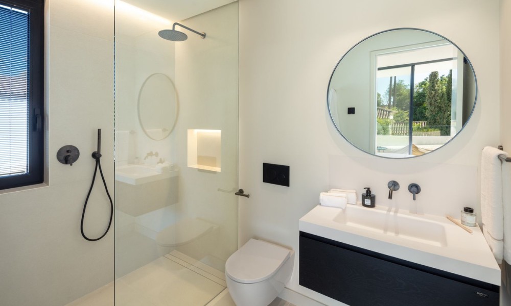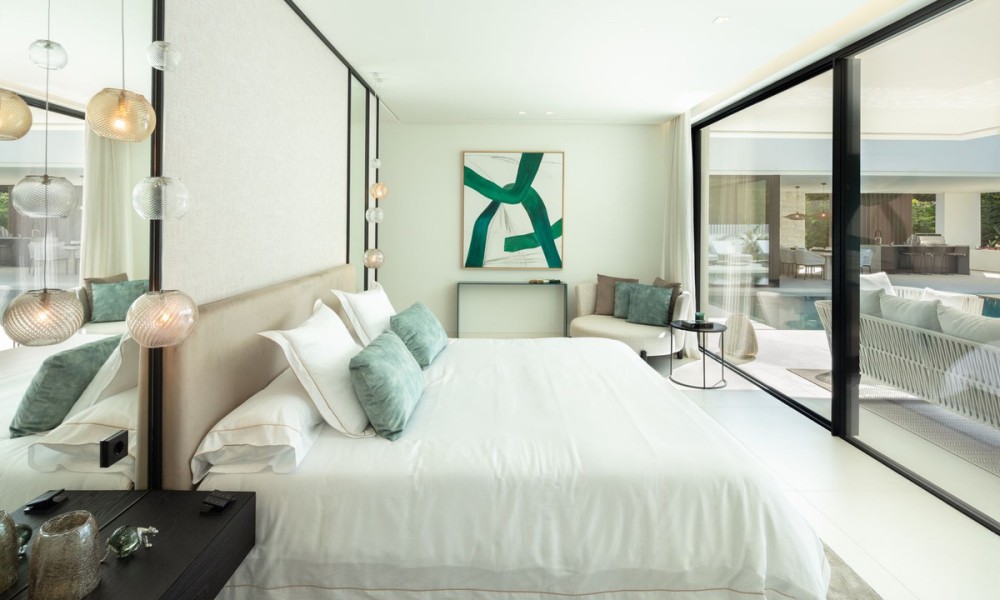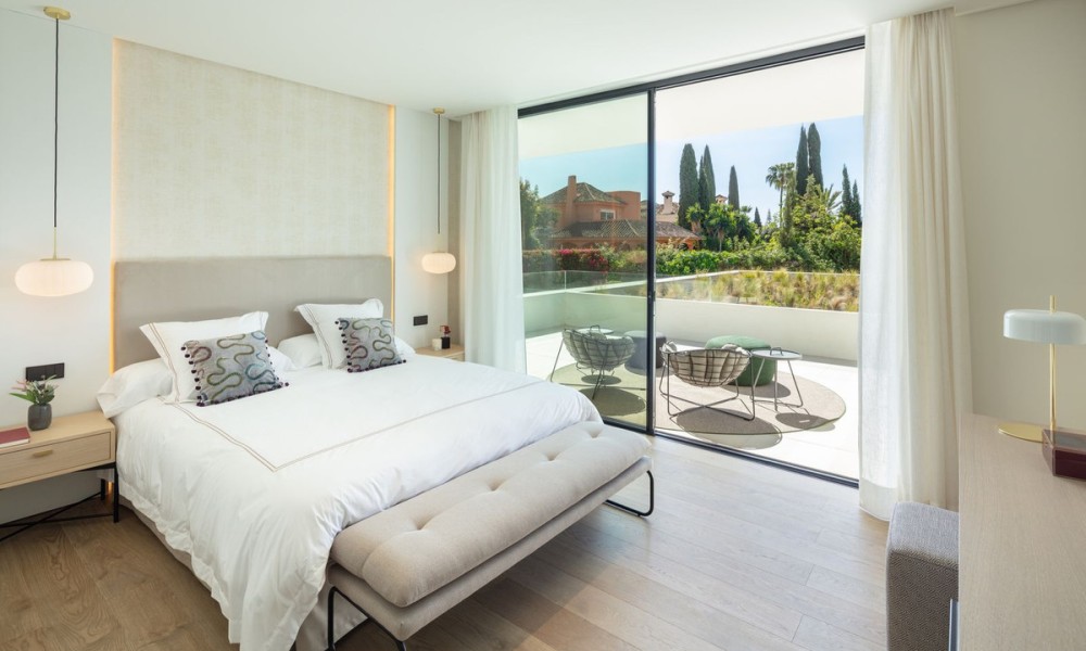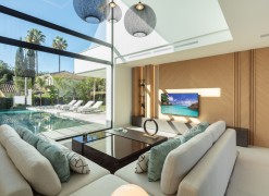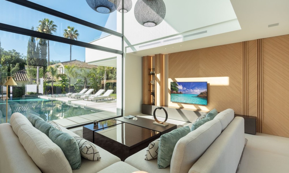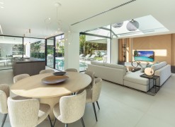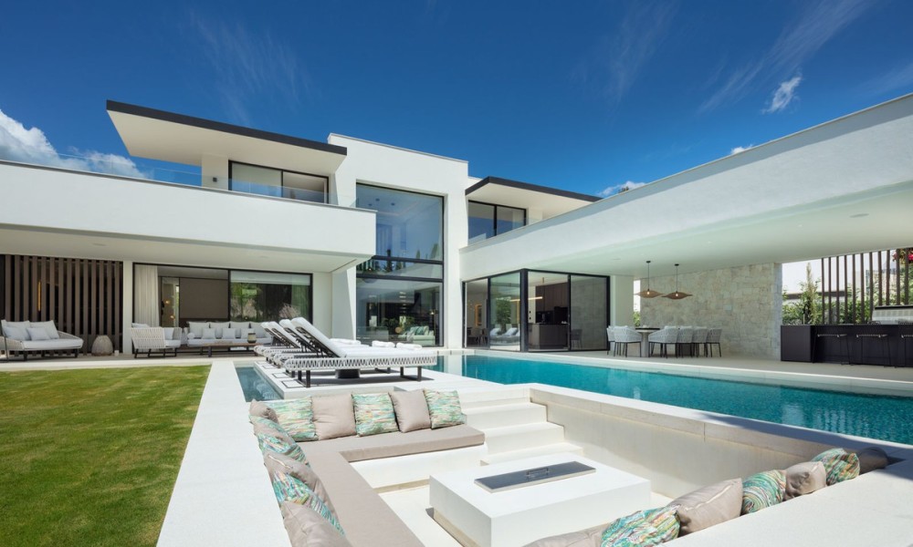 Nestled in the prestigious enclave of Las Brisas within Nueva Andalucía, Villa Sirius stands as a premier example of contemporary architectural excellence. This sophisticated residence, offers an expansive 476 m² of built area set upon a generous 1.200 m² plot that prioritizes both privacy and style. The property is defined by its seamless integration of indoor and outdoor environments, utilizing floor-to-ceiling windows throughout to create a bright, airy atmosphere that flows naturally from the living spaces to the beautifully landscaped gardens and private swimming pool.The heart of the home features an open-plan design where a luminous living room and formal dining area transition into a modern, fully equipped kitchen outfitted with high-end appliances. For more casual gatherings, the outdoor terraces extend the living space significantly, offering a dedicated kitchenette, a dining area, and a unique sunken chill-out lounge designed for entertaining under the sun or stars.