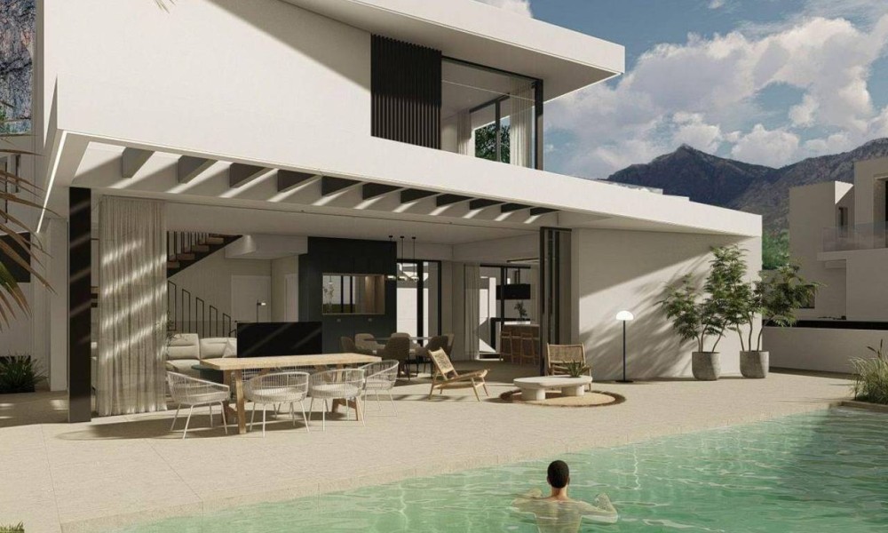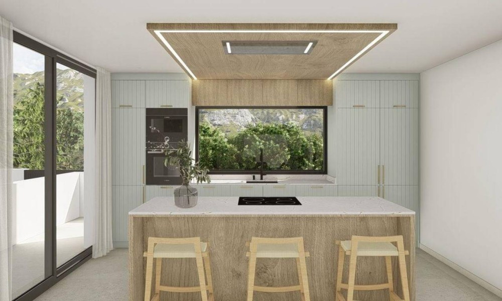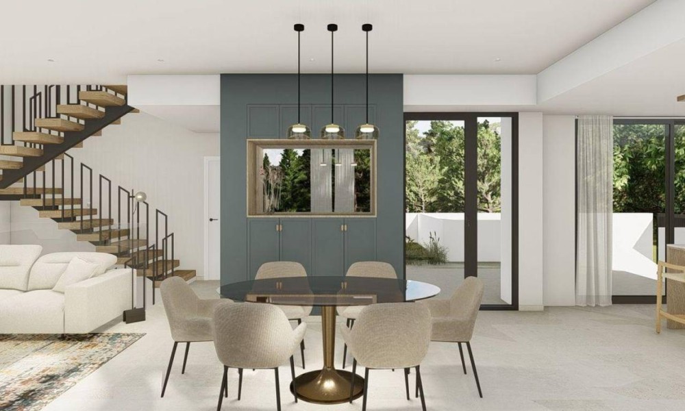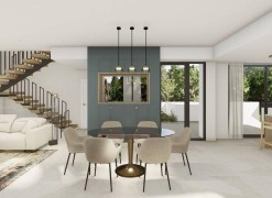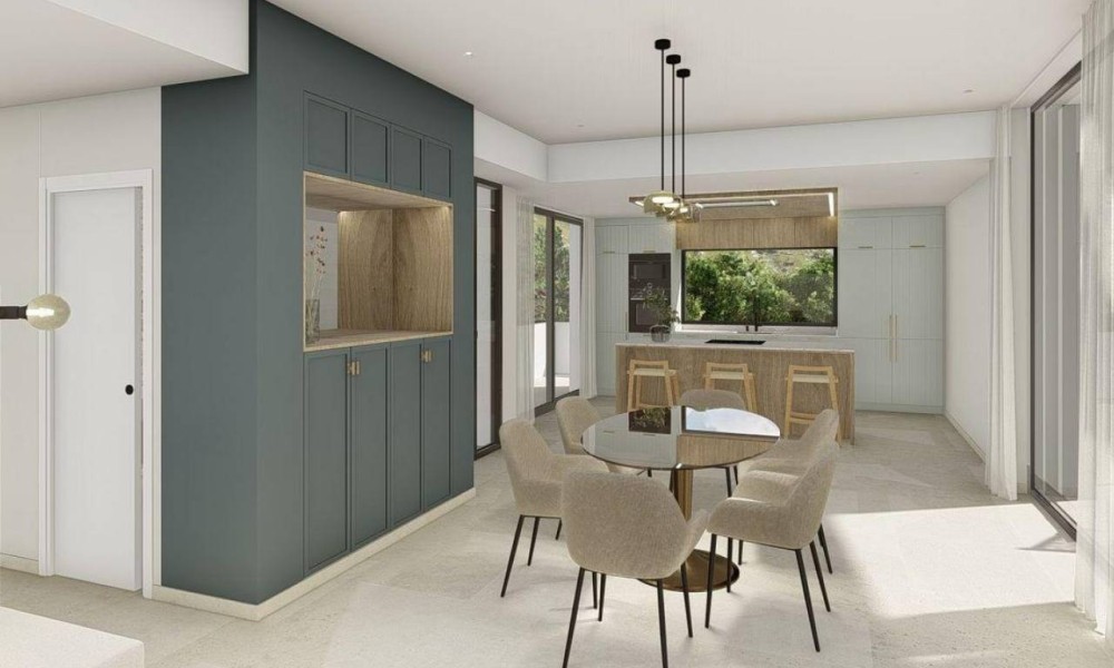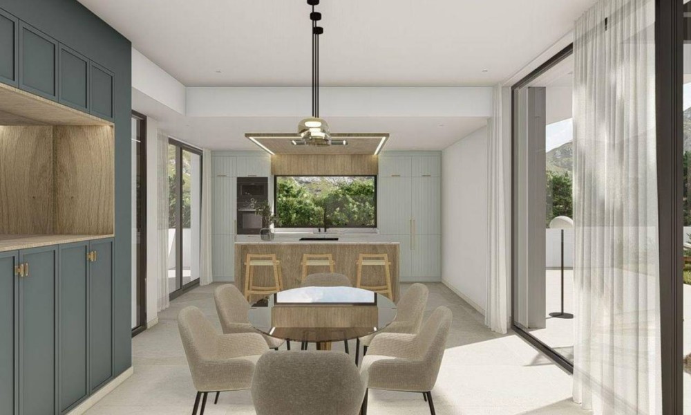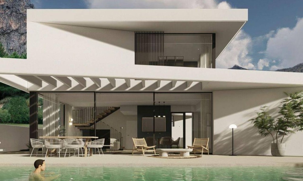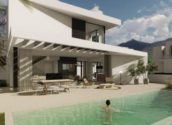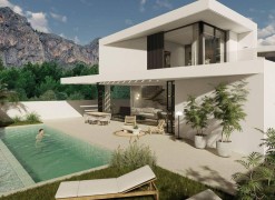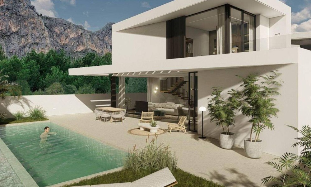 This new villa in Polop offers spacious living across three floors with three bedrooms (option for a fourth), three en suite bathrooms, and an open-plan kitchen and living area opening onto a terrace with a private infinity pool. It includes a large basement for extra space and a closed garage.