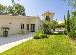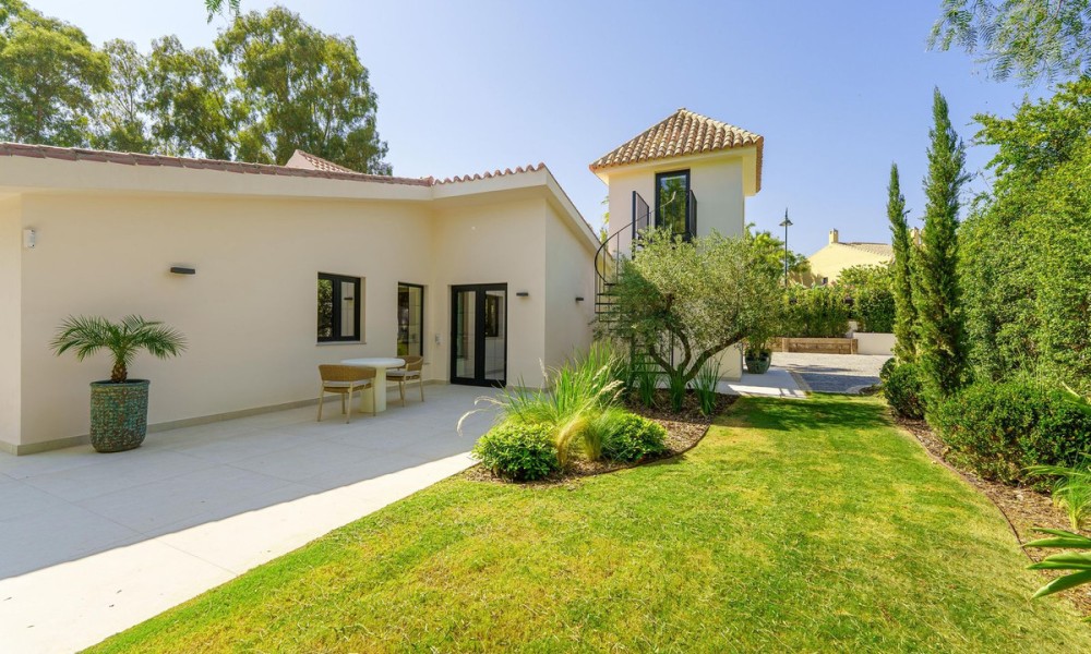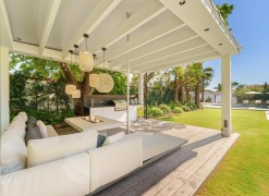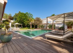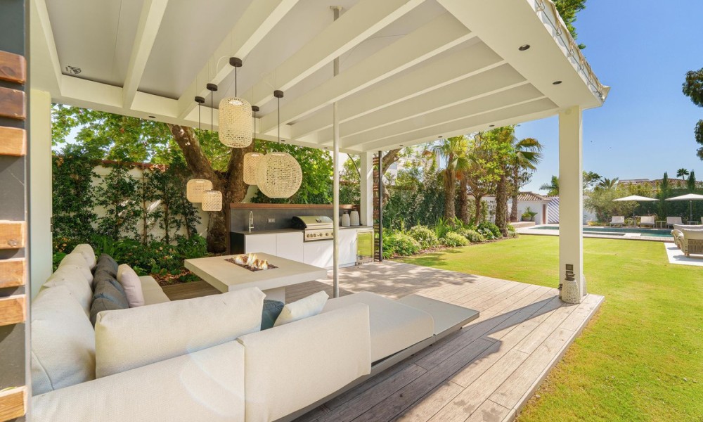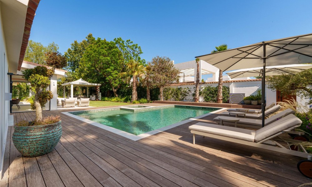 Complementing these quarters are five well-appointed bathrooms and additional guest toilets, ensuring privacy and comfort for residents and visitors alike.Outdoor living is prioritized through a meticulously landscaped garden designed for both high-end entertaining and quiet relaxation. A large heated private pool and integrated jacuzzi are bordered by an elegant bamboo deck, while a covered outdoor kitchenette with a built-in BBQ and a stylish pergola lounge area maximize the Mediterranean climate. Multiple chill-out zones and an automatic irrigation system further enhance this secluded exterior space.Positioned with a southern orientation to capture year-round sunshine, the property sits on a generous, private plot. The entrance is marked by a driveway finished in premium Portuguese stone, leading to parking facilities for multiple vehicles. Residents benefit from a prime location near the coast, offering the luxury of being within walking distance to world-class marinas, designer boutiques, and upscale beach clubs.