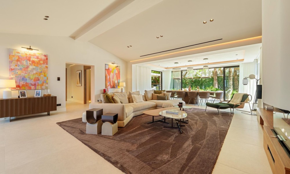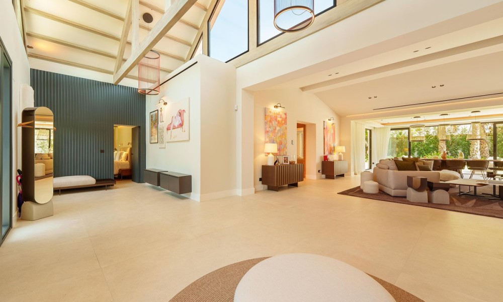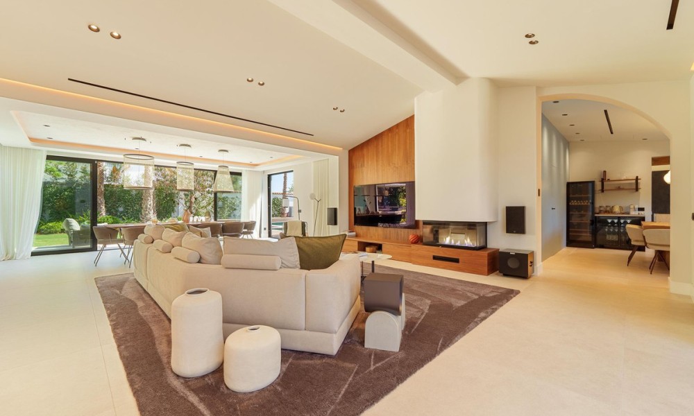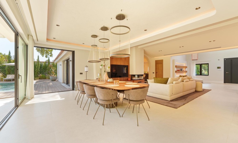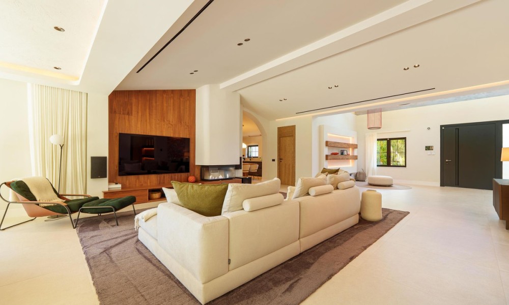 Located just minutes from the vibrant Puerto Banús, this exceptional one-level villa delivers refined contemporary living with an emphasis on effortless indoor-outdoor flow. The architectural design is defined by clean lines, high-end finishes, and a striking double-height entrance hall featuring a geometric roofline that adds significant flair. Integrated smart home technology allows for seamless control of lighting, climate, and security via mobile devices, while German aluminum windows provide superior insulation.The interior layout blends soft minimalism with warm natural tones, centered around expansive open-plan interiors. A cozy living space anchored by a fireplace and custom cabinetry flows into a generous dining area. The kitchen is fully equipped for culinary enthusiasts, featuring a central island that serves as a focal point for social interaction. This single-storey configuration ensures the entire home is accessible and remains deeply connected to the surrounding environment.The sleeping quarters consist of five spacious bedrooms, including a primary suite designed as a private sanctuary. This suite opens directly onto the pool terrace and features a luxurious bathroom equipped with a freestanding tub and a walk-in shower.