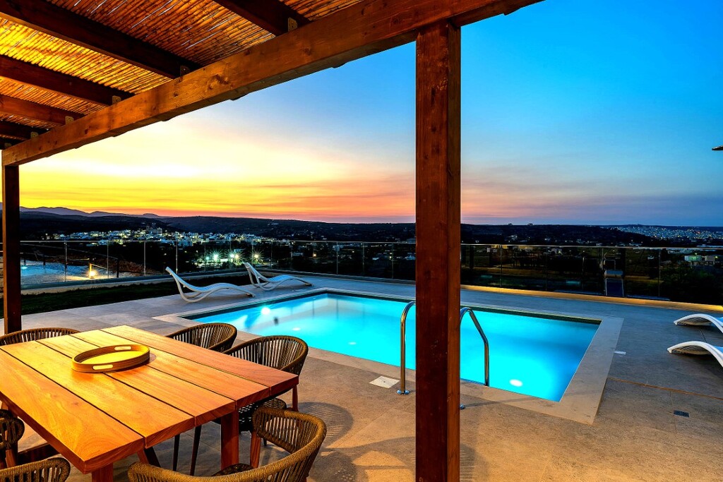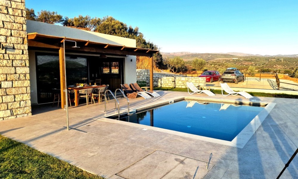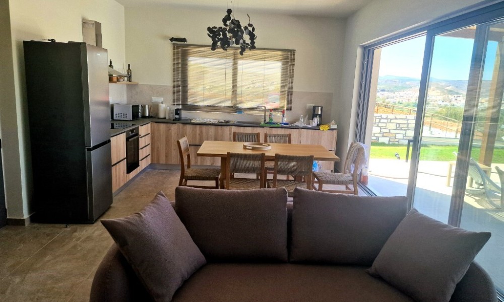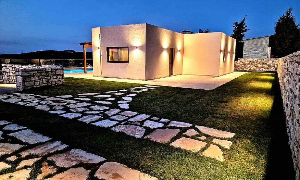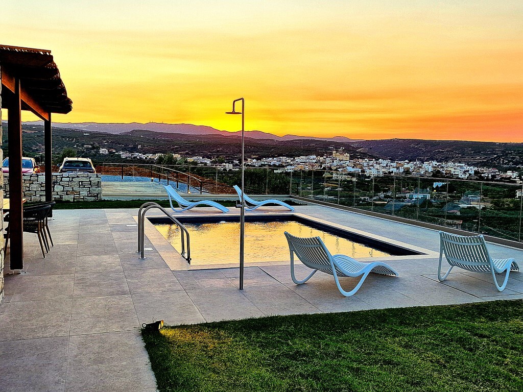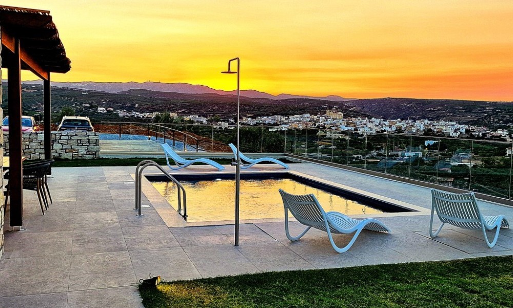 For sale 1-storey villa of 95 sq.meters in Crete. Villa consists of 2 bedrooms, living room with kitchen, one dining room, 2 shower WC. A magnificent view of the city, the sea, the mountain, the forest opens up from the windows. There are: solar panels for water heating, air conditioning, heating. The owners will be leaving the furniture with the sale. There is an alarm system installed. Extras included with the property: parking space, garden. The property boasts a swimming pool of private use.