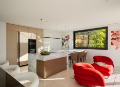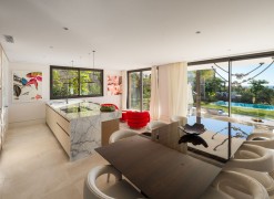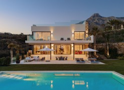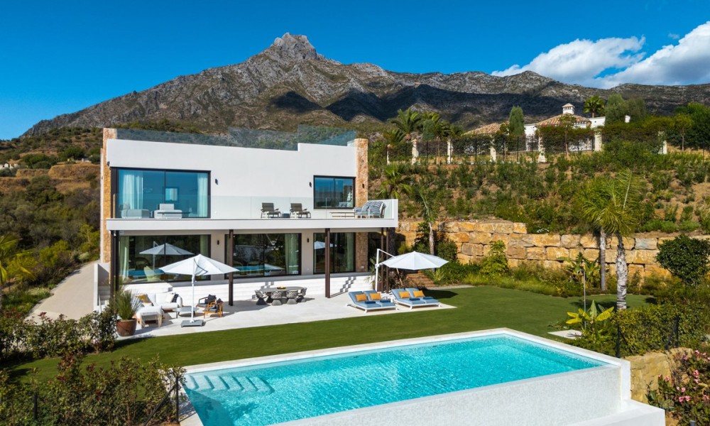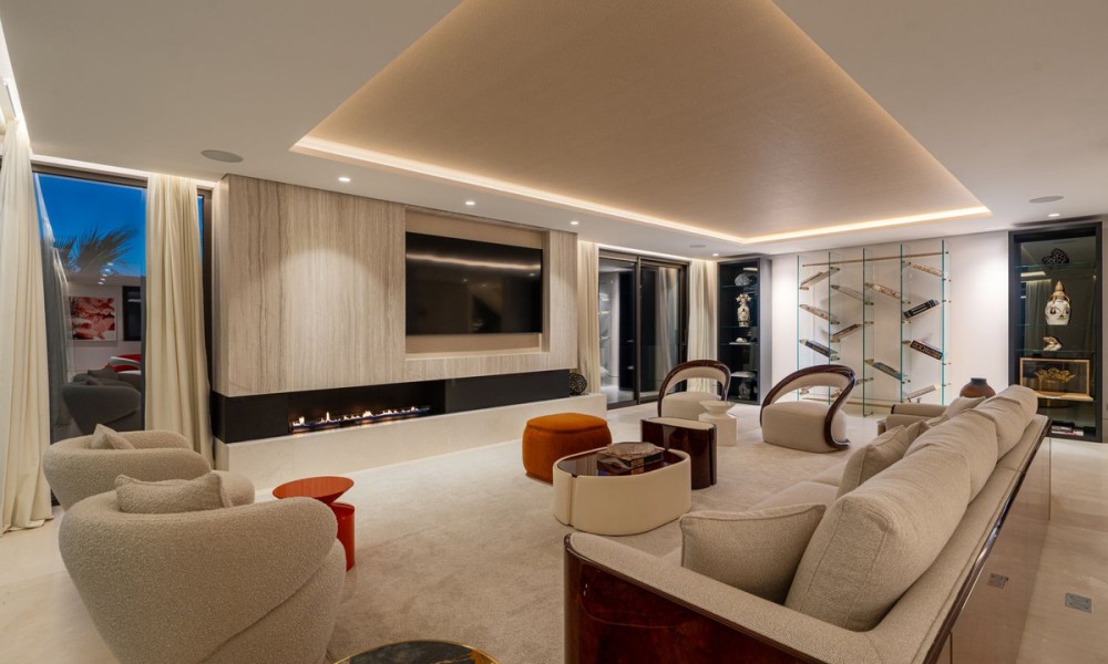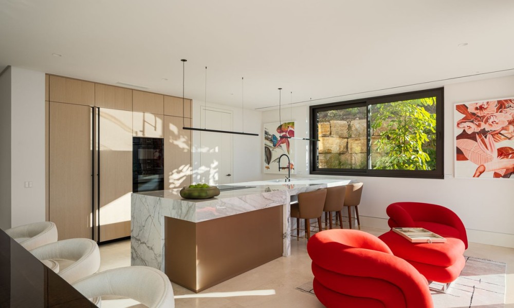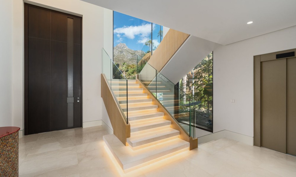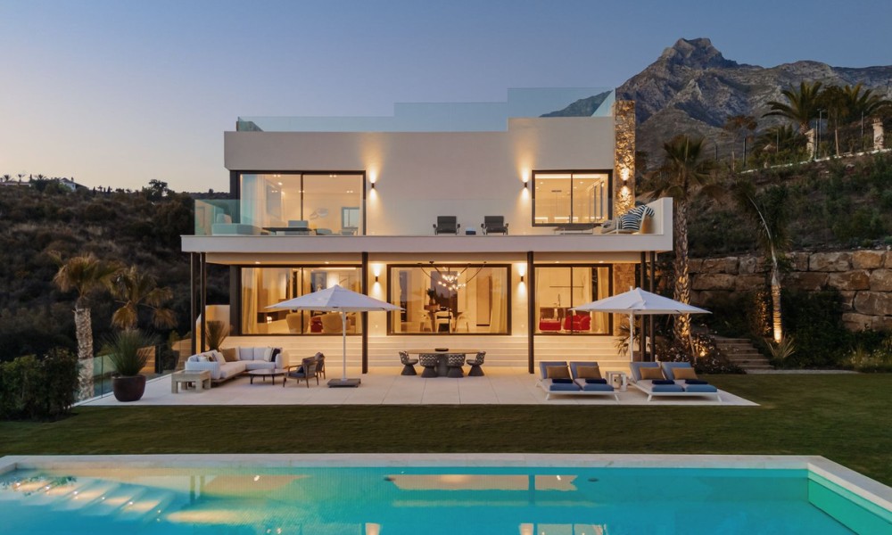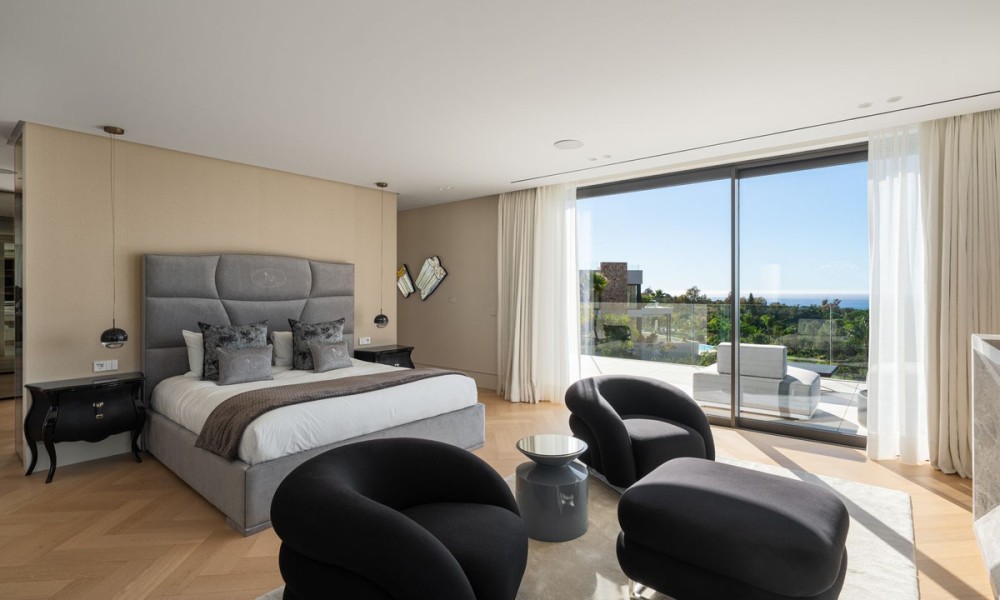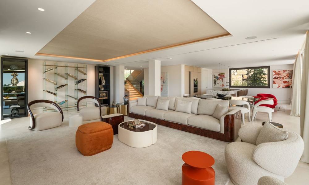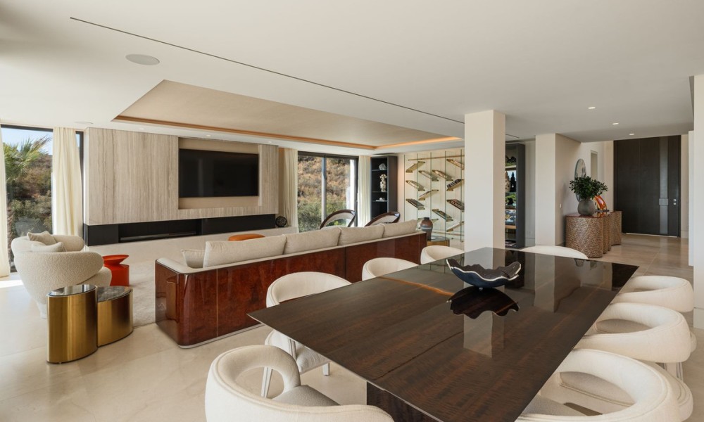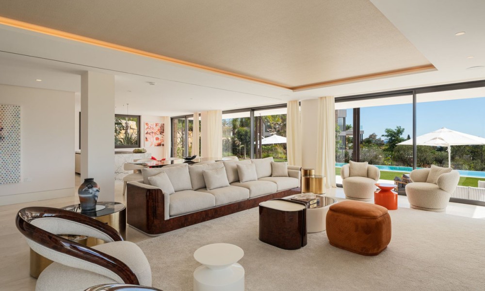 Set within the exclusive enclave of Marbella Hill Club on the Marbella Golden Mile, this newly built contemporary villa offers 885 m² of refined interior space on an expansive 3,003 m² plot, complemented by 467 m² of terraces . Clean architectural lines are softened by natural stone detailing, warm wood finishes and marble accents, creating a balanced design that feels both modern and timeless. A neutral colour palette enhances the sense of tranquillity, while floor-to-ceiling glazing frames the surrounding greenery and Mediterranean Sea.The layout has been carefully conceived to combine openness with subtle separation. The main living area flows effortlessly into the dining space and a state-of-the-art kitchen fitted with premium appliances and a wine cooler, making it ideal for both everyday living and entertaining. Large sliding doors connect the interiors directly to the terraces and garden, reinforcing the indoor-outdoor lifestyle for which the Golden Mile is renowned.Five generously proportioned bedrooms and six bathrooms ensure comfort and privacy for family and guests. The principal suite enjoys elevated views, a refined bathroom with double vanities, walk-in shower and freestanding bathtub, and direct access to private terraces. Additional guest accommodation is equally well appointed, while two guest toilets add practicality for entertaining.