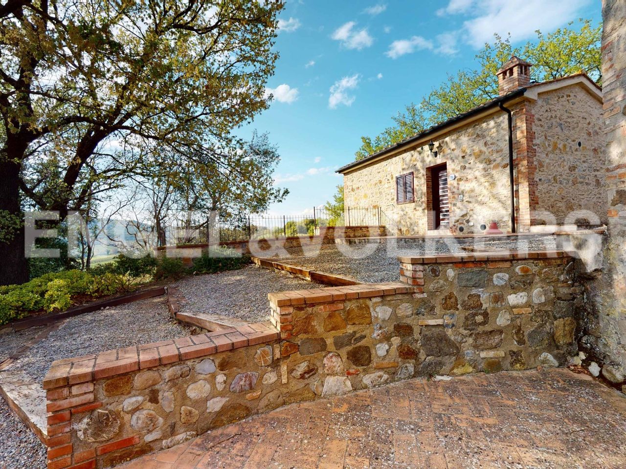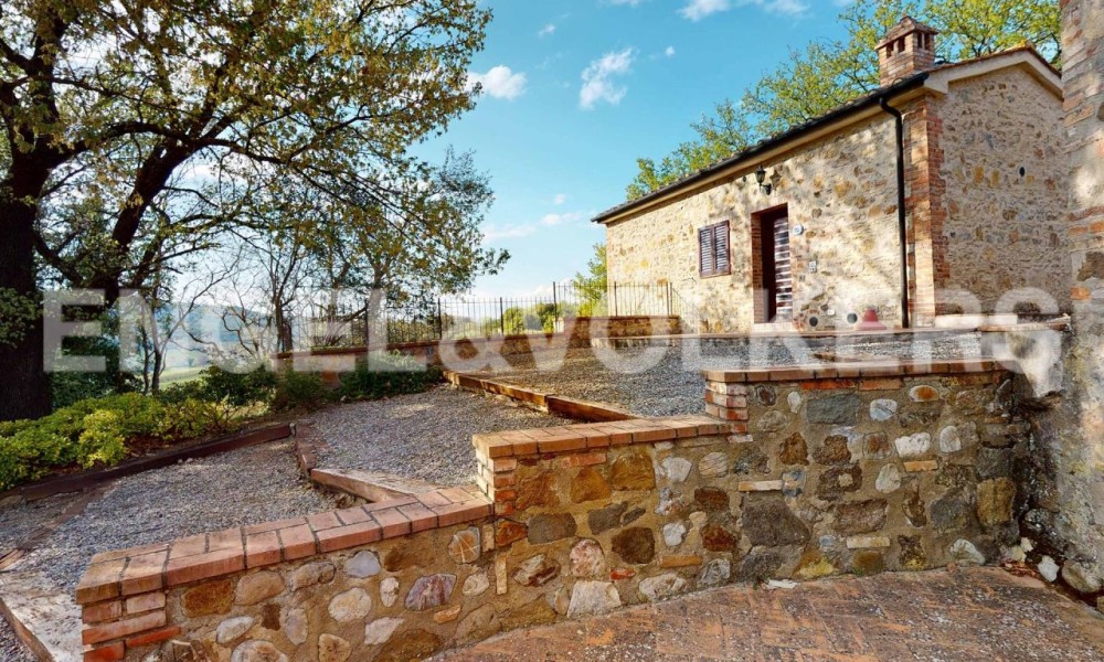 The cosy ground floor apartment with private terrace, also includes a garage. The first outbuilding consists of two bedrooms each with ensuite bathroom, a large, open plan kitchen to the dining / living room which leads to a large terrace for outdoor dining enjoying the privilege of a beautiful panorama of the surrounding countryside. The second annex includes a small independent apartment consisting of a living room with kitchenette, a bedroom, bathroom, garage, and wine cellar. The fourth building is the garage / warehouse which is currently used as a shelter for agricultural tools and machinery. Each entrance door has its own private terrace and the buildings are surrounded by about one hectare of private, fenced garden, with a panoramic swimming pool, olive grove and parking area.
