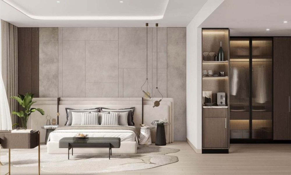 Grand, full-height statement entrance door with a smart lock system. Floor-to-ceiling glass panels. High quality wooden-look flooring on the First and Second Floors. Welcoming foyer with natural light illumination from the upper window. Feature staircase with an elegantly designed handrail and premium marble steps. Dedicated Laundry room. High-quality ironmongery and hardware by Hafele or equivalent for the front-of-house door. Dedicated Maid’s room with bathroom. Elegantly designed front-of-house full-height door with fixed panels above. Marble flooring on the Ground Floor and staircase on all levels. All bedrooms have en-suite bathrooms and high-end, fully fitted walk-in closets.