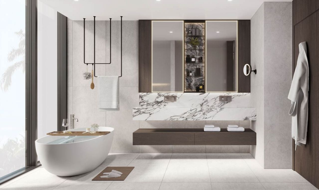 High-quality faucet with features (Franke or equivalent). Kitchen cabinetry features a combination of natural wood veneer and high-quality laminate. European ironmongery hinges and handles (Hafele or equivalent). Premium accessories such as pull-out waste bin, pull-out spice rack, tip-out tray, and handling rail