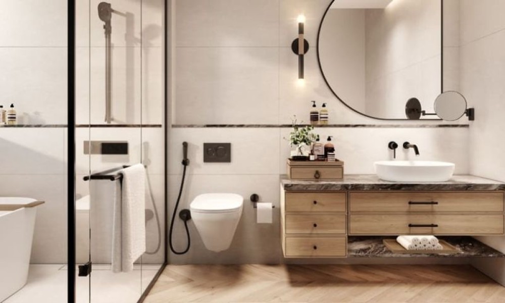 The living rooms showcase high ceilings, creating a sense of openess and grandeur, while floor to ceiling double glazed vsion panels allow for abundant natural light and uninterrupted views. Private balconies create a seamless indoor-outdoor living experience. Floors are adorned with patterned tile adding both texture and sophistication to the space. The blend of premium materials and open, airy design create a warm ambience, perfect for both relaxation and entertaining.