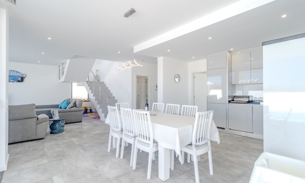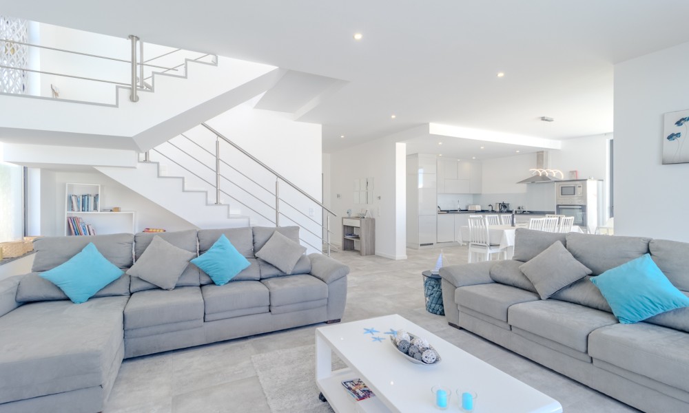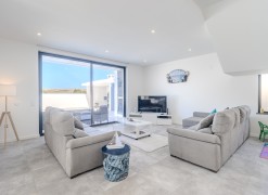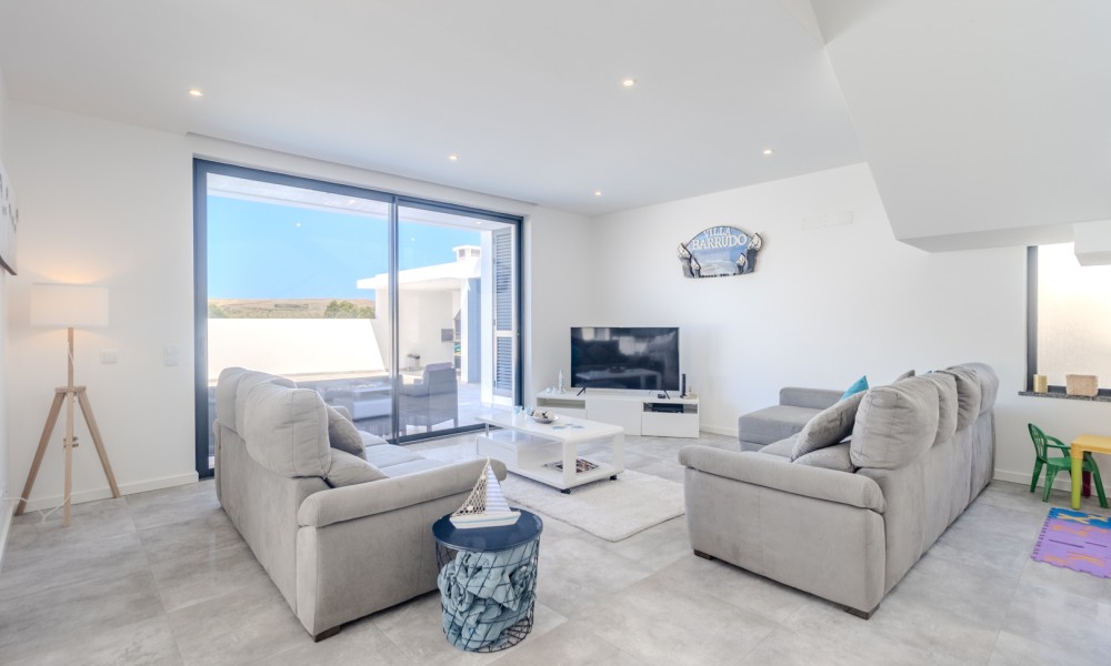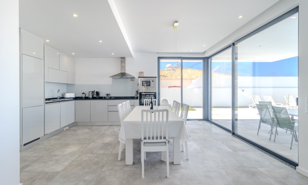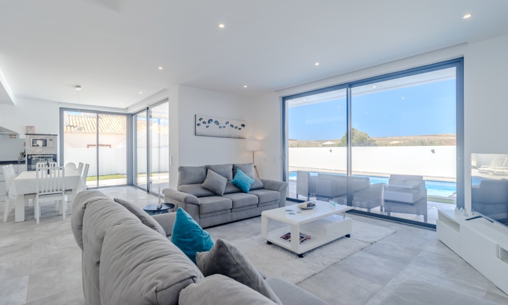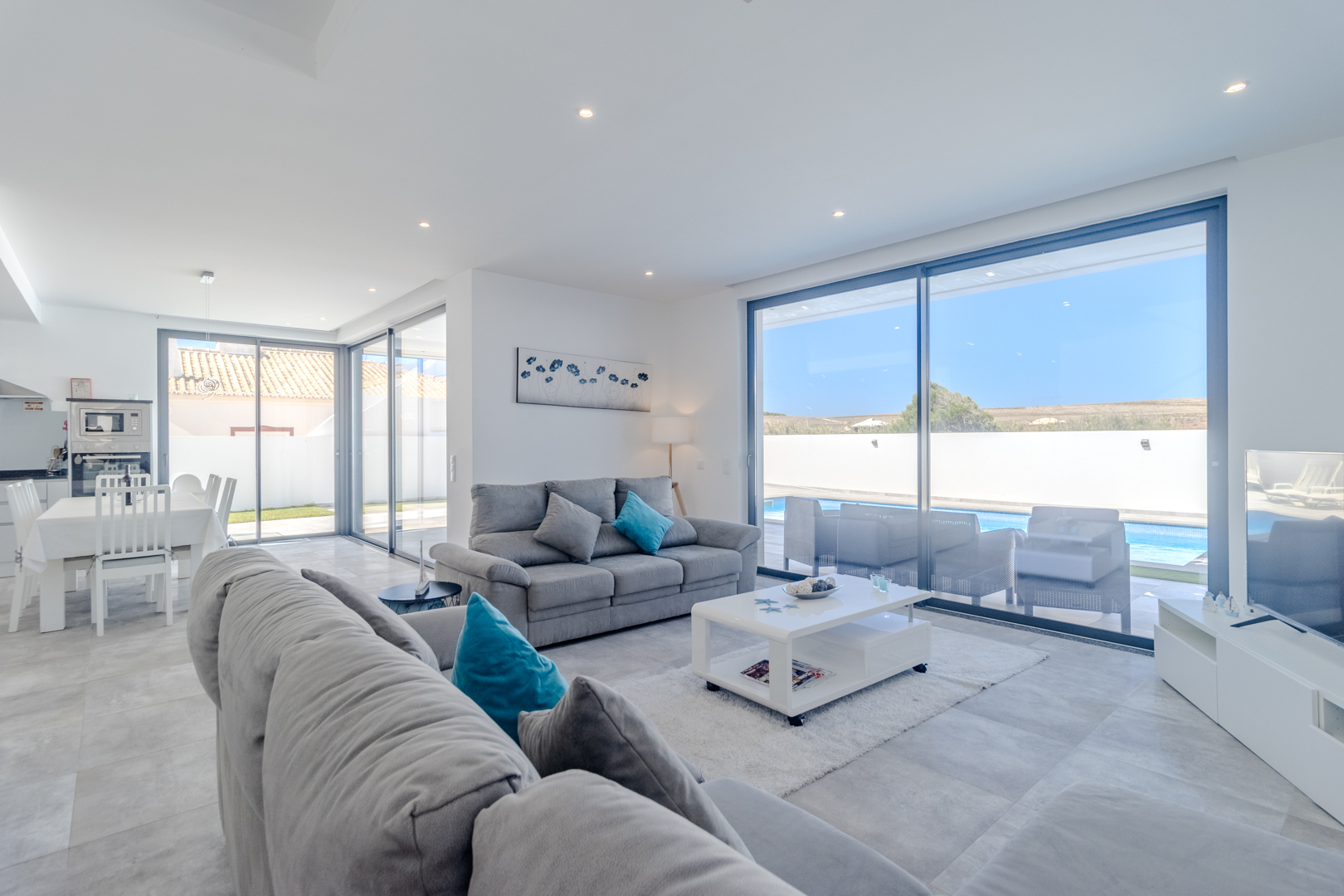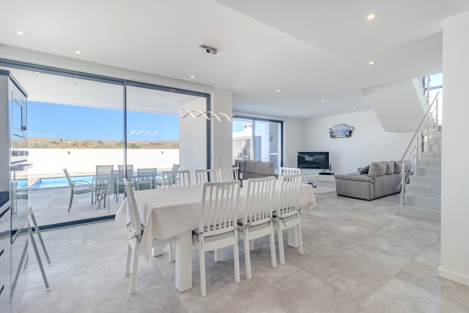 This charming 2+1 bedroom villa is located in picturesque Vila do Bispo and offers a perfect blend of modern comfort and natural beauty.Inside, the bright and well-distributed rooms offer all the necessary comforts for contemporary living. The large living room with an open dining area has large floor-to-ceiling windows that let in natural light and create a cozy and bright atmosphere. There is also a modern and fully equipped open-plan kitchen. On the ground floor, there is also a bathroom with a shower and an additional room that used to serve as a garage but can easily be converted back into a garage if required.Upstairs, there are two comfortable bedrooms, both with en-suite bathrooms. The master bedroom has a small sitting area, and is part of a walk-in closet.The property has pre-installation of underfloor heating and air conditioning.The property’s highlight is the large pool, which is illuminated at night and invites you to take a refreshing dip on summer days while enjoying the breath-taking view of the Algarve landscape.The spacious terrace is the perfect place to dine al fresco, barbecue, cook, or relax in the sun.