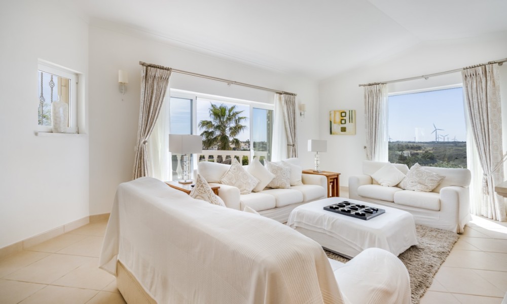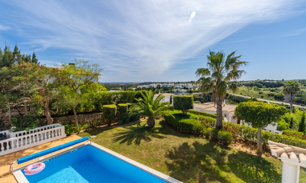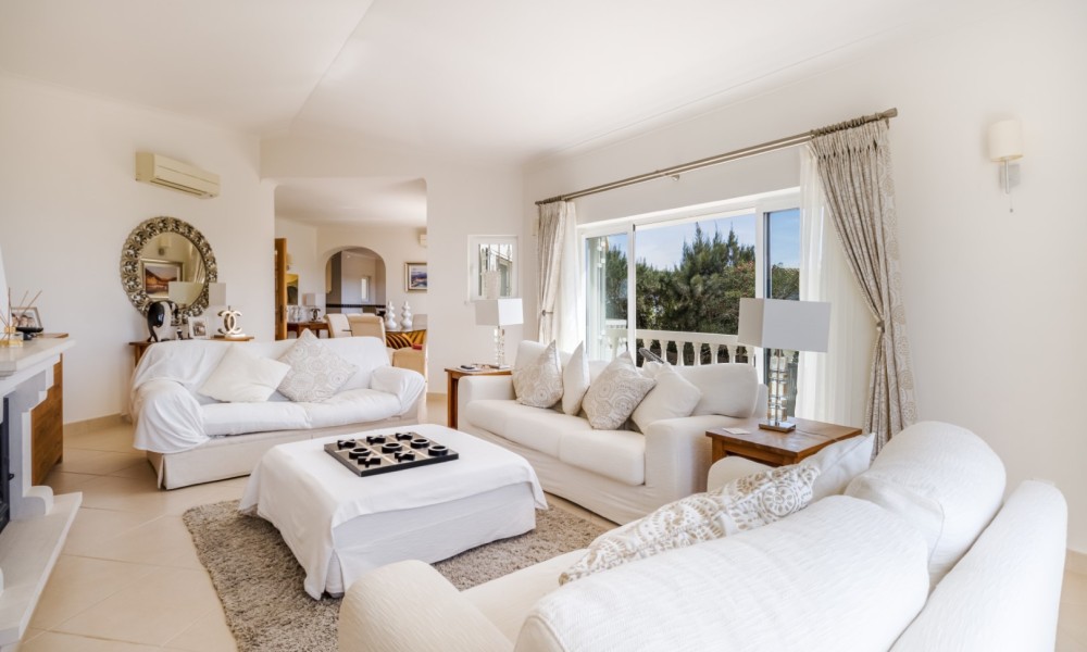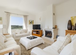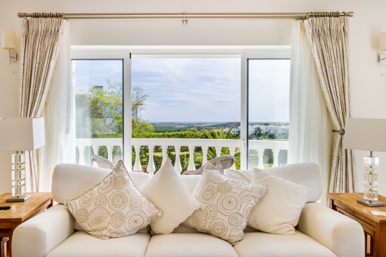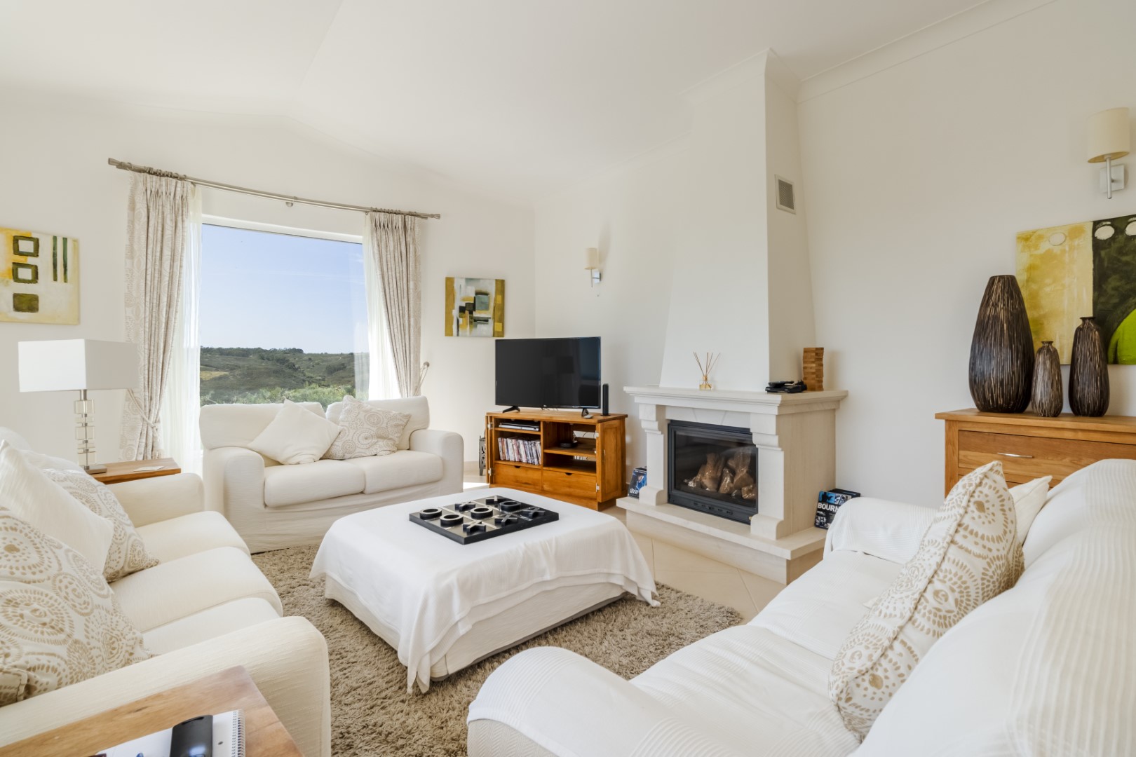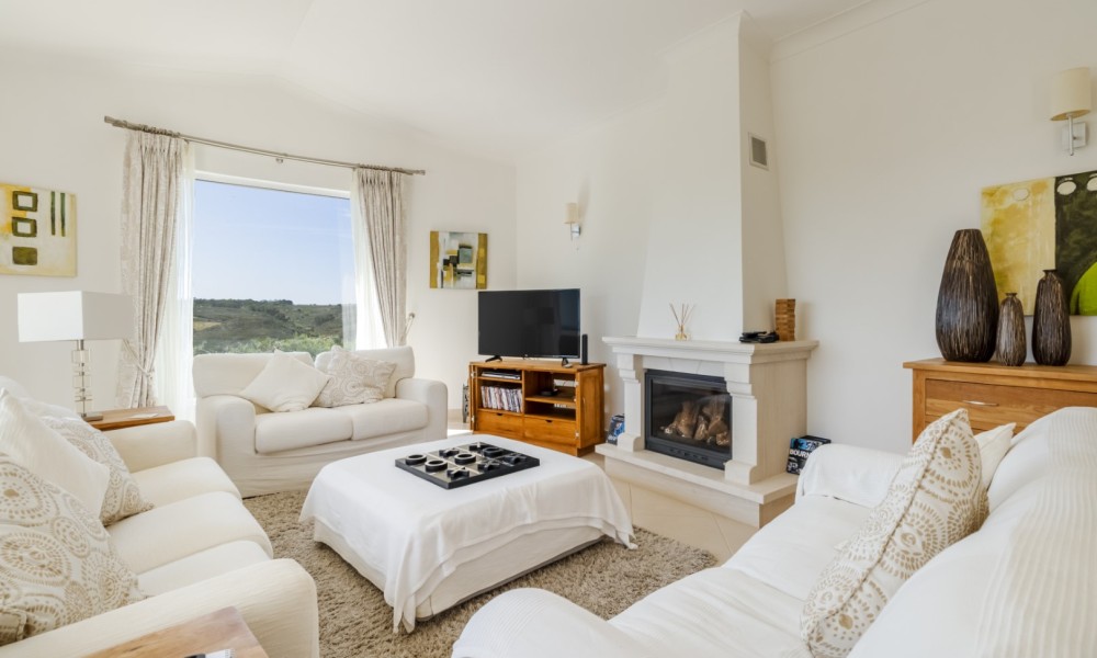 This beautiful luxury 3 bedroom villa is in a prime position on Parque da Floresta with fantastic panoramic countryside views, and to the sea beyond.Set on a good size plot, the villa is surrounded by beautifully landscaped gardens, with areas to enjoy the shade or relax in the sun.The accommodation is spread over two floors. From the ground level, split level stairs lead up to a large open plan living and dining room with built in fire, and windows that open out onto the stunning views from the outdoor terrace. The dining area leads through to a fully fitted designer kitchen with granite worktops and a breakfast bar, and access to the spacious outdoor dining and BBQ area, which is perfect for outdoor entertaining.