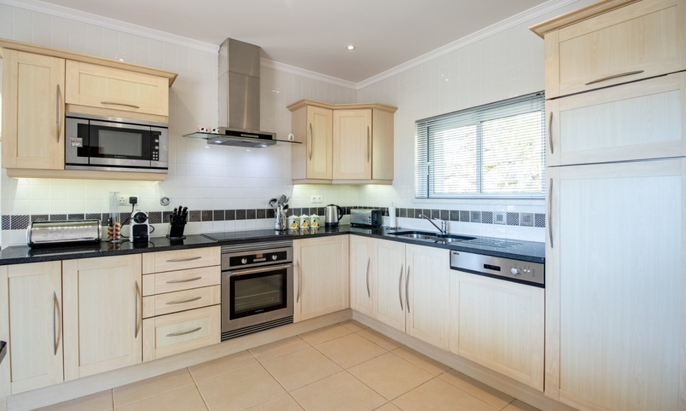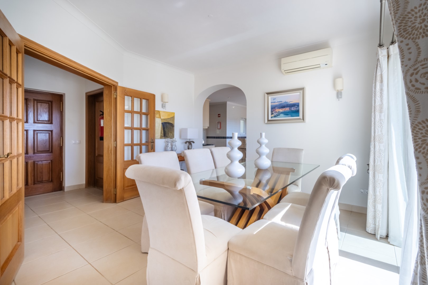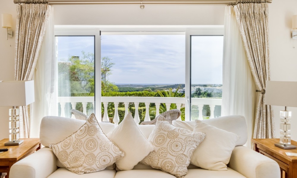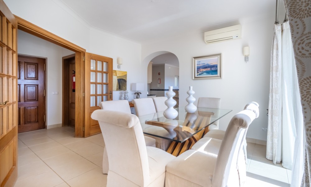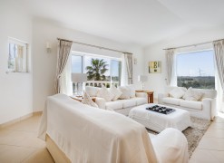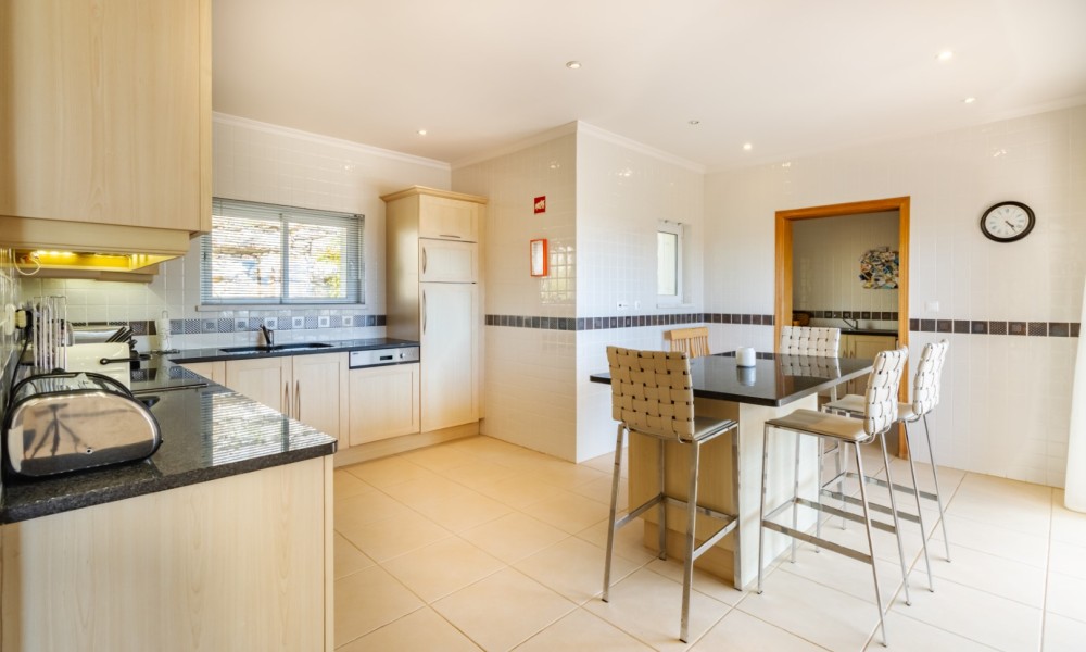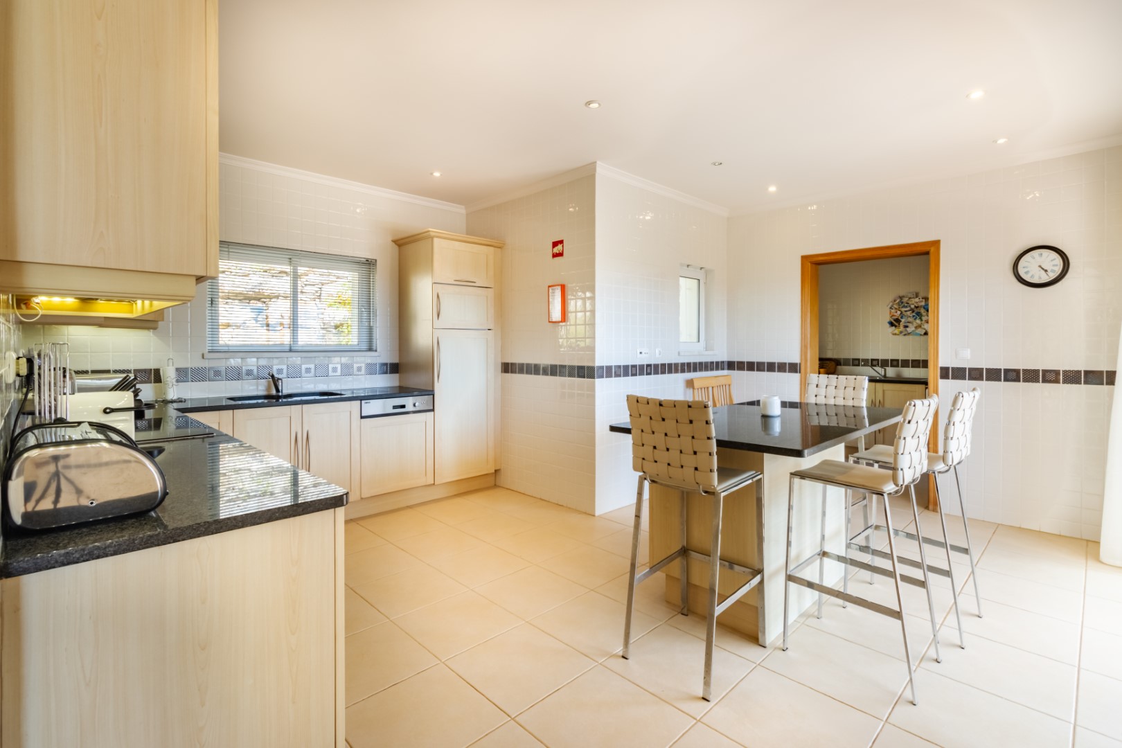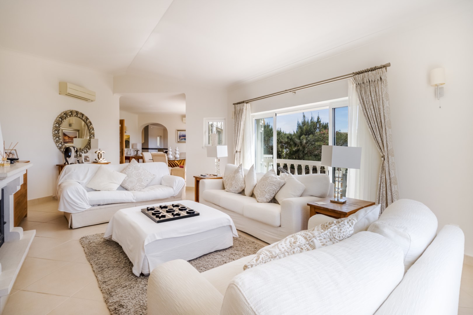 This beautiful luxury 3 bedroom villa is in a prime position on Parque da Floresta with fantastic panoramic countryside views, and to the sea beyond.Set on a good size plot, the villa is surrounded by beautifully landscaped gardens, with areas to enjoy the shade or relax in the sun.The accommodation is spread over two floors. From the ground level, split level stairs lead up to a large open plan living and dining room with built in fire, and windows that open out onto the stunning views from the outdoor terrace. The dining area leads through to a fully fitted designer kitchen with granite worktops and a breakfast bar, and access to the spacious outdoor dining and BBQ area, which is perfect for outdoor entertaining.